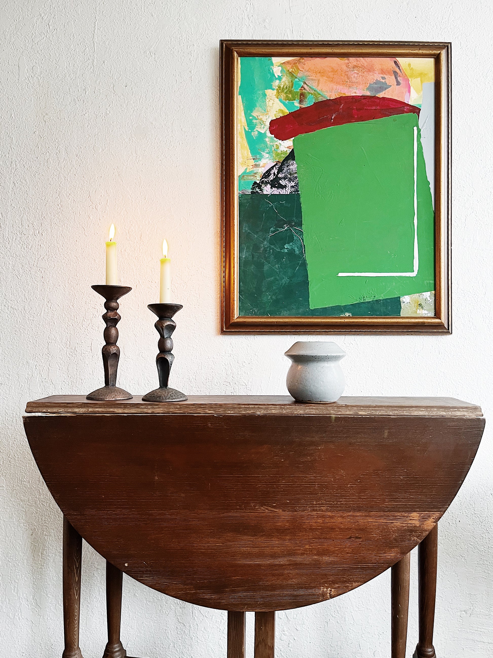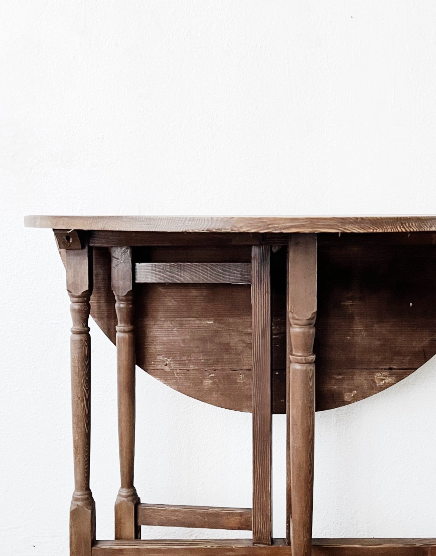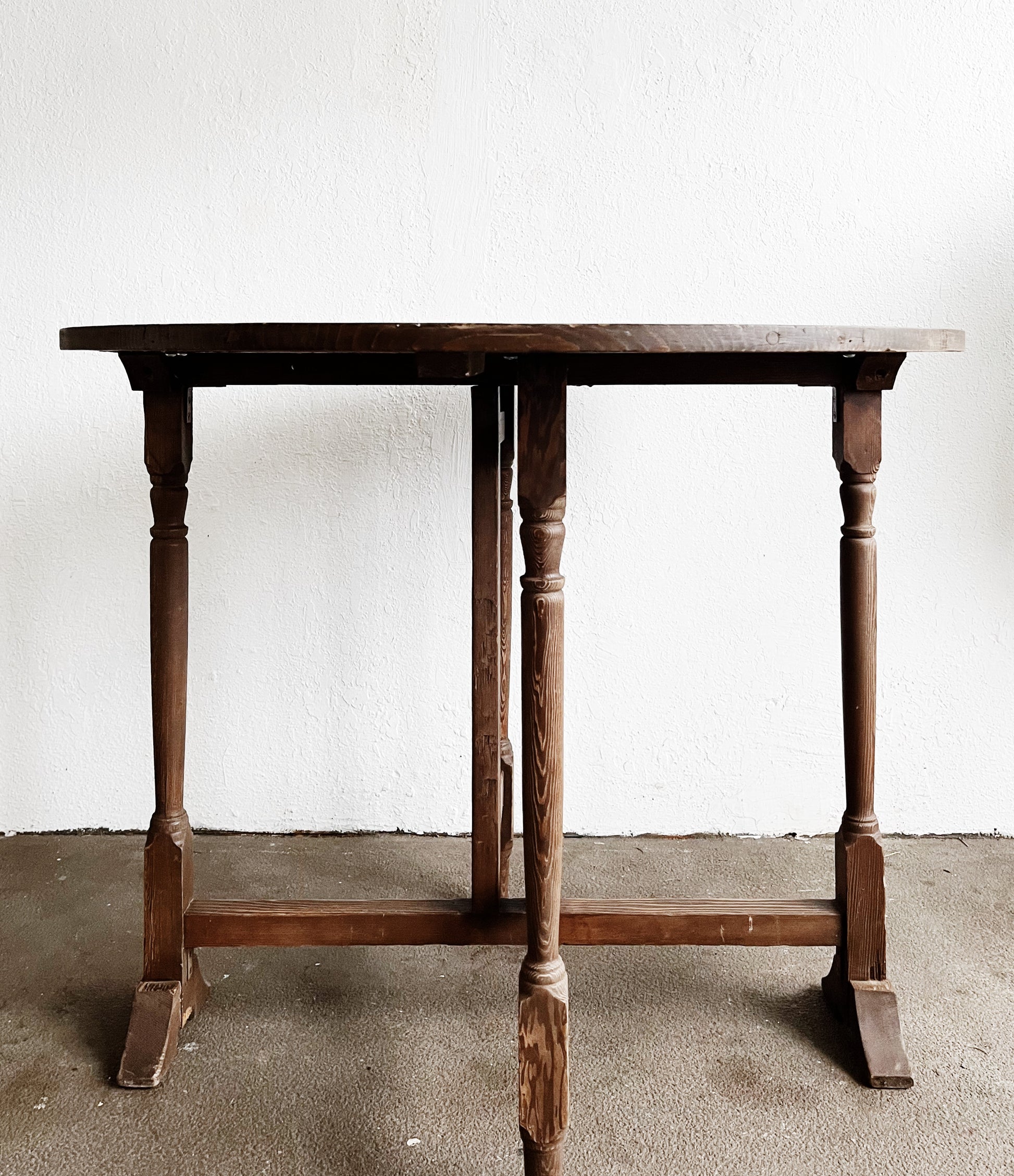 Lovely old round table with two drop leaves with gateleg supports. Opens to a round with variegated wood planks. One side alone can lower to create a demilune that makes a great desk for a small space. This table is very sturdy despite it’s age