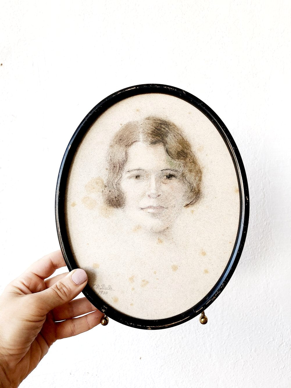 Beautiful ghostly portrait, hand drawn and signed in 1930. Comes in an old easel back wood frame
