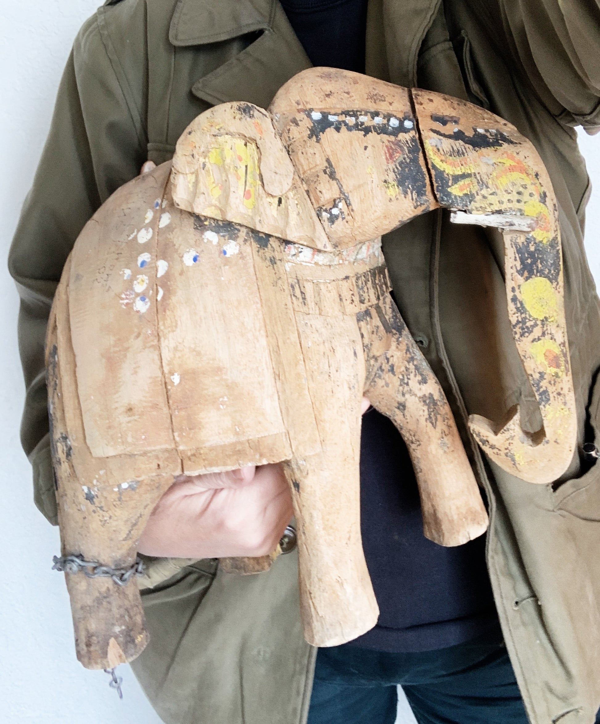 Stunning antique hand painted solid wood elephant likely from India. Details include age cracks in the wood, chain around one leg that likely attached to another piece, and hand writing on one side. Such a treasure, solid wood and weighty. Larger size at 13.5x12”