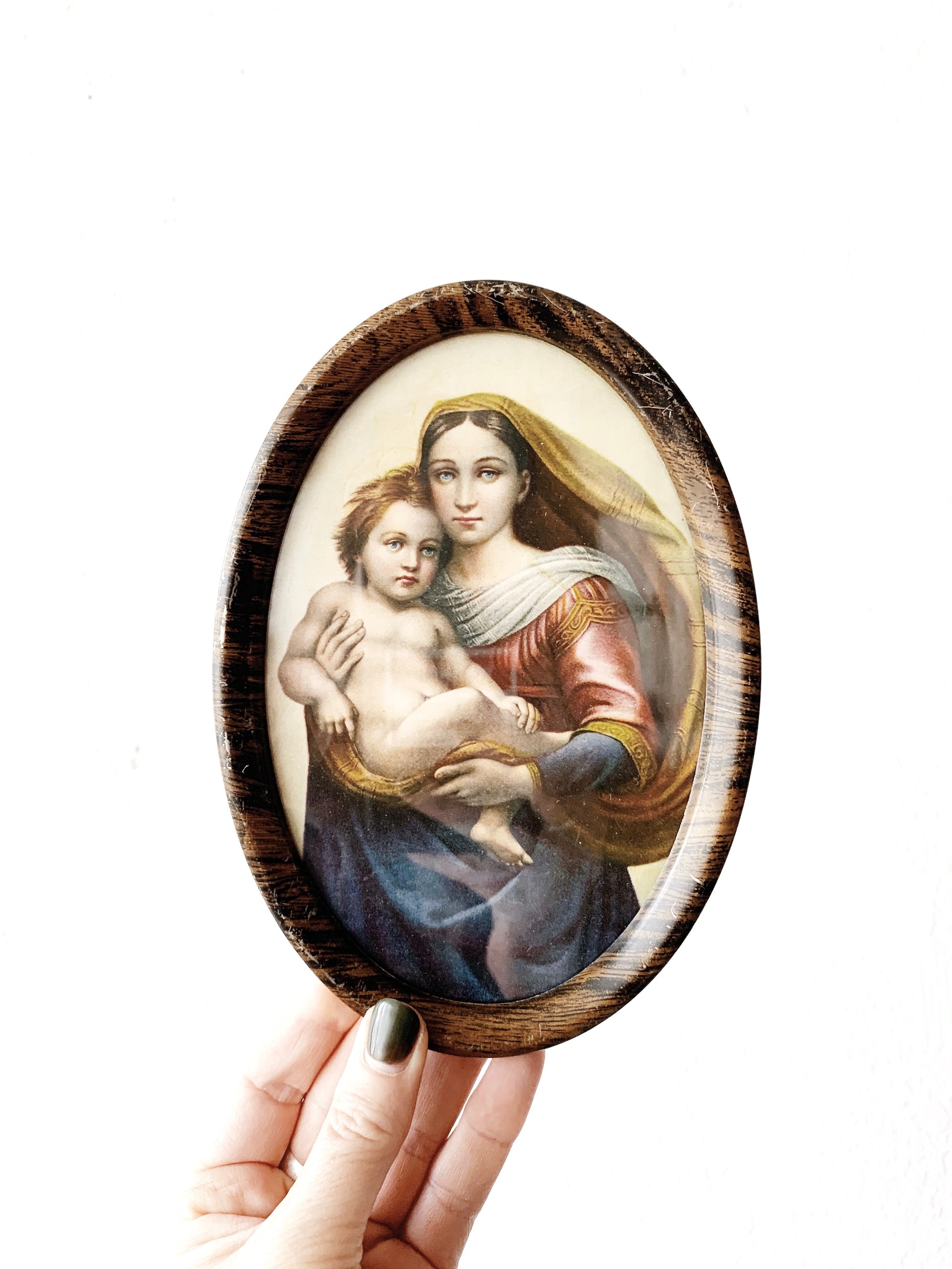 wonderful antique Madonna and child hand tint frame. Framed under glass in an antique oval metal frame with hanger on back.