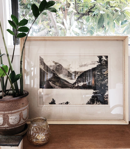 The majestic northern cascade range depicted in a hand tinted original artwork. The overall look is warm ivory and grey with touches of color popping in. One of the prettiest we’ve found. Framed in wood under glass