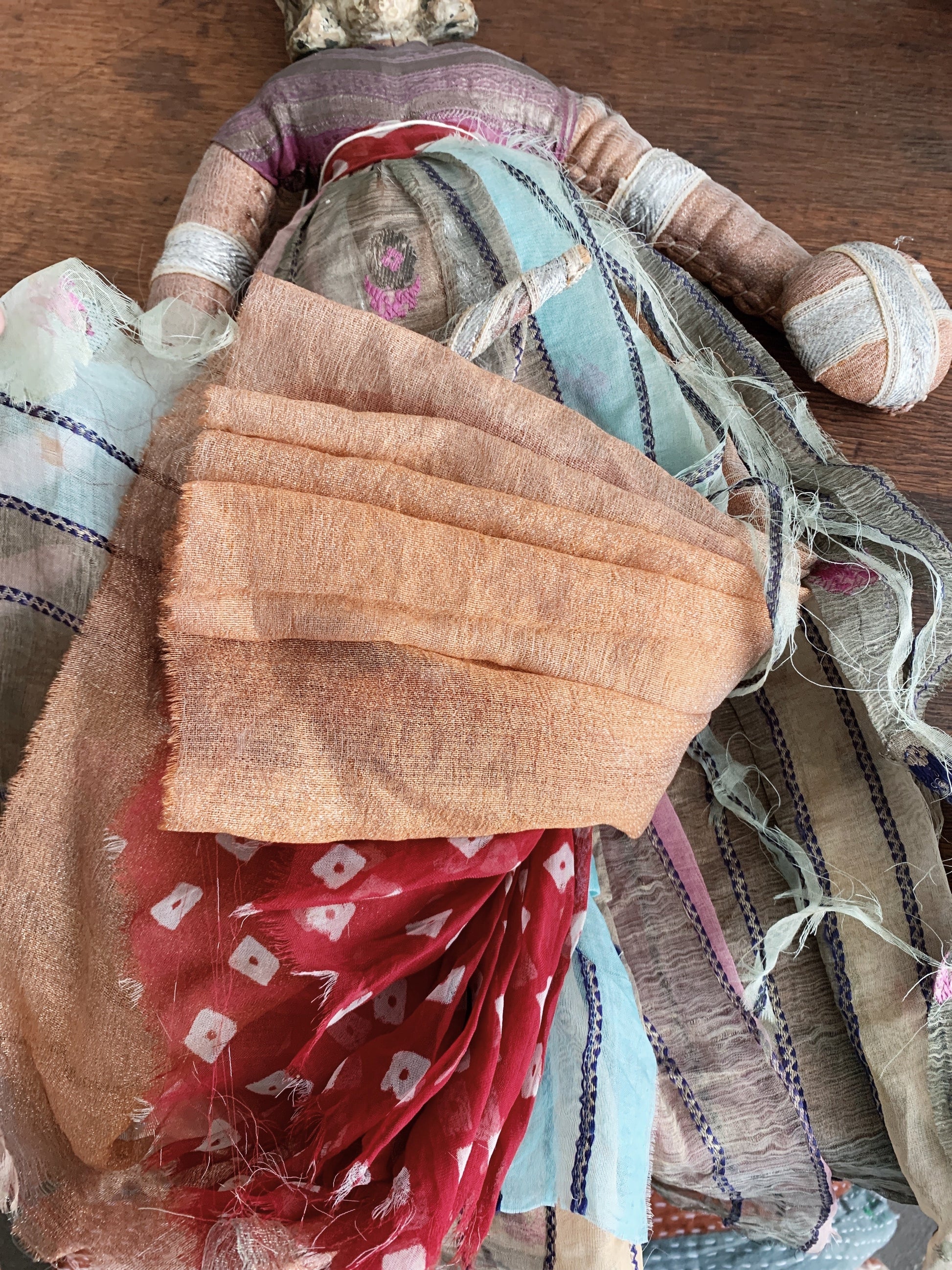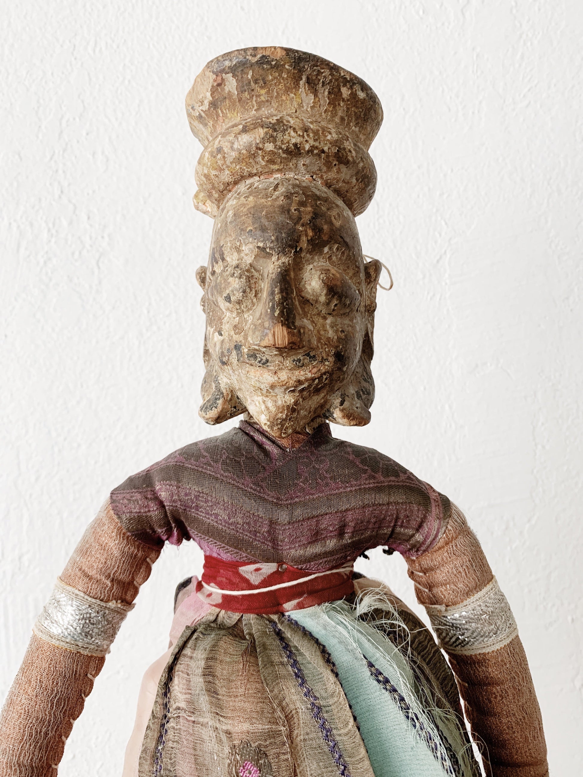 Stunning antique handmade puppet with layered silk robes and carved wood head. We are unsure of its origins but believe it to be from India or Morroco.