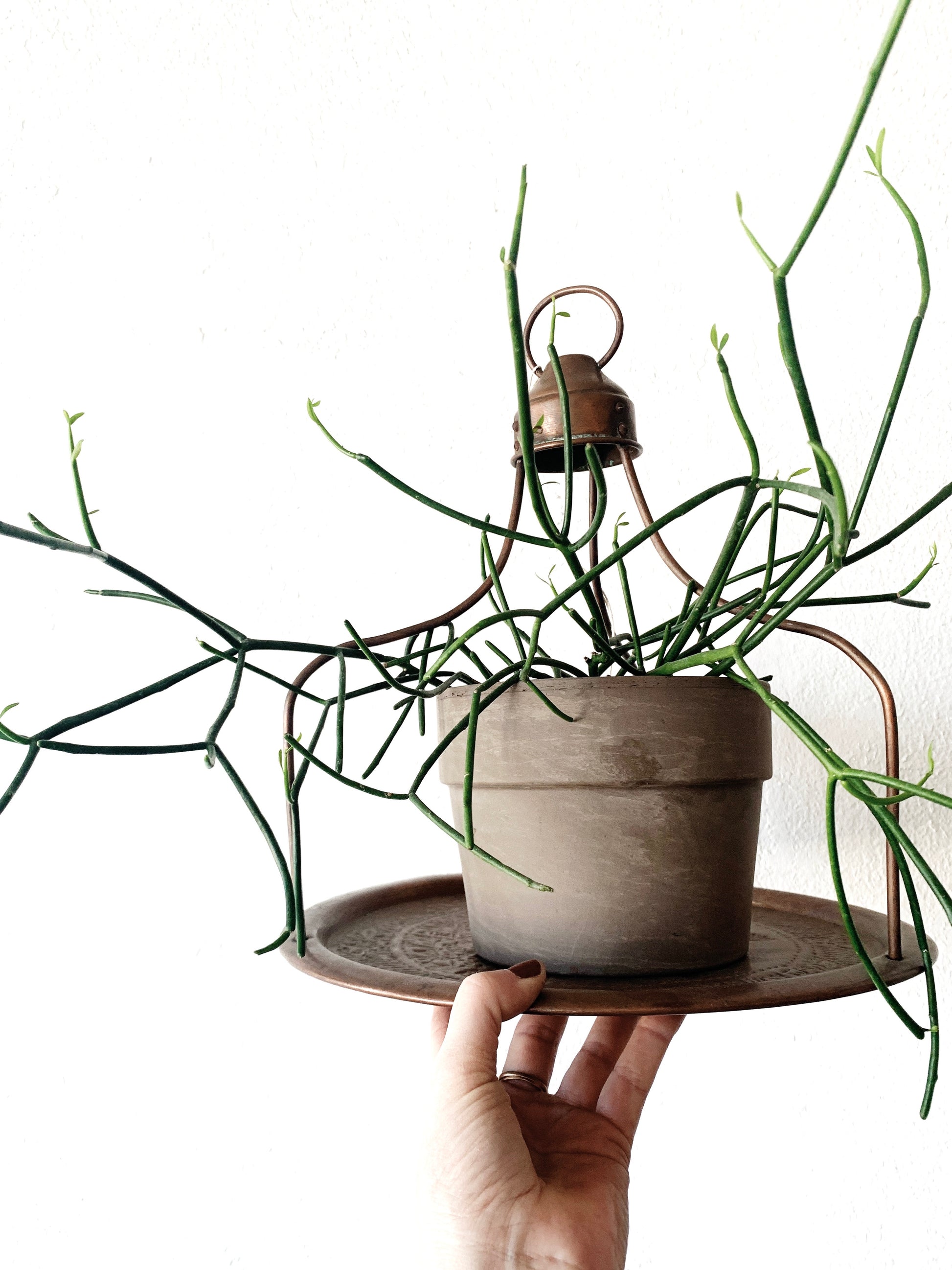Hammered antique hanging copper tray with lovely aged patina. From Indonesia. These were originally used as serving trays, we like it for holding a plant, or certainly use it for its intended purpose! It’s beautiful.