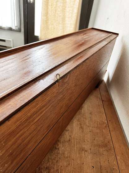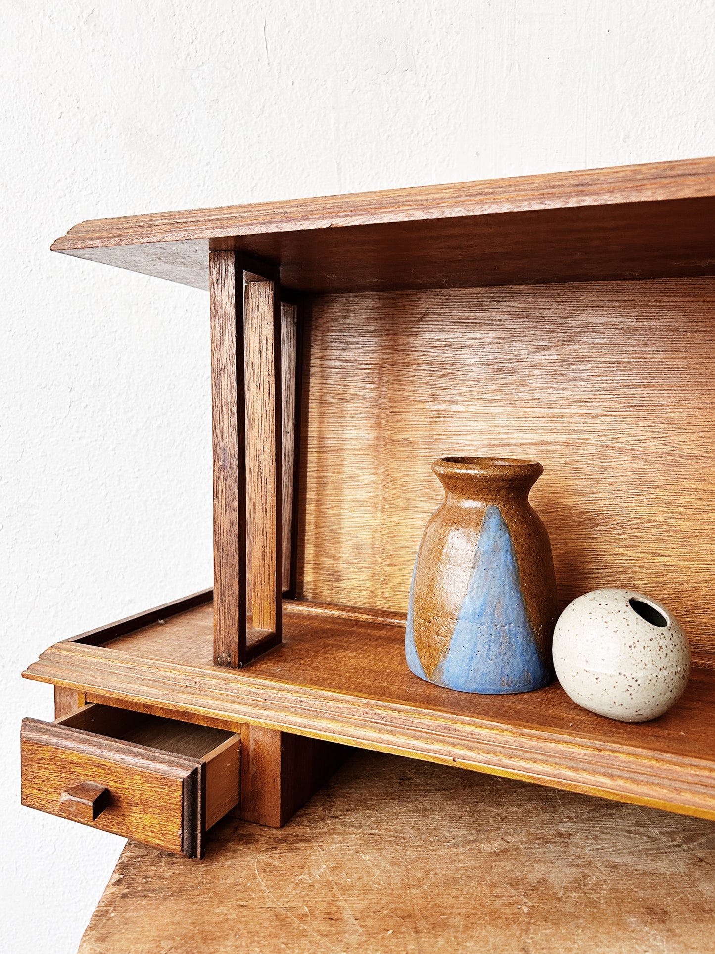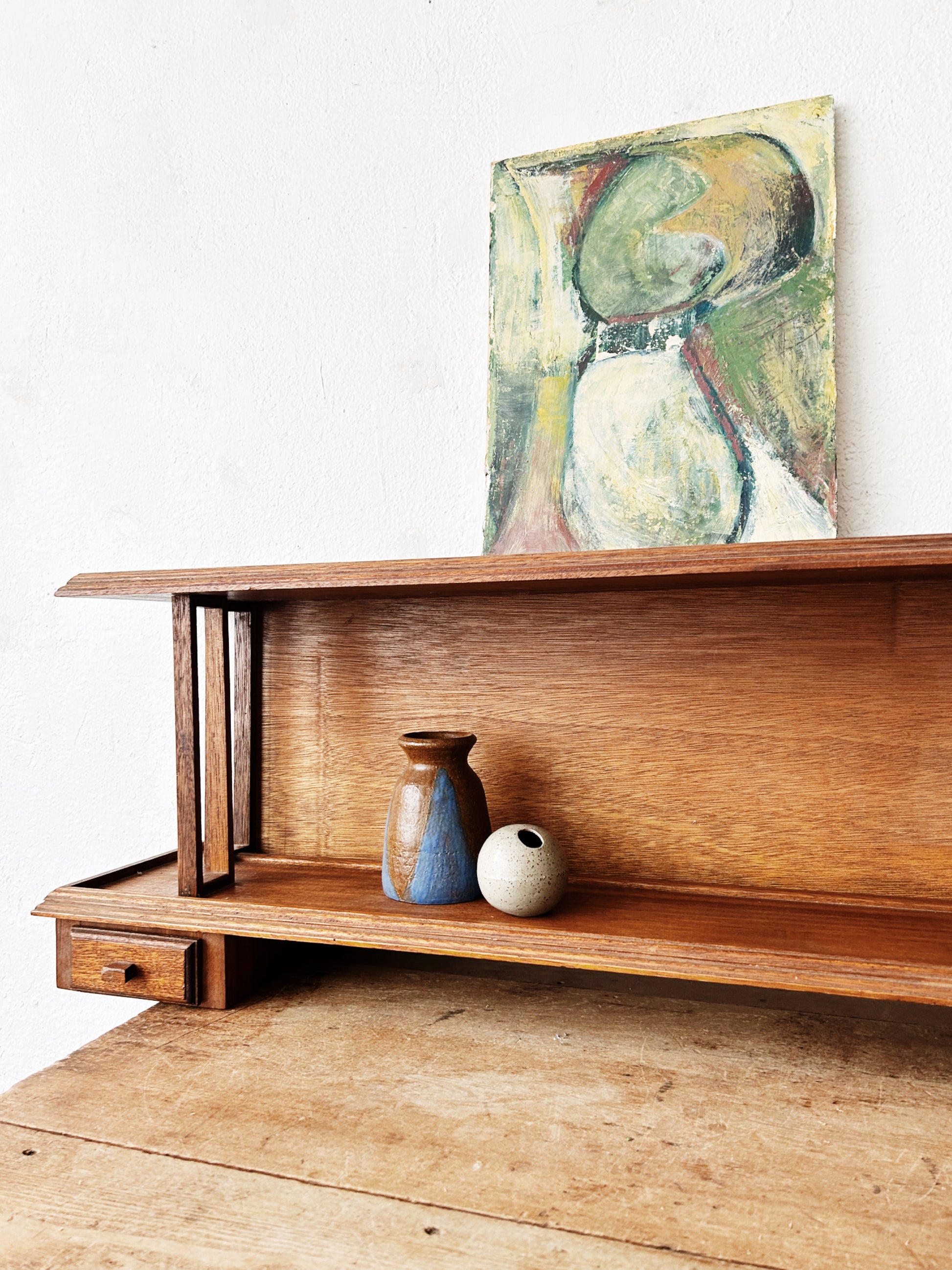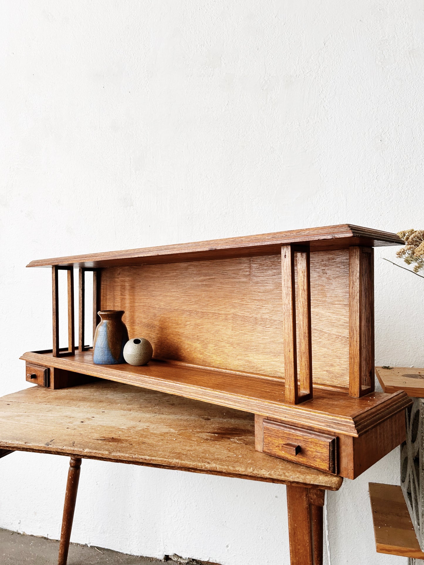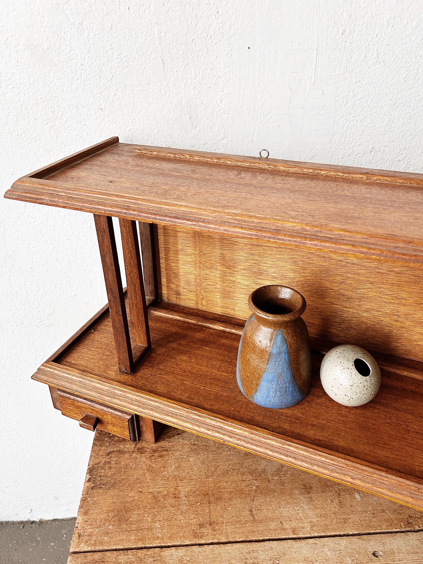 Gorgeous antique hanging shelf in the craftsman/ arts and crafts style. Beautiful details, including two little drawers, brass loop hangers, and angular cutout side detail. The uses we see: entryway over a console table, mantle for a small home fireplace, in the kitchen for spices and pottery collection😍 Love it. In beautiful condition
