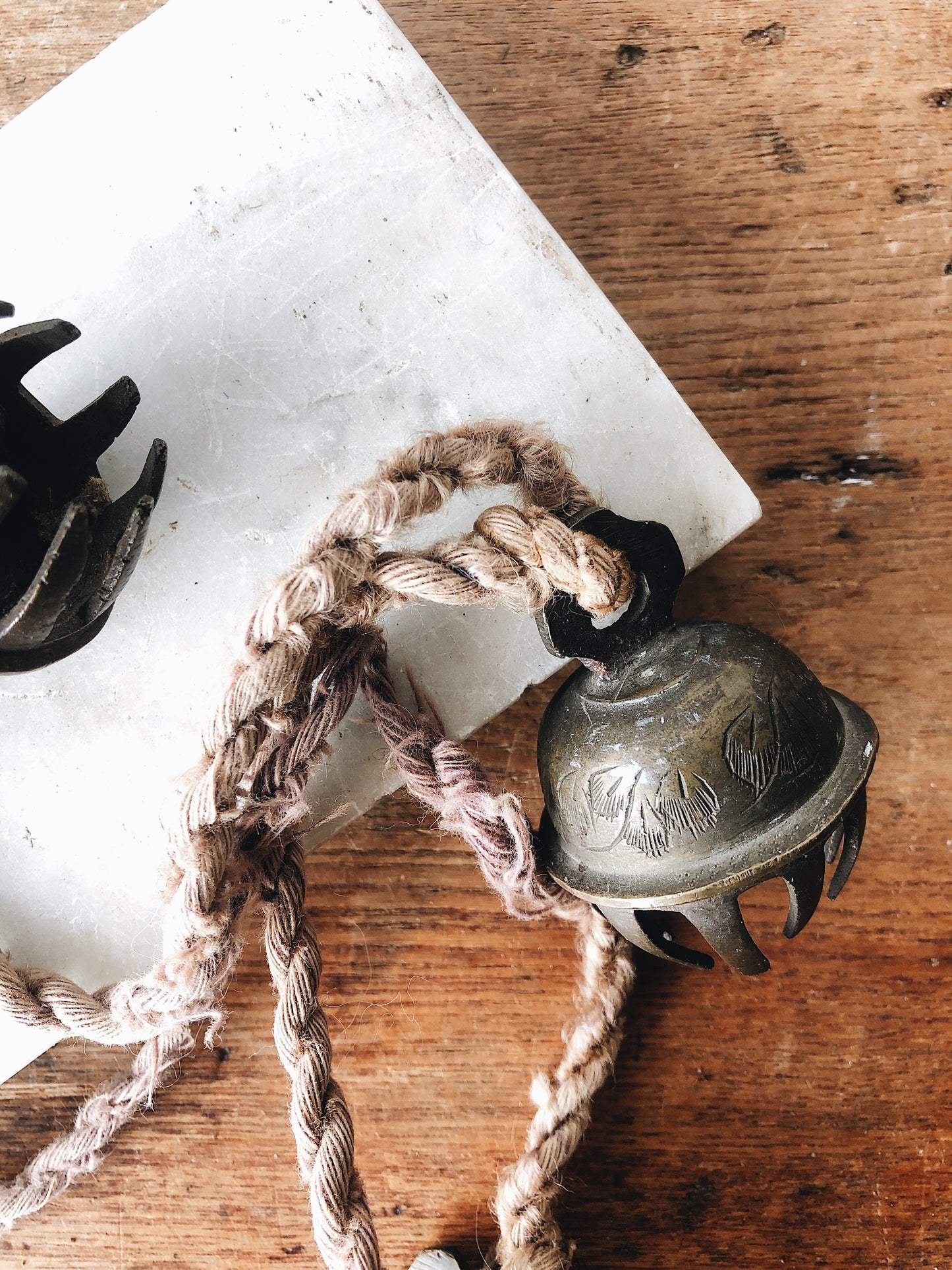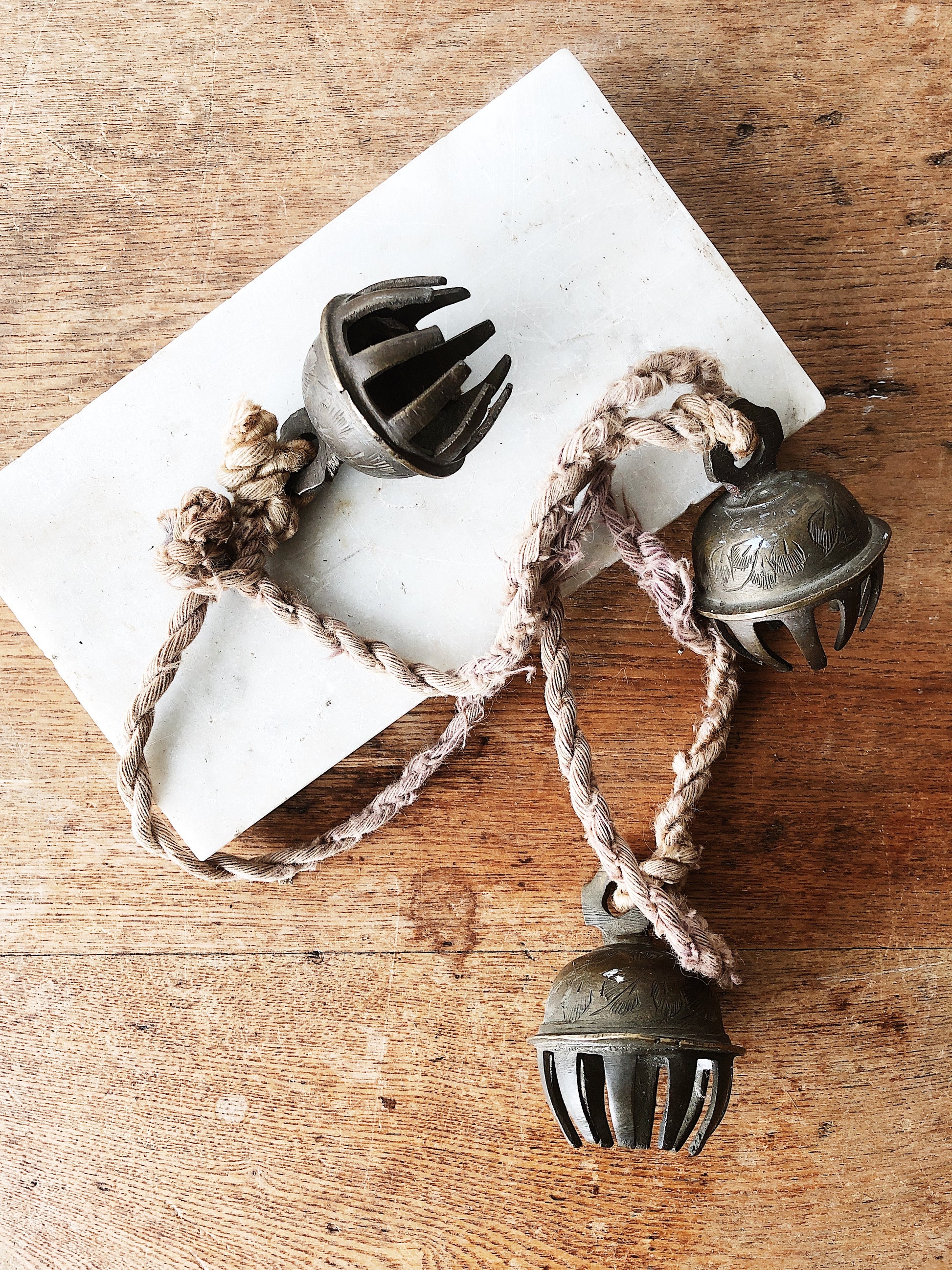 Wonderfully old, this strand of aged brass temple bells from India make the sweetest sound. Strung on old vegetable dyed silk roping