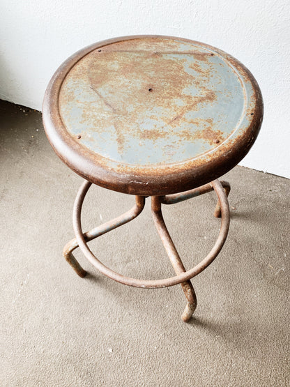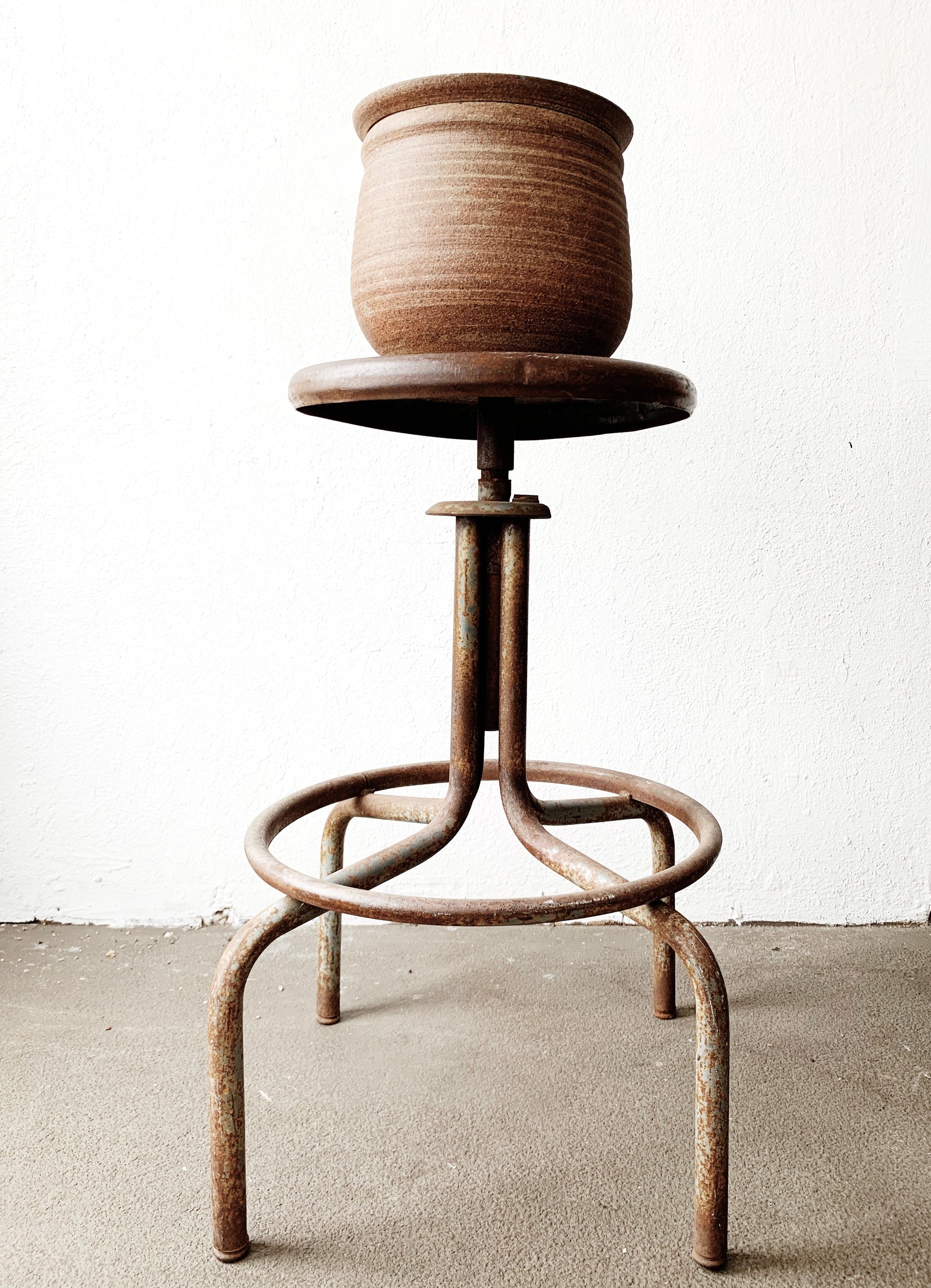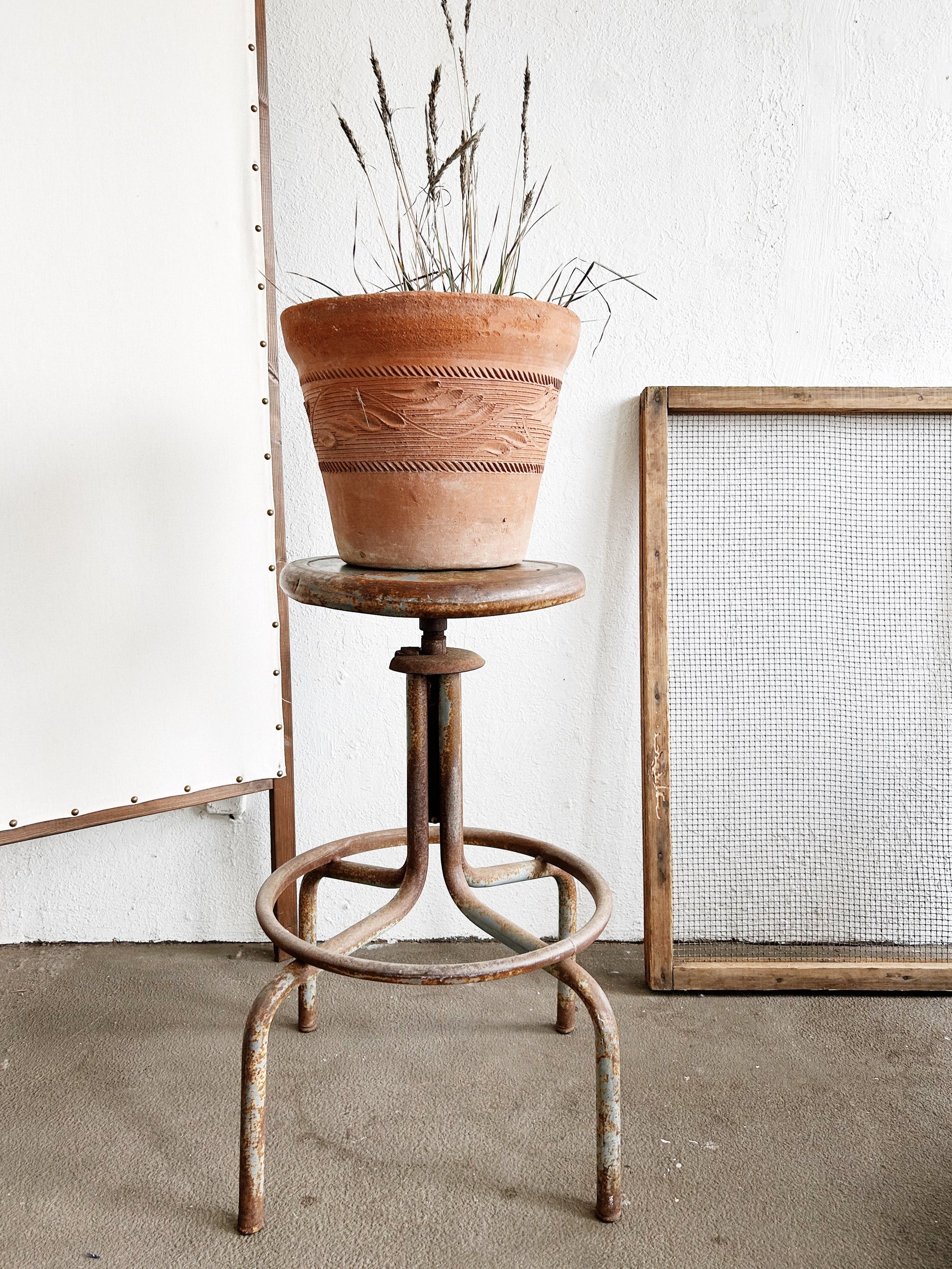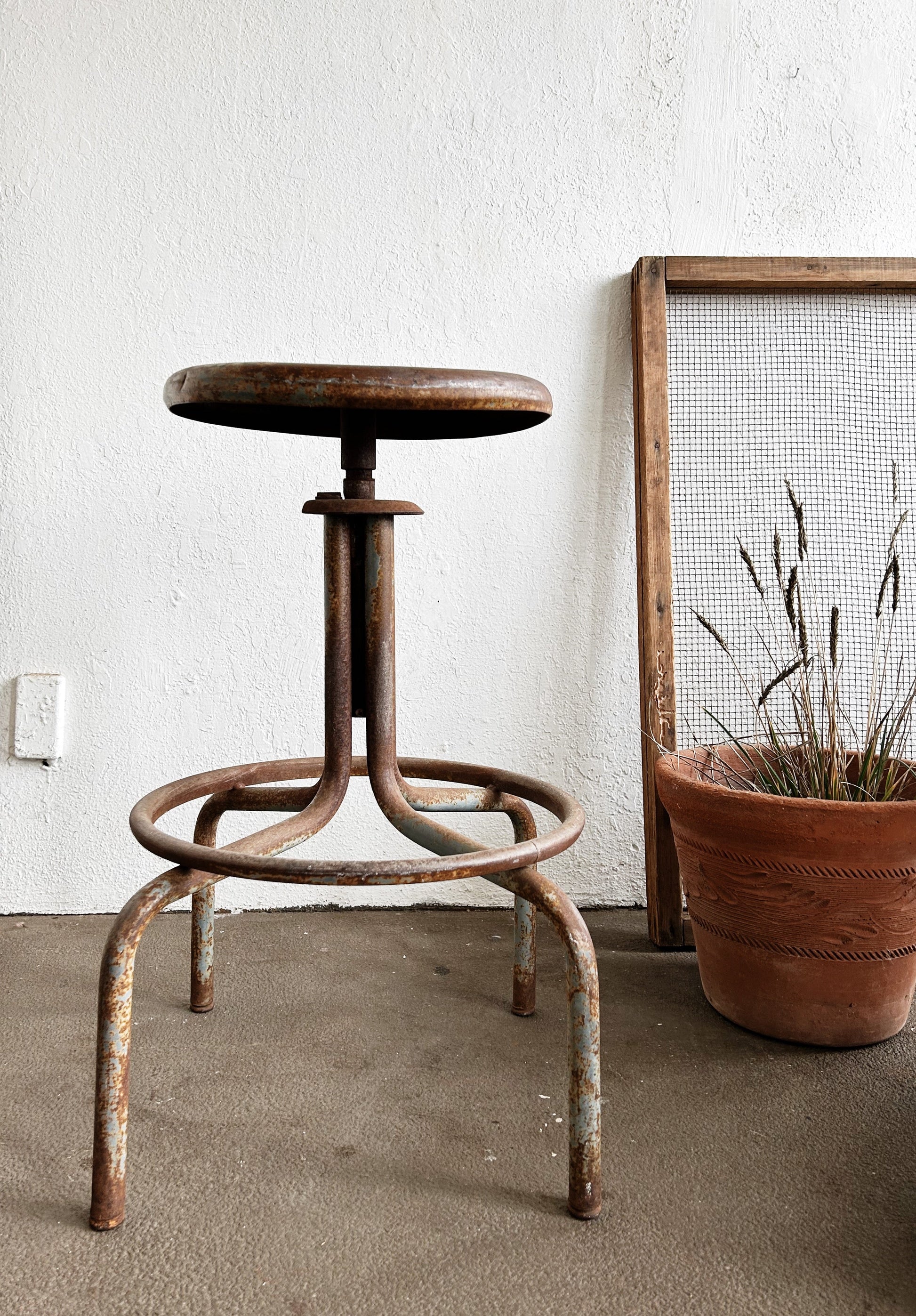 A great old industrial stool with the best patina. Love this style with the footrest. Totally usable to sit on or use as a plant stand etc. The seat is not adjustable.