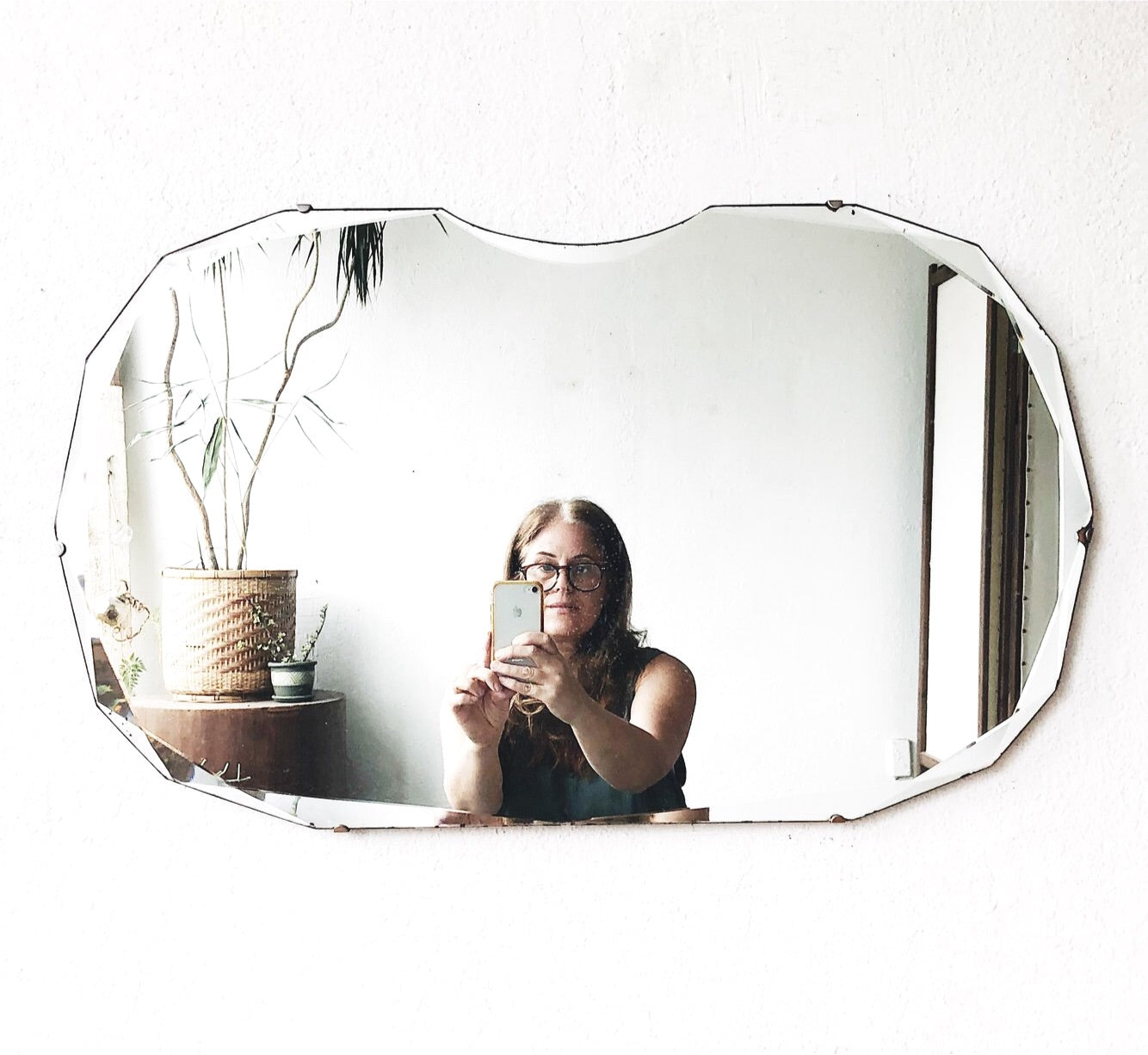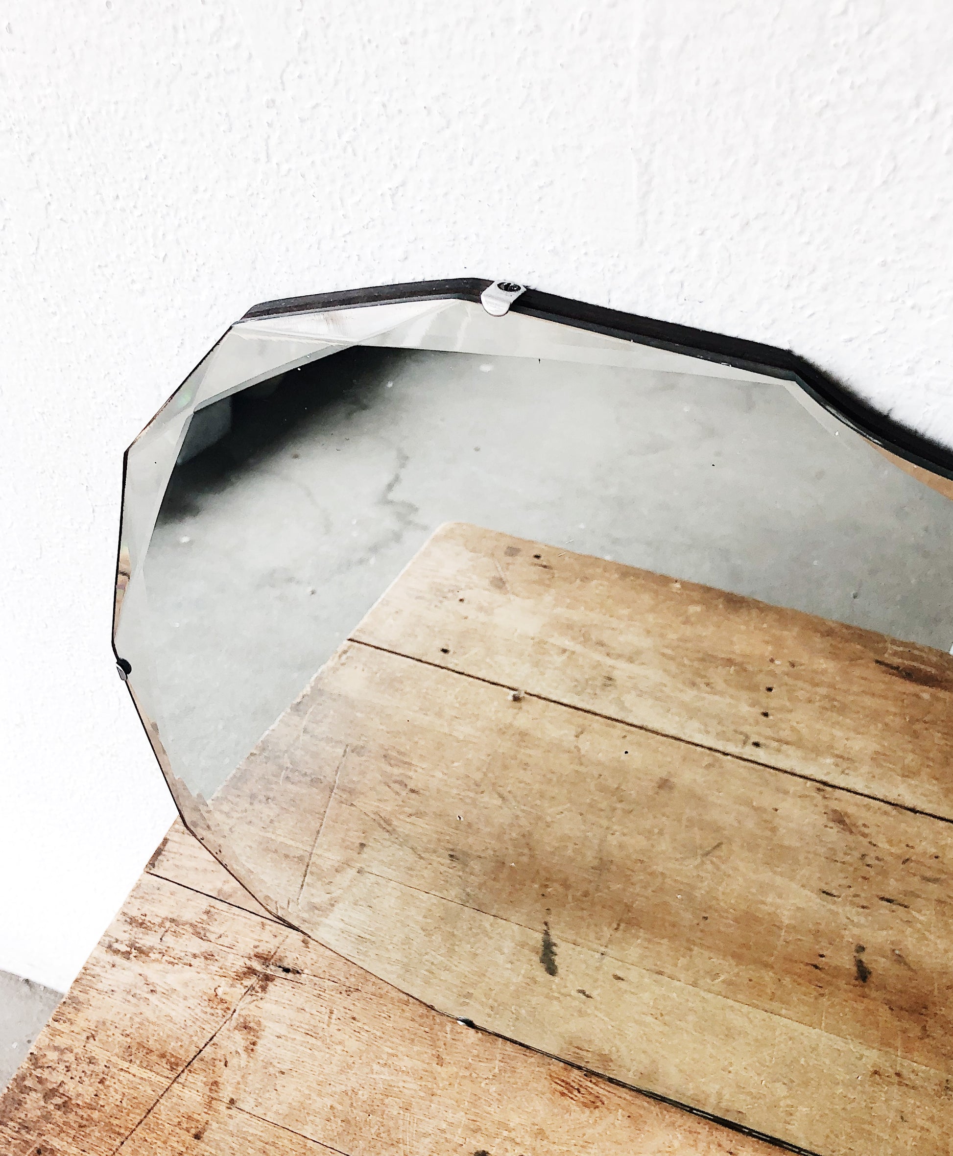Beautiful kidney shaped frameless mirror. The multi bevel edging is lovely. Wood backed with hanger. Glass is mostly clear with just a very slight clouding from age