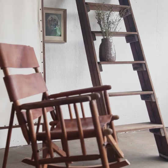 Large and beefy antique ladder. The angle and step size make this a perfect shelf. Sturdy and weighty. The only thing rustic is the finish, otherwise in excellent structural condition