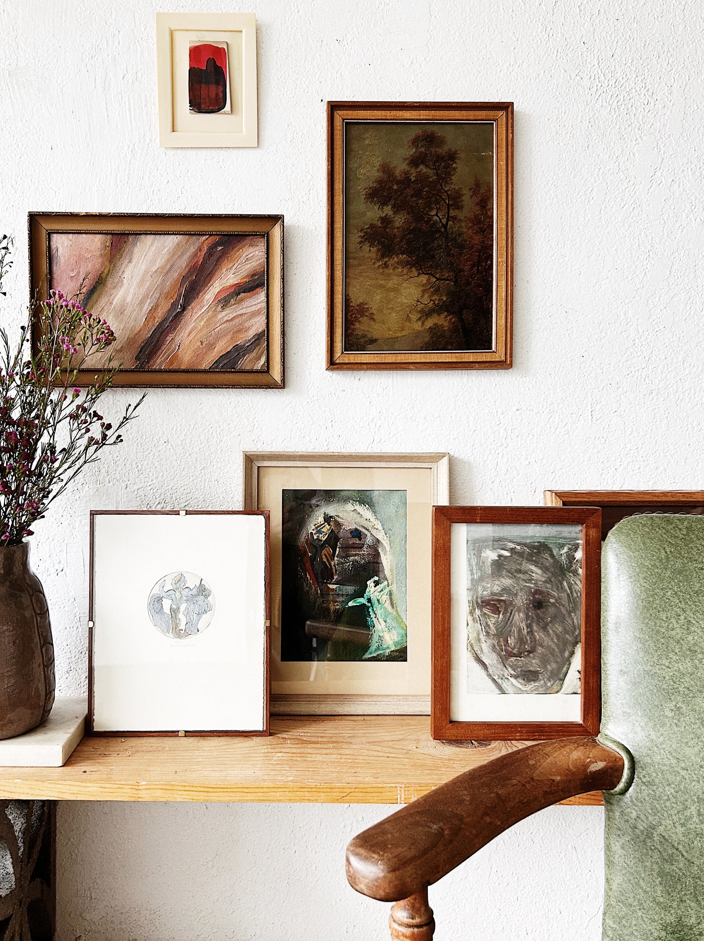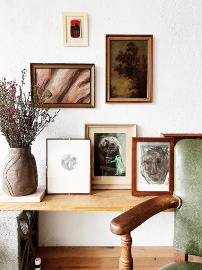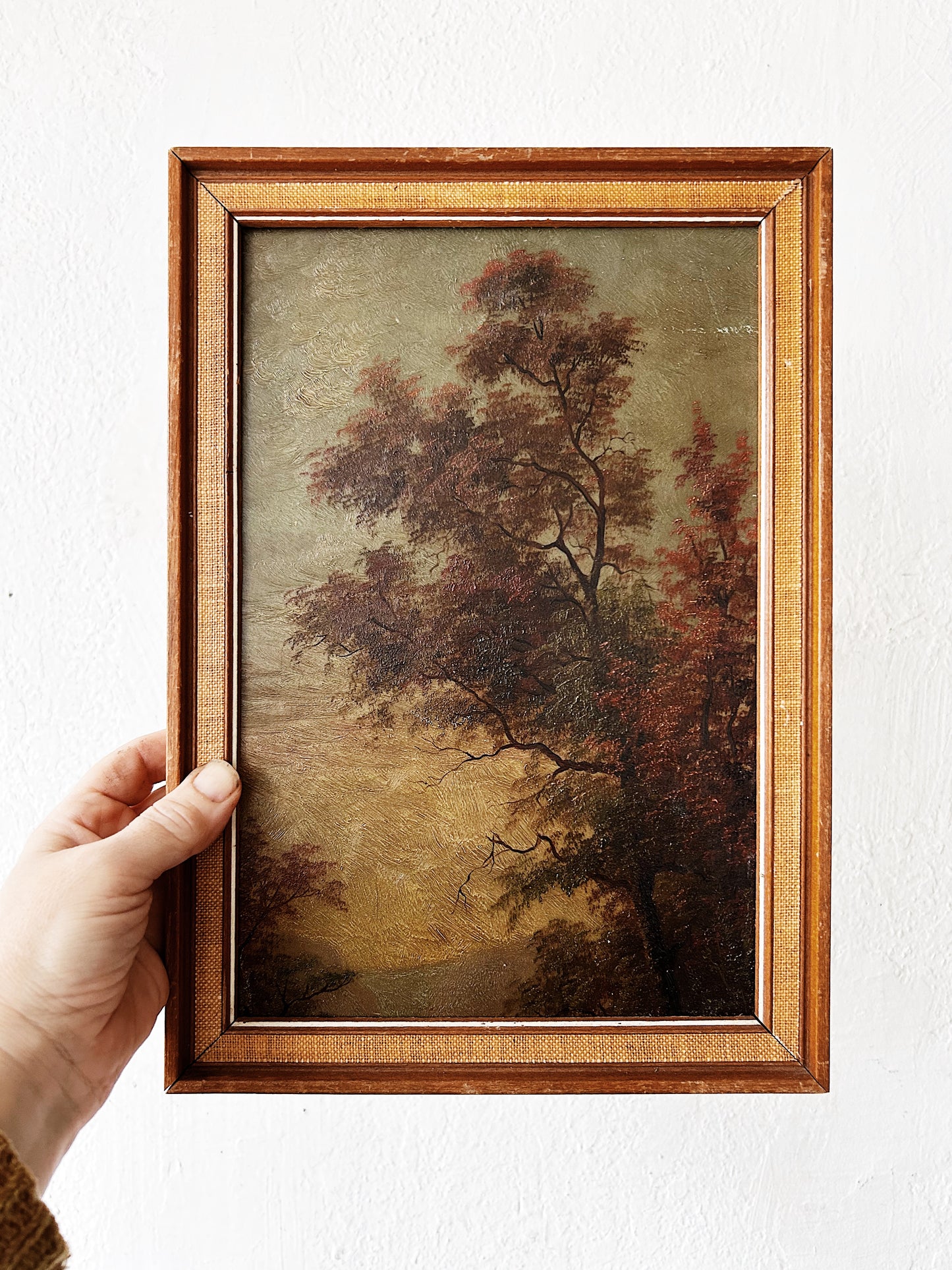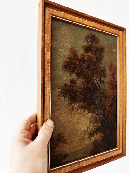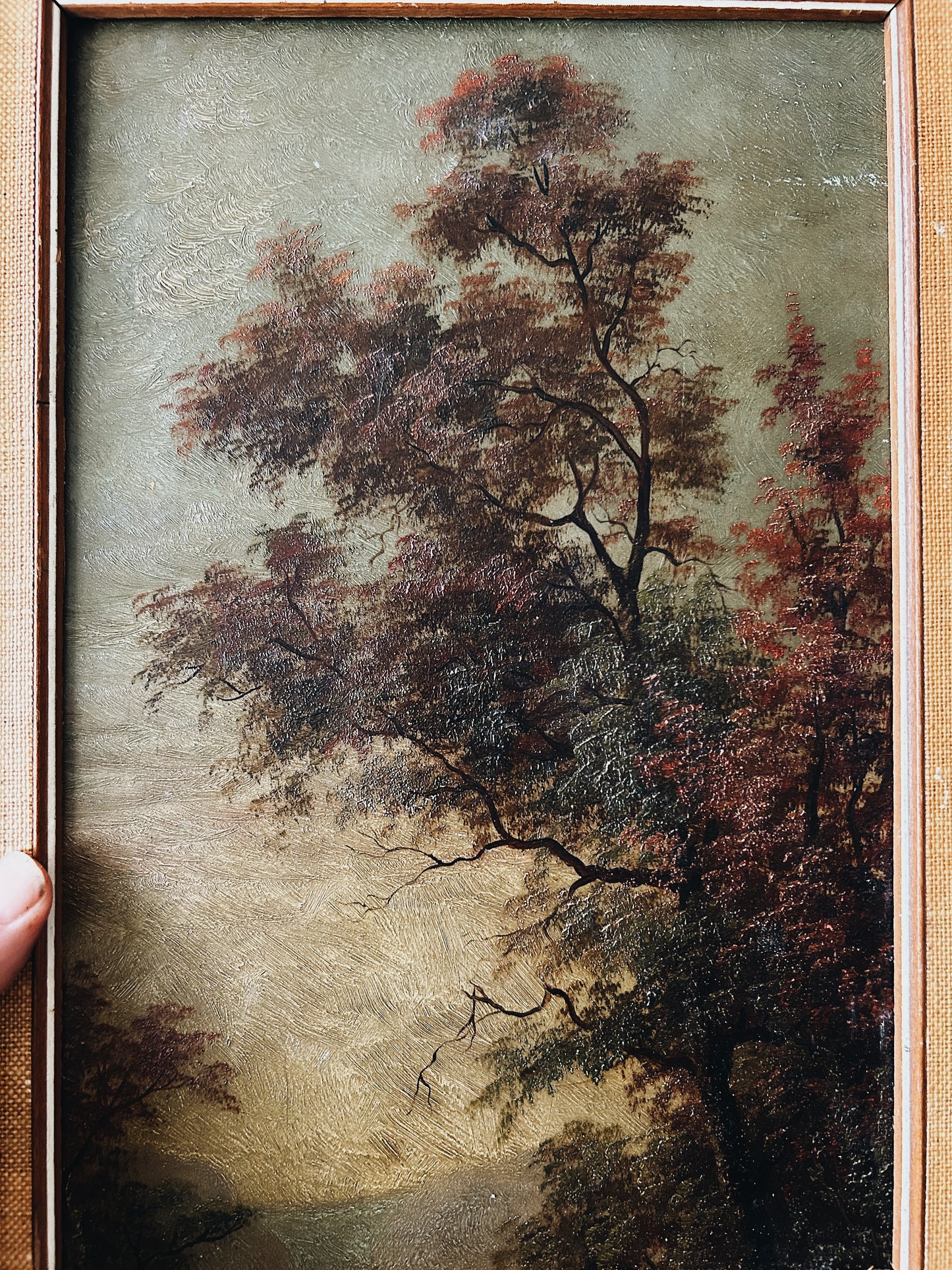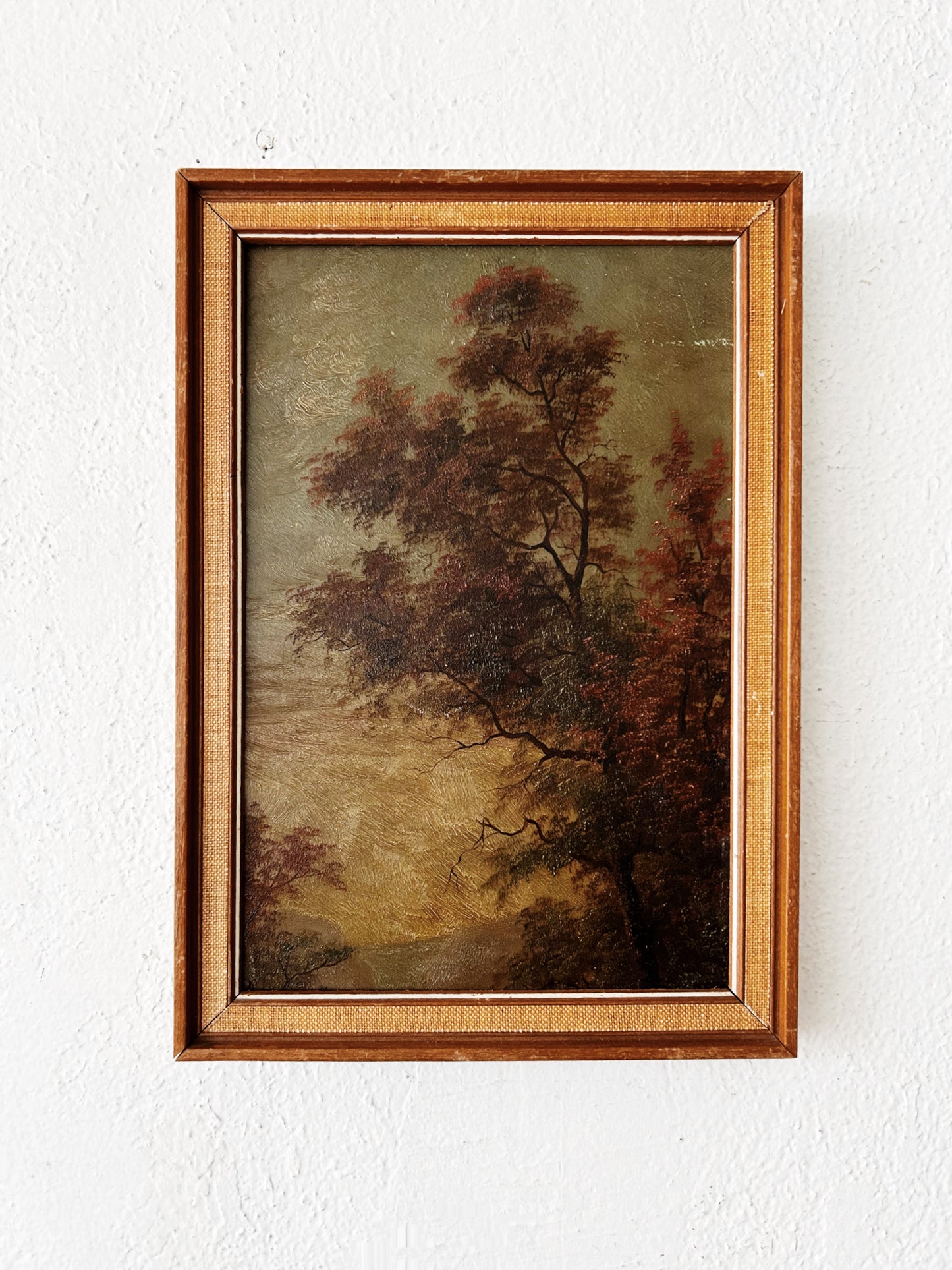 Moody antique landscape of treetops. The chiaroscuro is lovely. Bits of light illuminate the colors of the tree leaves. Delicately painted. Oil on board. Framed in vintage wood with a linen border