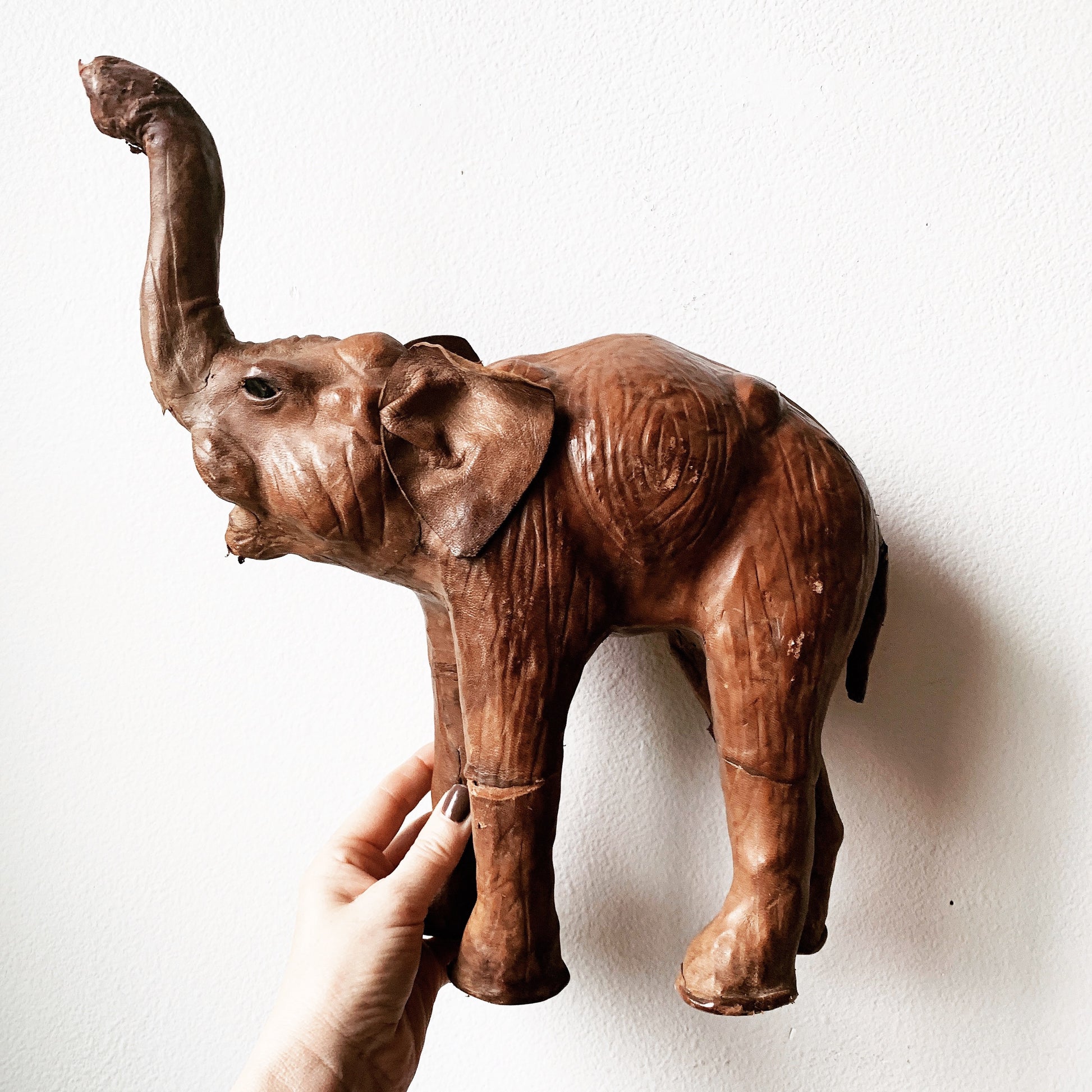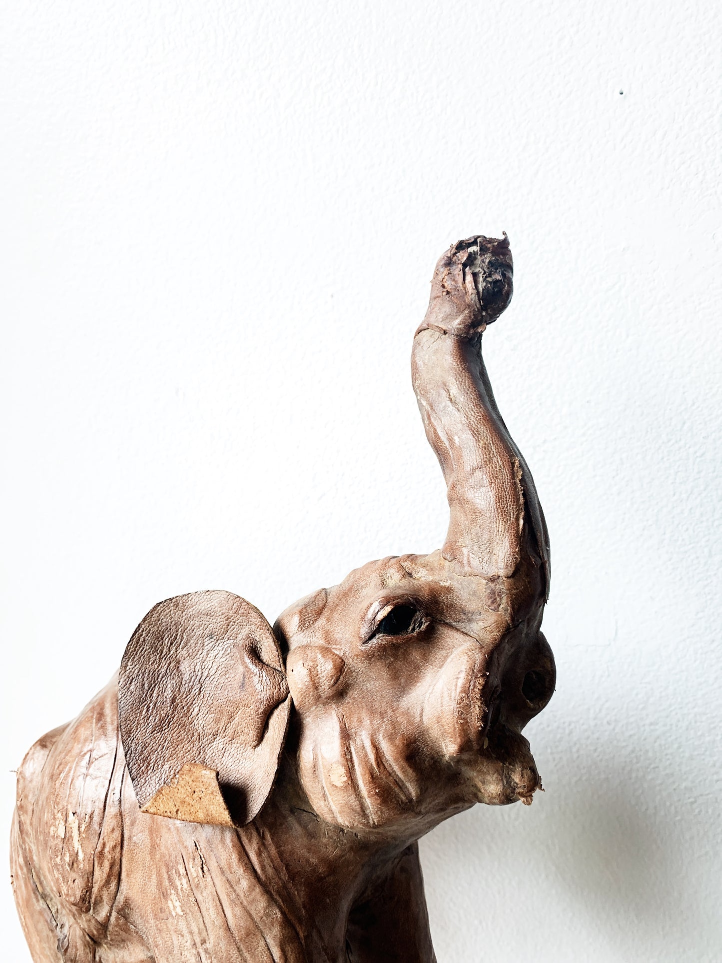 Amazing antique leather elephant with lucky up turned trunk. Not perfect! Dings and missing tusks, trunk tip has seen better days. BUT, so so lovely just the same.