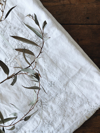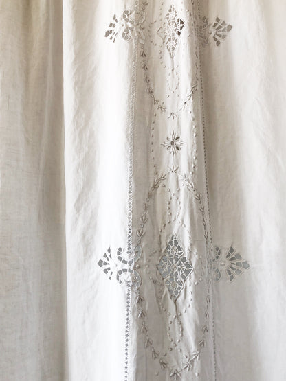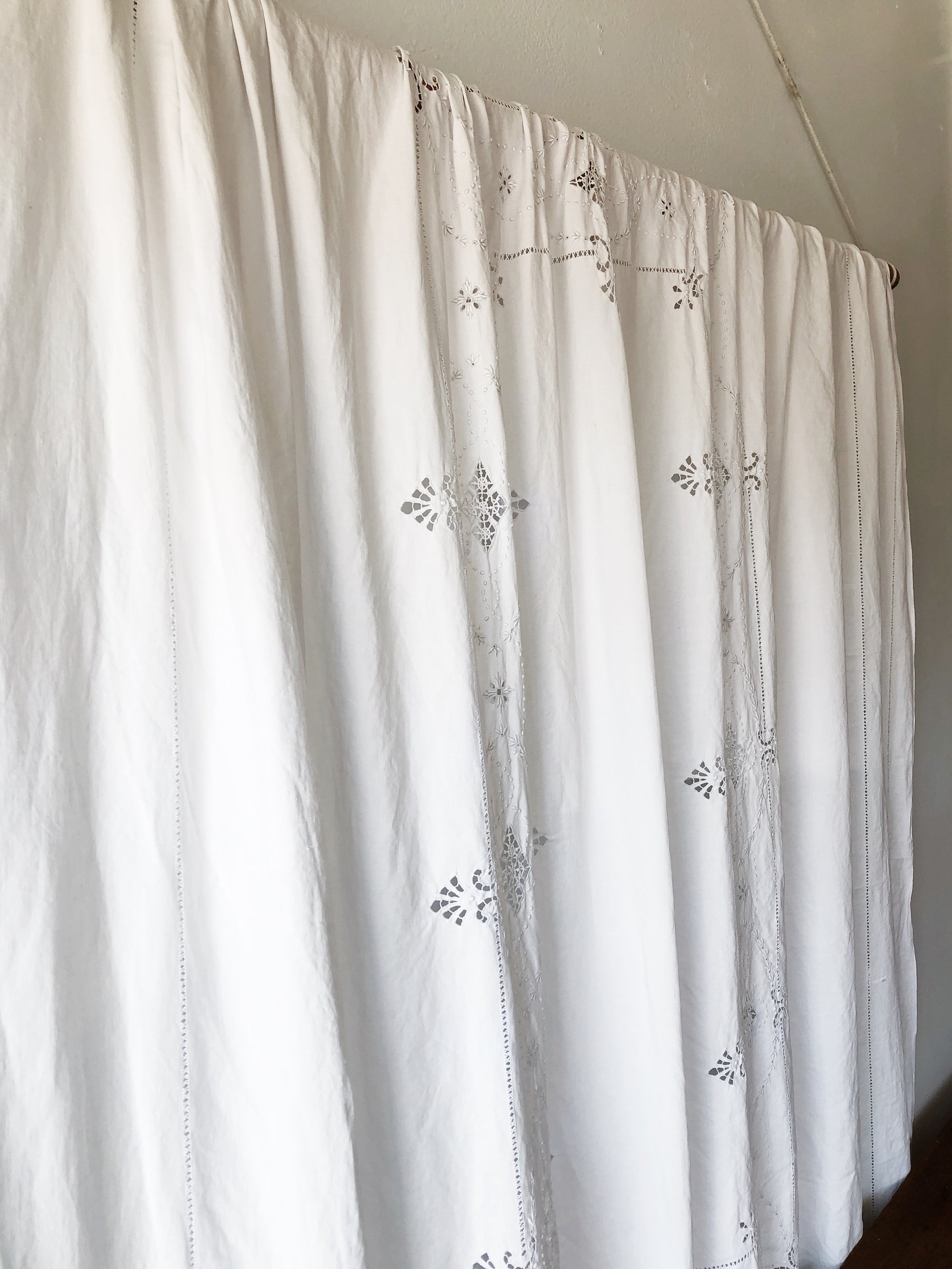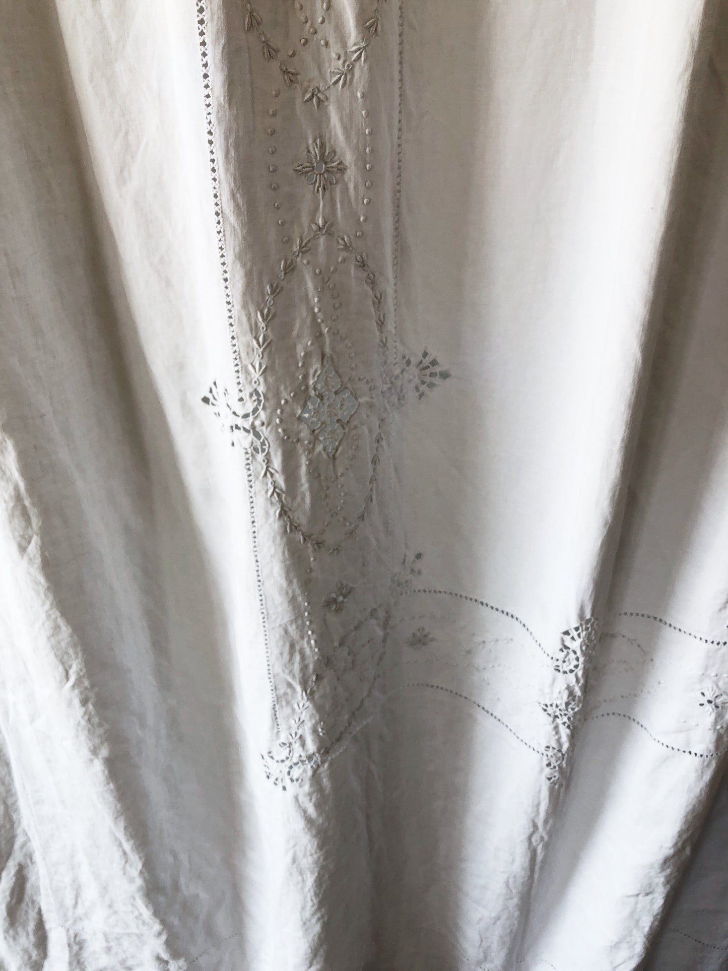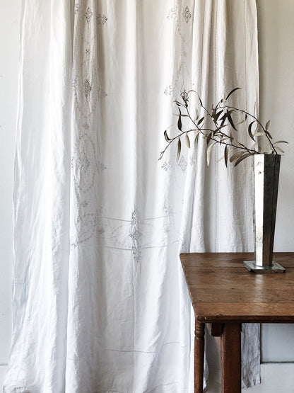 Antique linen embroidered coverlet that we love to use as a large curtain. Fits a double or full bed or big window, French door or closet