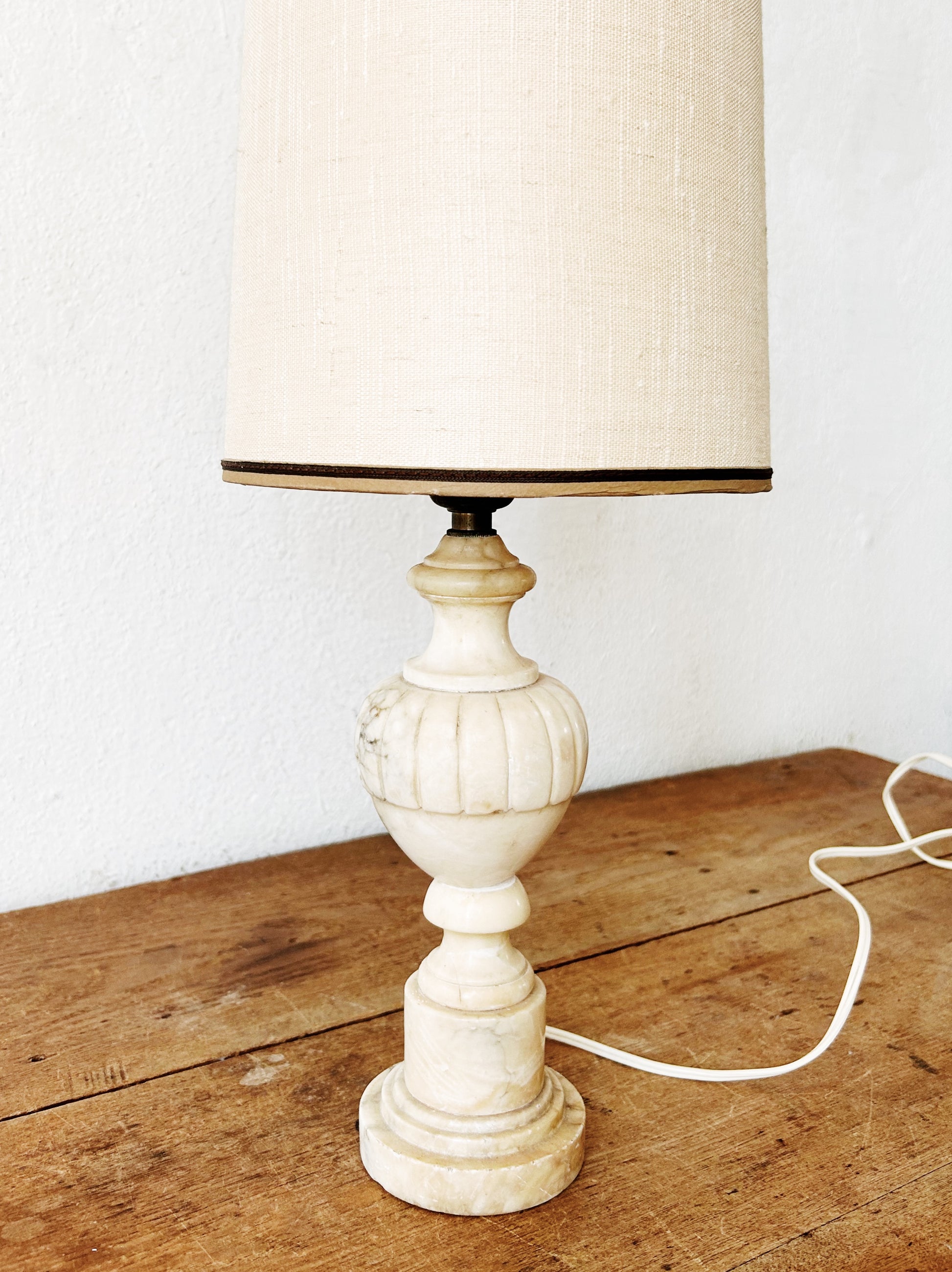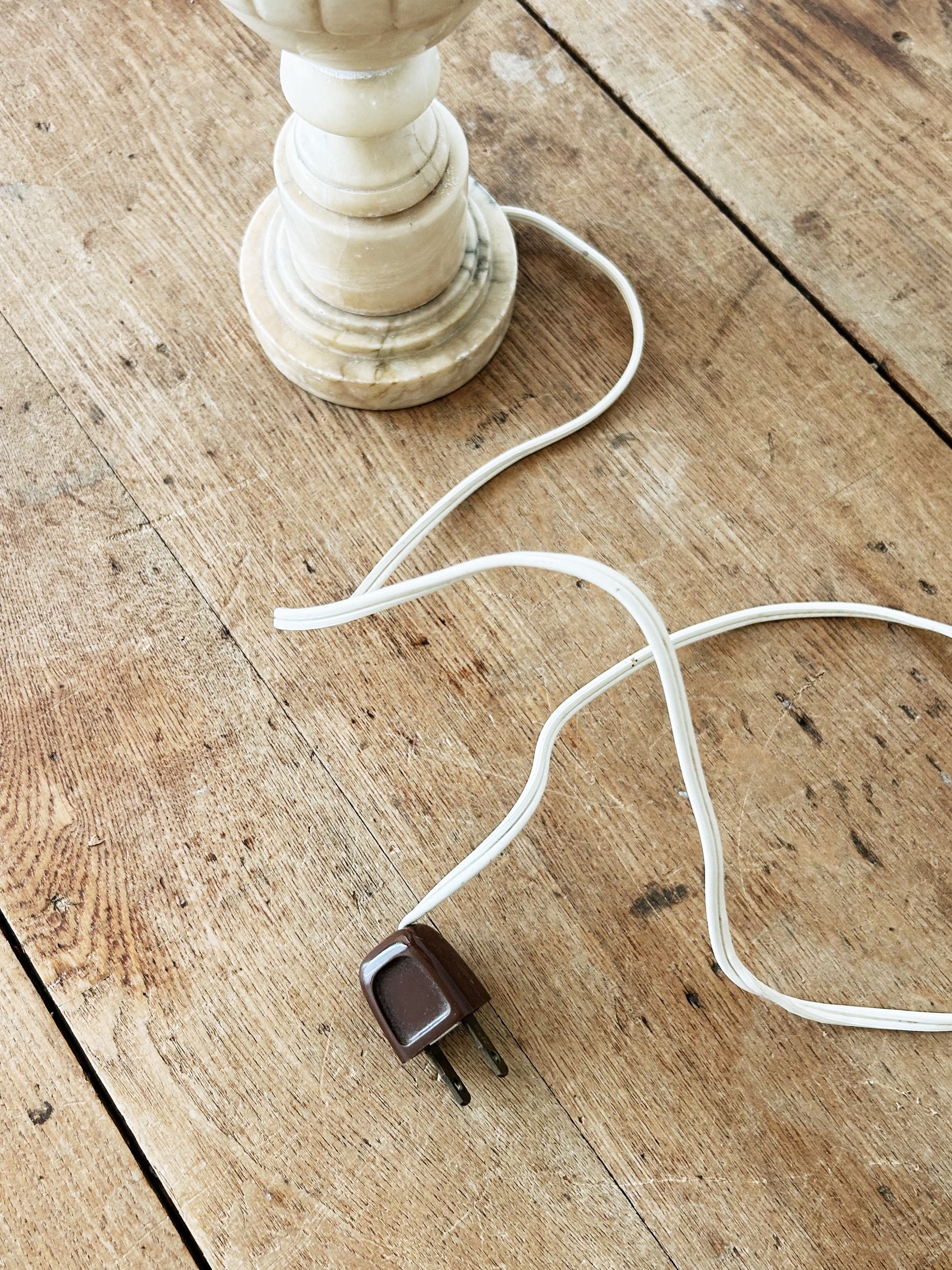 Lovely old marble lamp in a buff color. Petite for bedside or a kitchen counter. Aged brass socket and red tipped switch button. Some small scratches and old repairs but nothing that detracts. Comes with the woven shade but it’s not perfect. Happy to include it