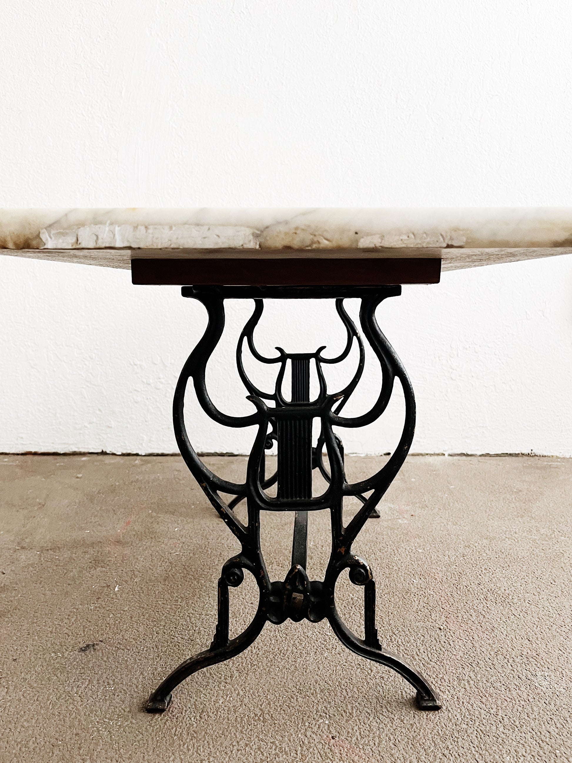 A petite marble topped table with iron legs. Works great as a low side table or try it as a shelf atop a buffet or counter as a coffee and espresso station. Some staining to the marble but doesn’t detract when in use. Ever so slight shimmy which corrects with weight on it.