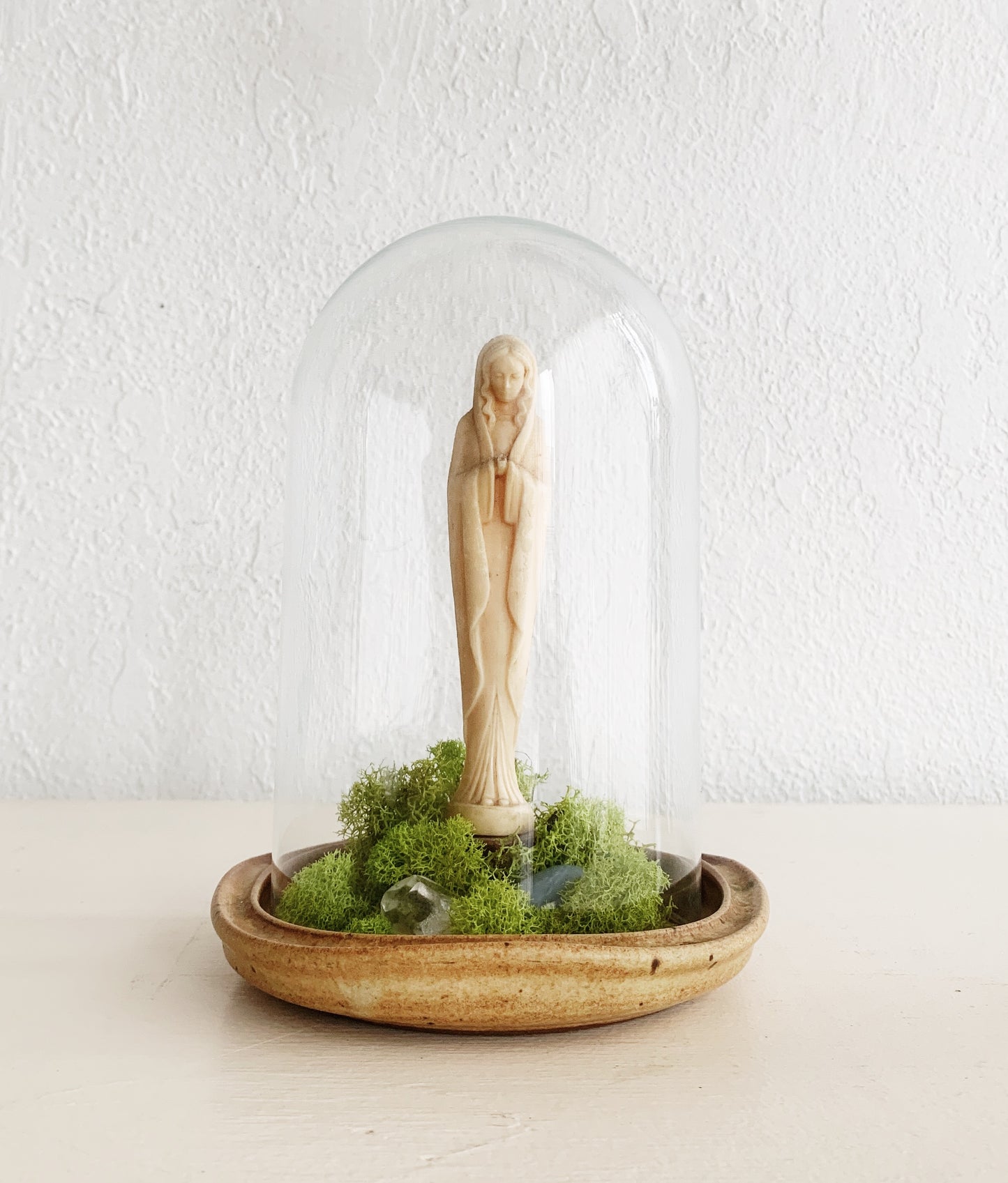 An antique carved Mary statue rests upon a handmade stoneware dish, encased in a glass cloche. Included in this keepsake is an angelite stone and raw clear quartz crystal. Angelite is a high vibrational stone stone said to invoke feelings of calm, peace and aids in third eye activation. Clear quartz amplifies these properties.
