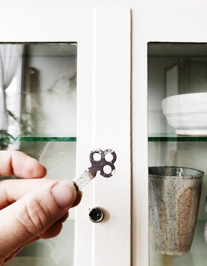 From the 1920s....an industrial medical cabinet made of enameled steel And glass. Two adjustable shelves, even has the original key! A real relic. Outer surfaces show minimal wear