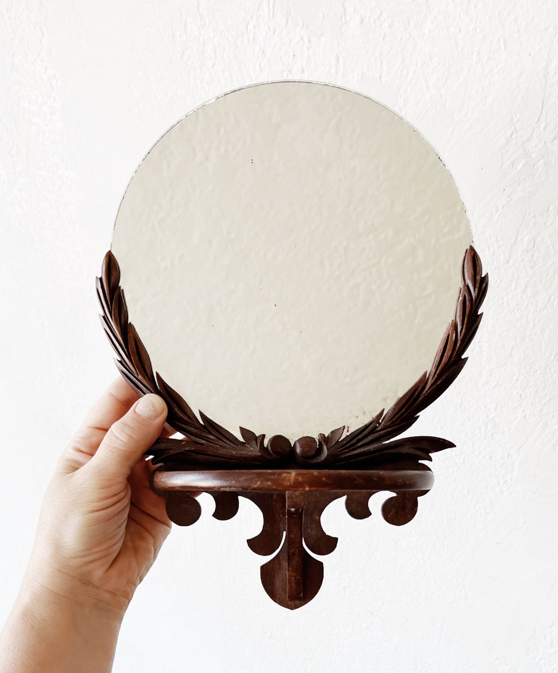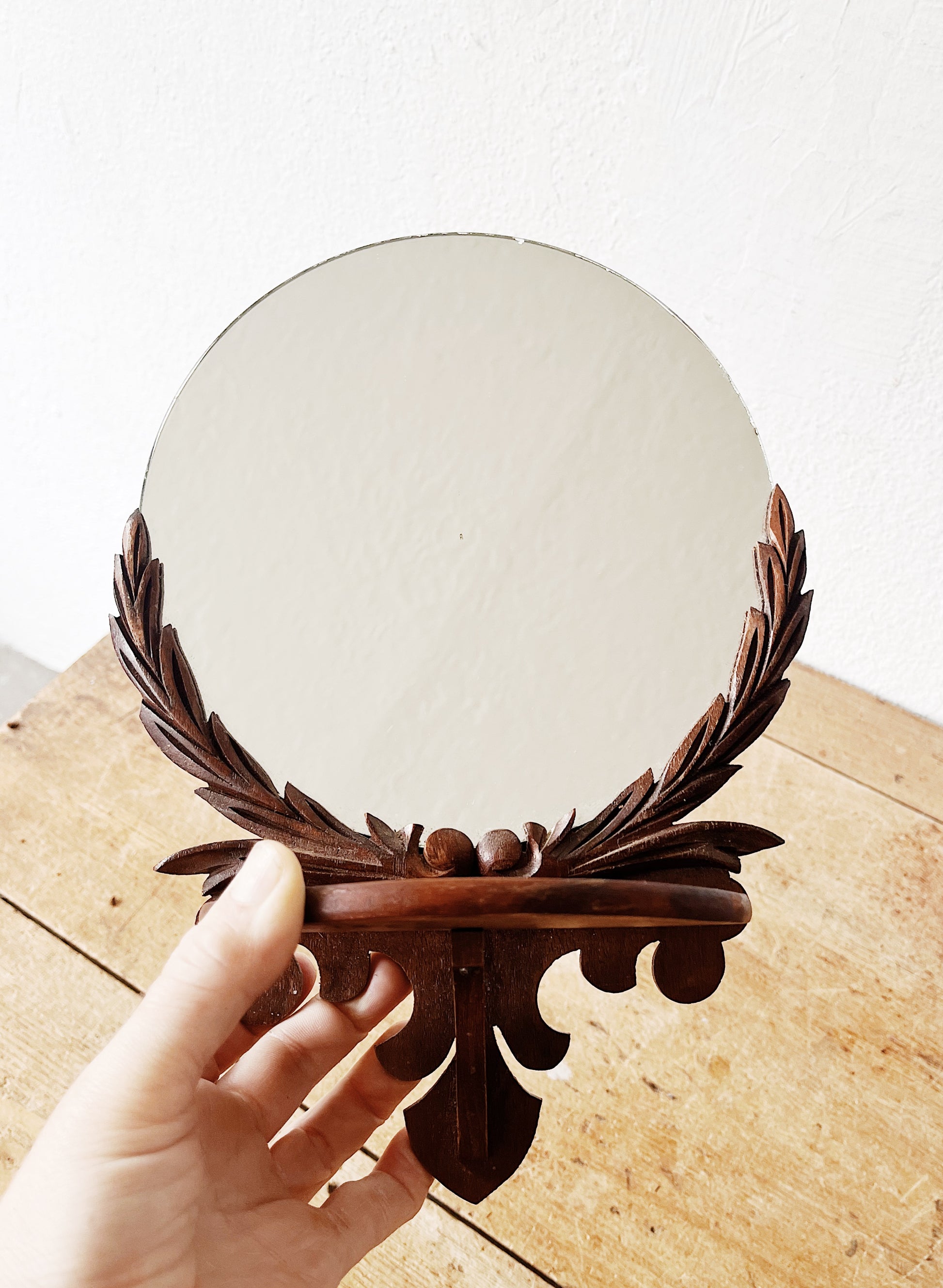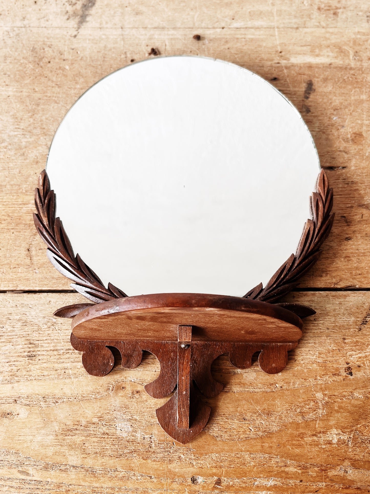 Art deco era. Gorgeous carved wood shelf with round mirror. The whole piece is aged beautifully. Nice for a small pocket or wall