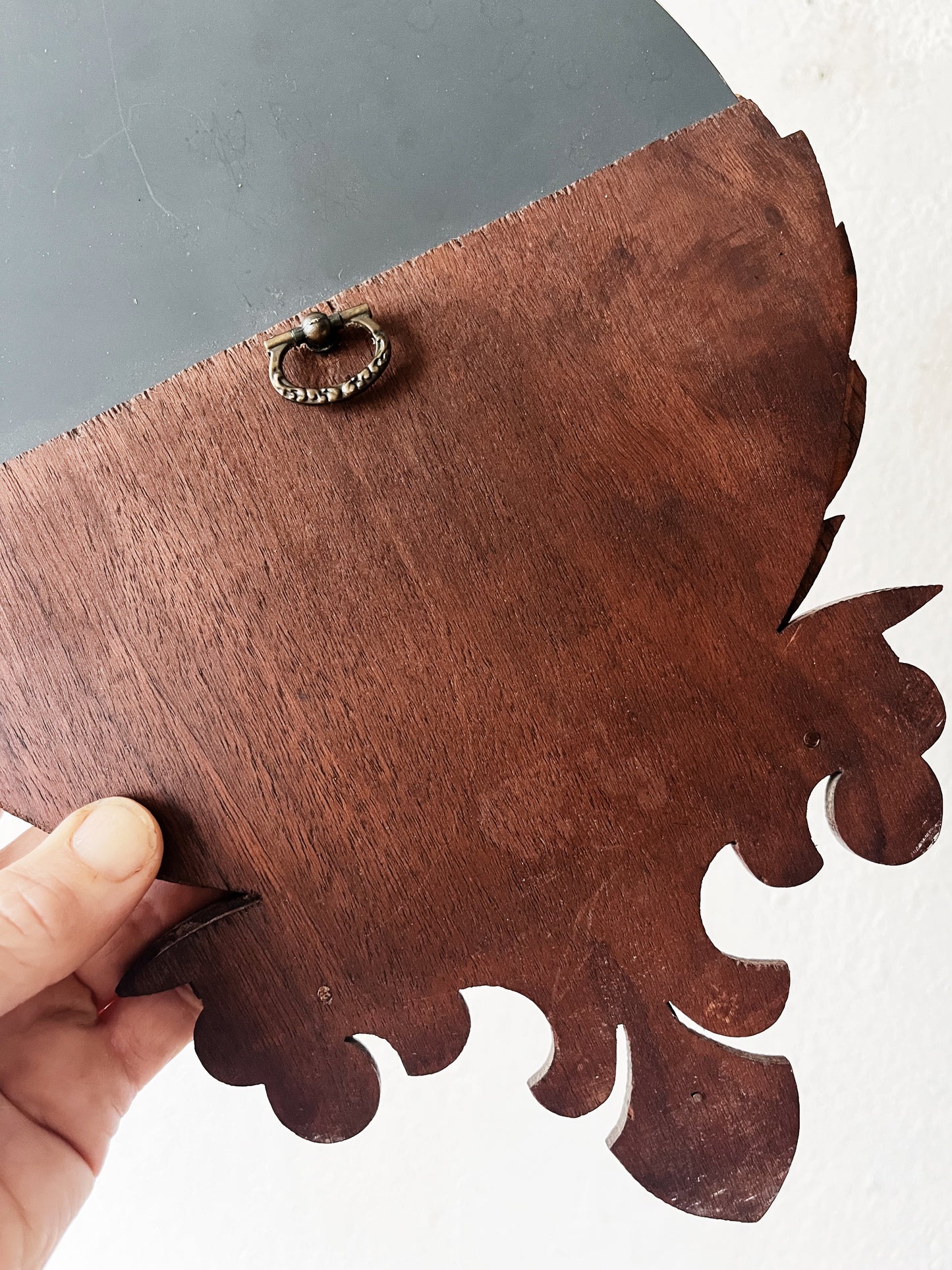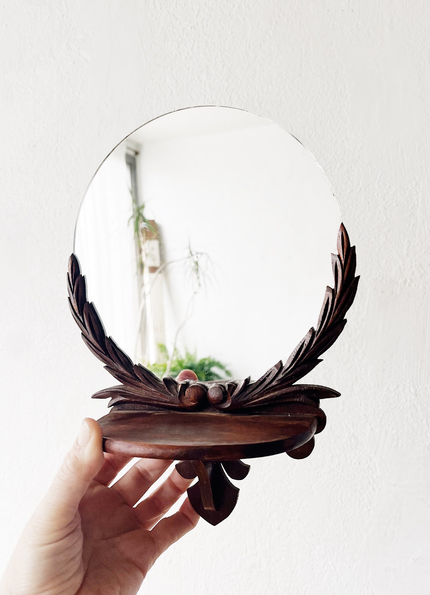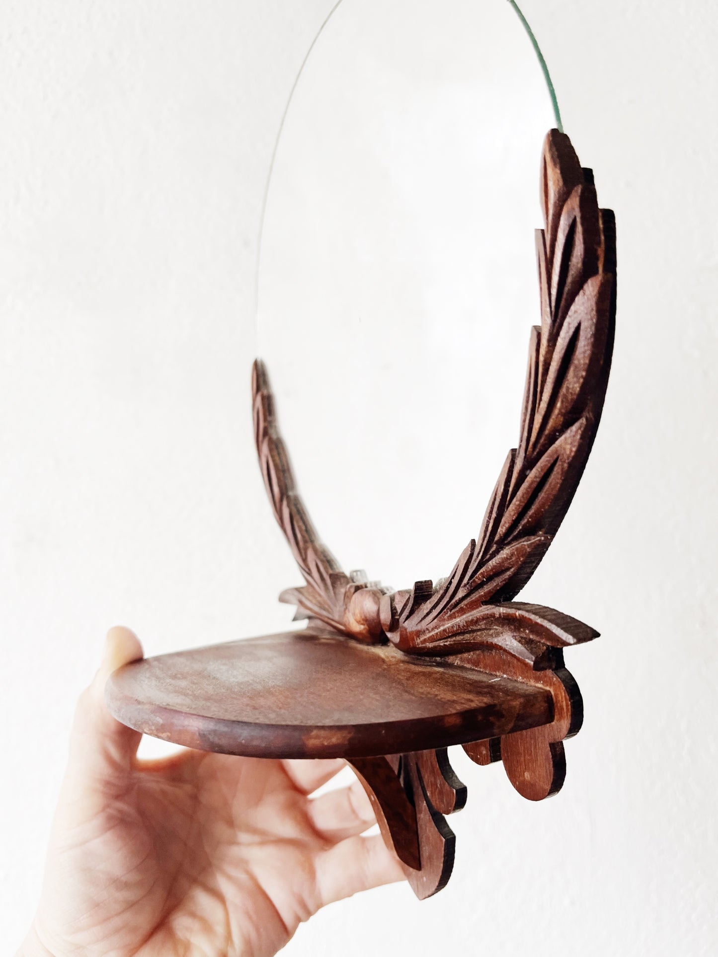 Art deco era. Gorgeous carved wood shelf with round mirror. The whole piece is aged beautifully. Nice for a small pocket or wall