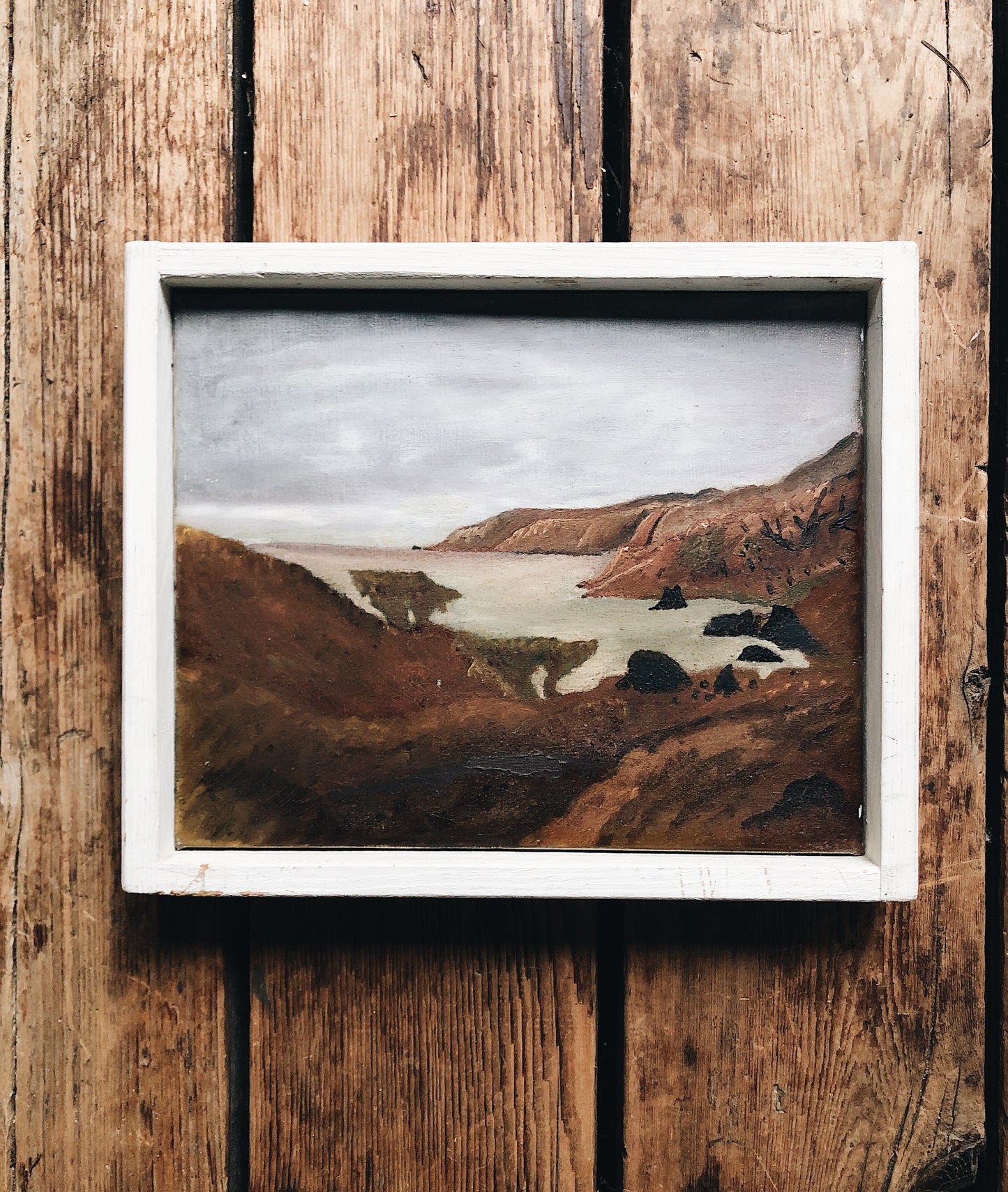 A real oldie. This oil on canvas is a moody depiction of the northwest coast. The colors are sublime! Framed in primitive painted wood