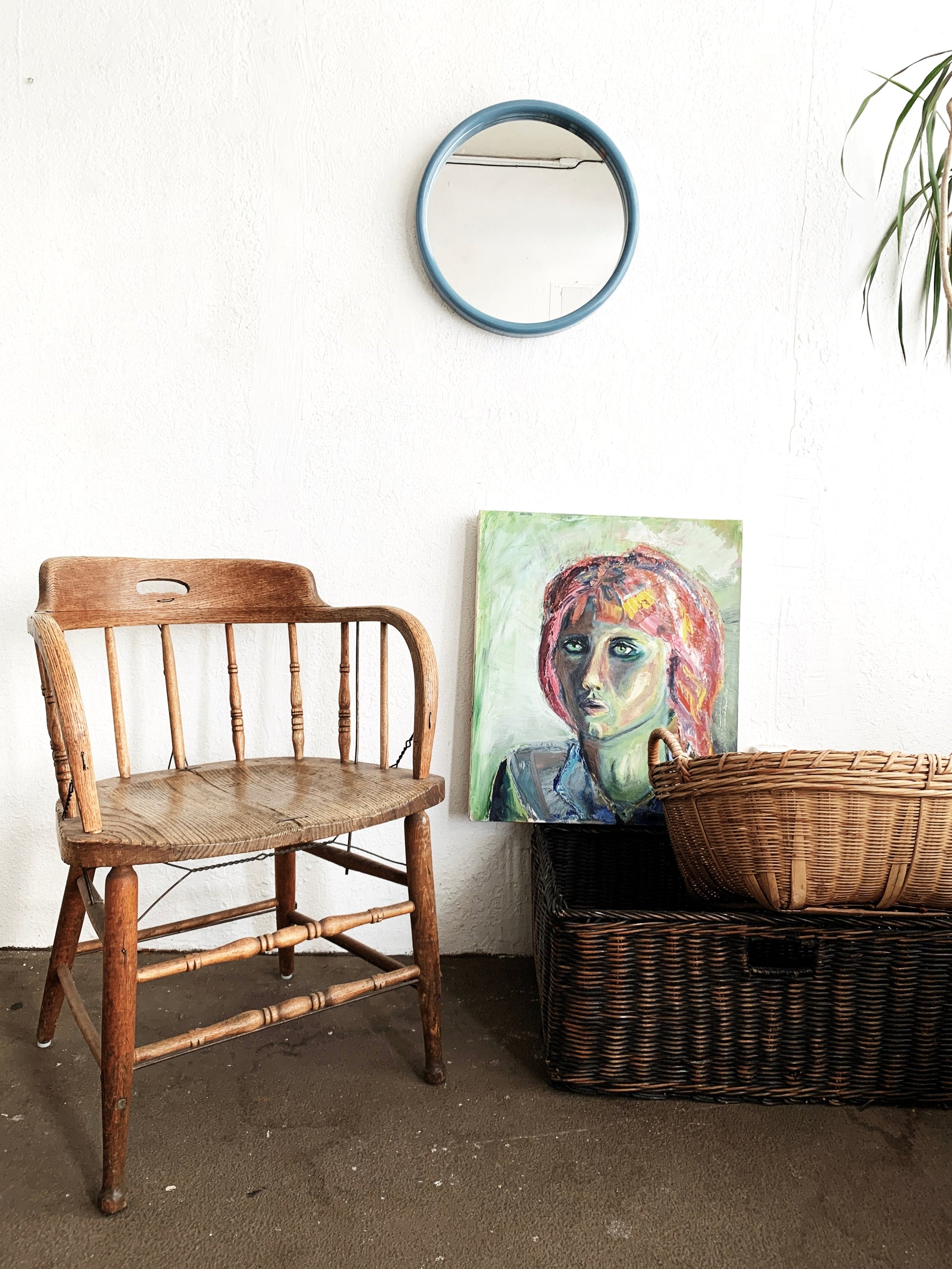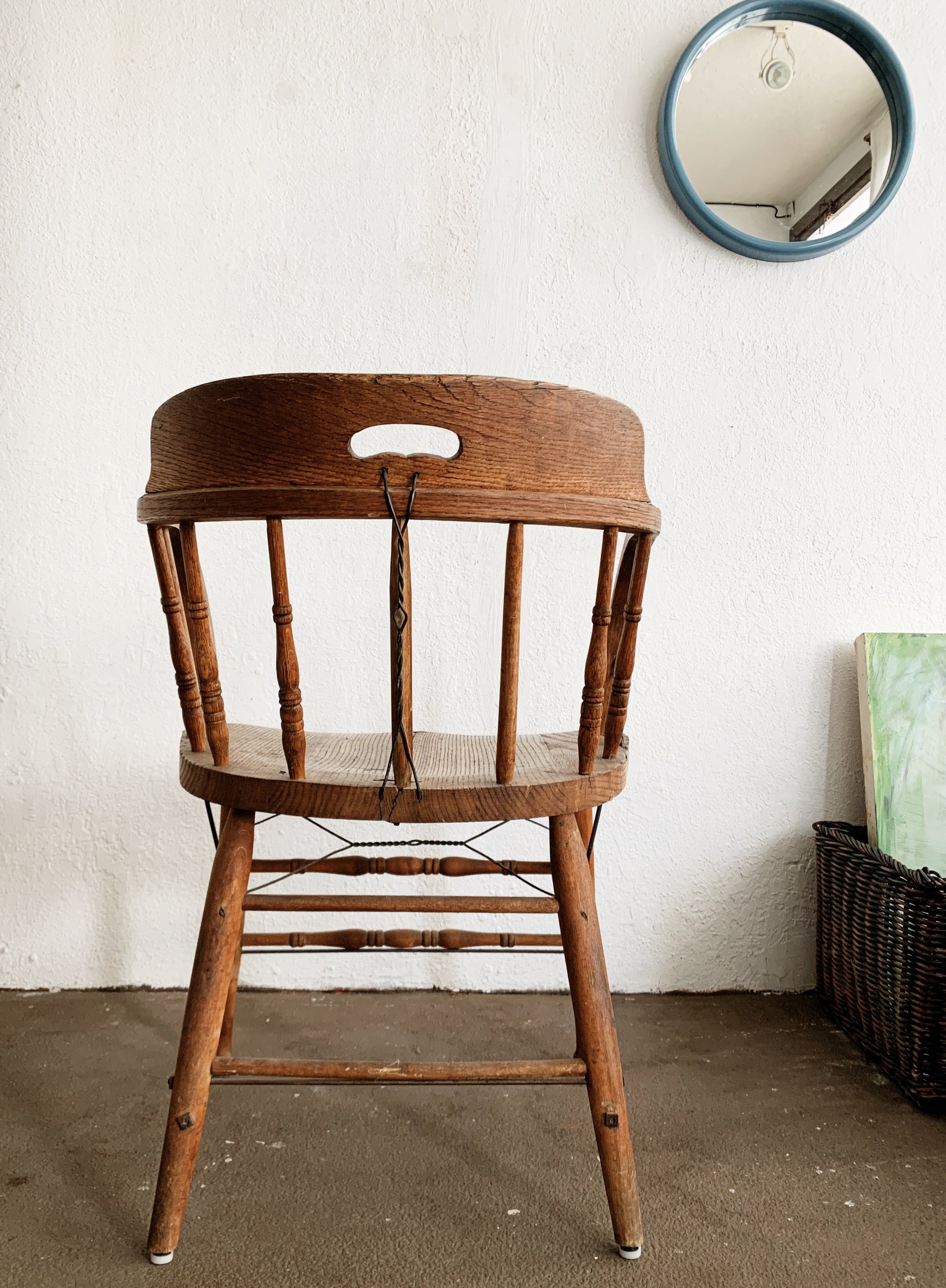 Such a gorgeous one! Antique oak captains chair with a rustic natural finish. Structurally sound with all wire bracing in tact. we often refer to these as O’keeffe chairs, as Georgia had a full set around her dining table