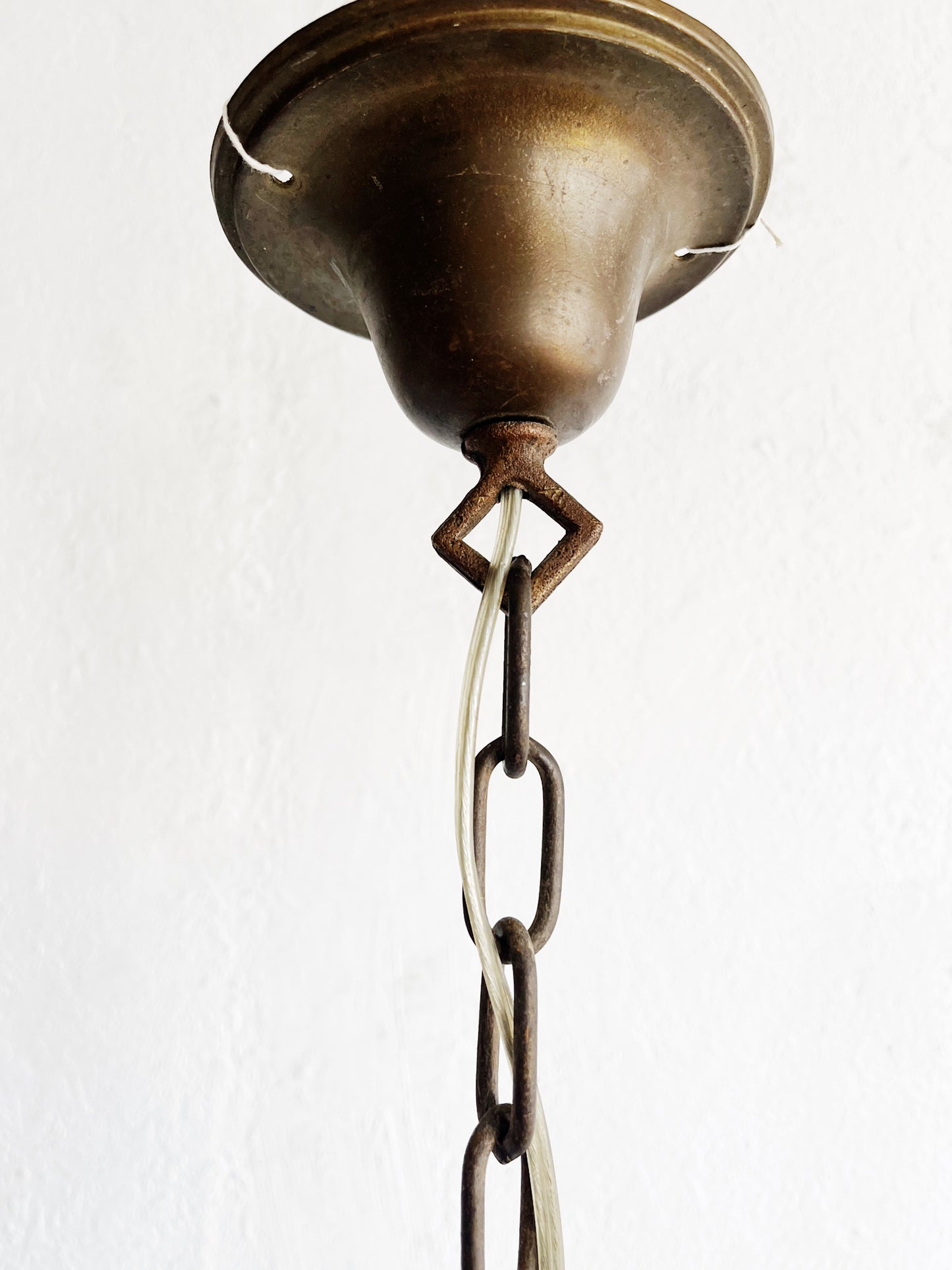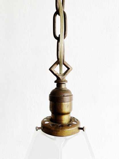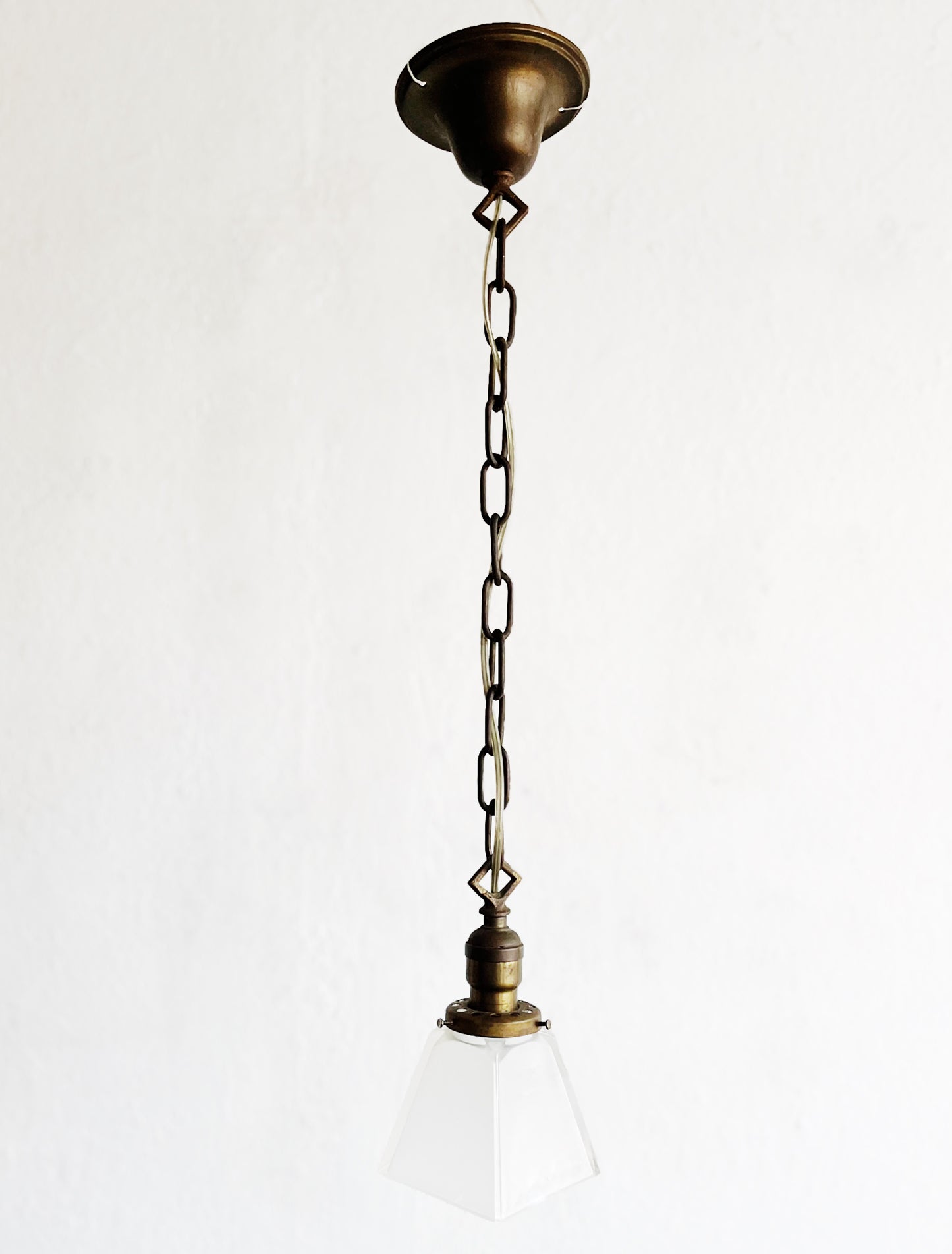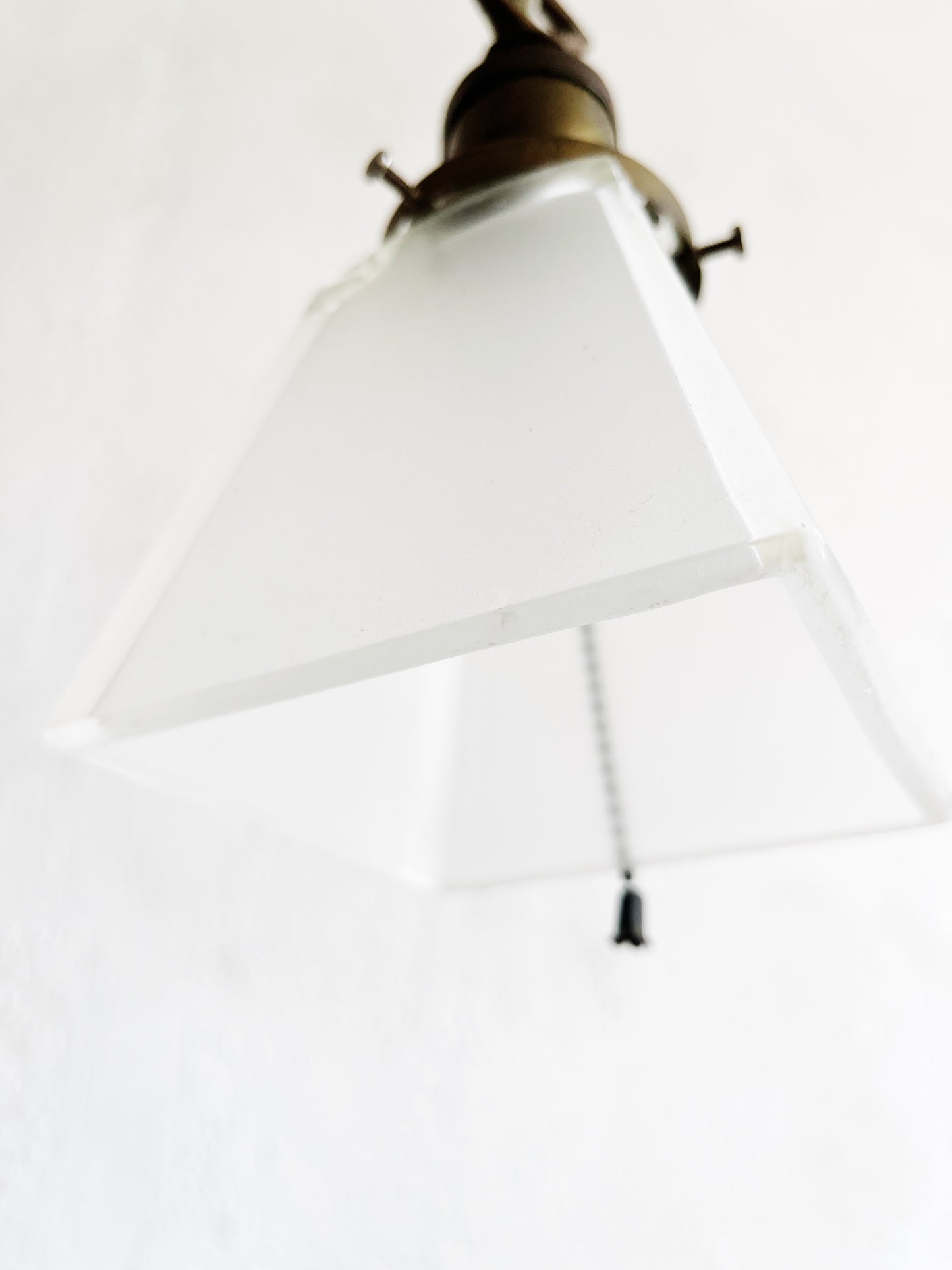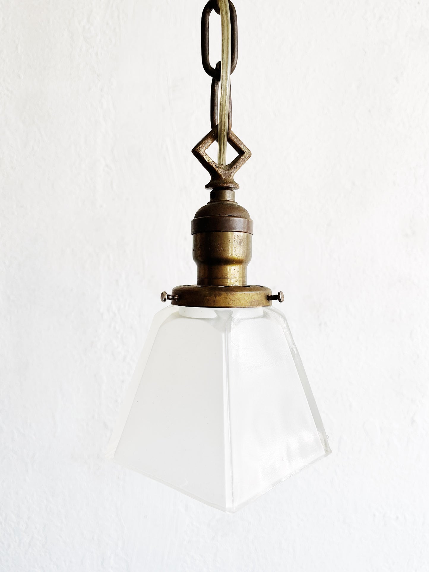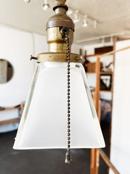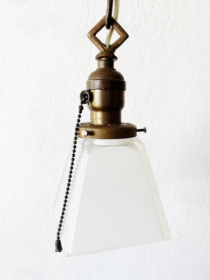 Gorgeous old pendant lamp with aged bronze chain and fitter. Frosted beveled glass casts a soft glow. Hard wire install but also has a pull chain. Nice for over a kitchen sink or small bath. Very charming