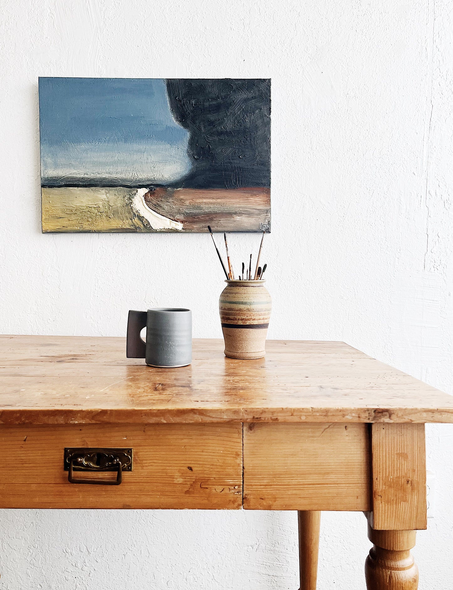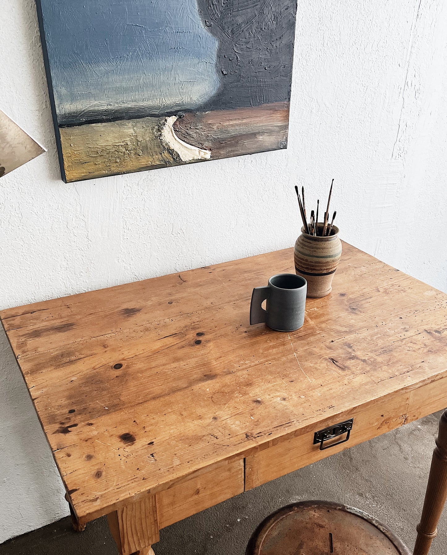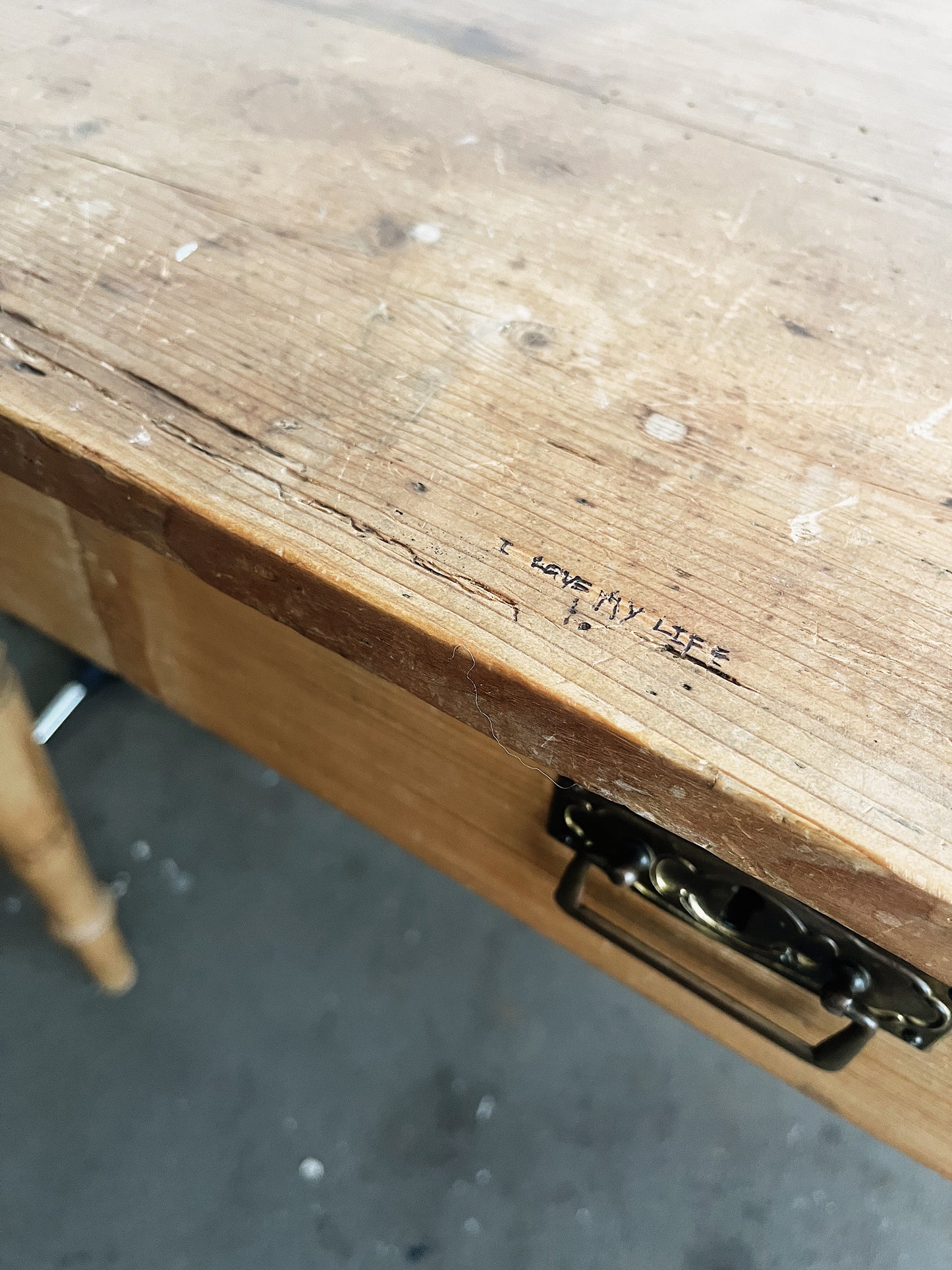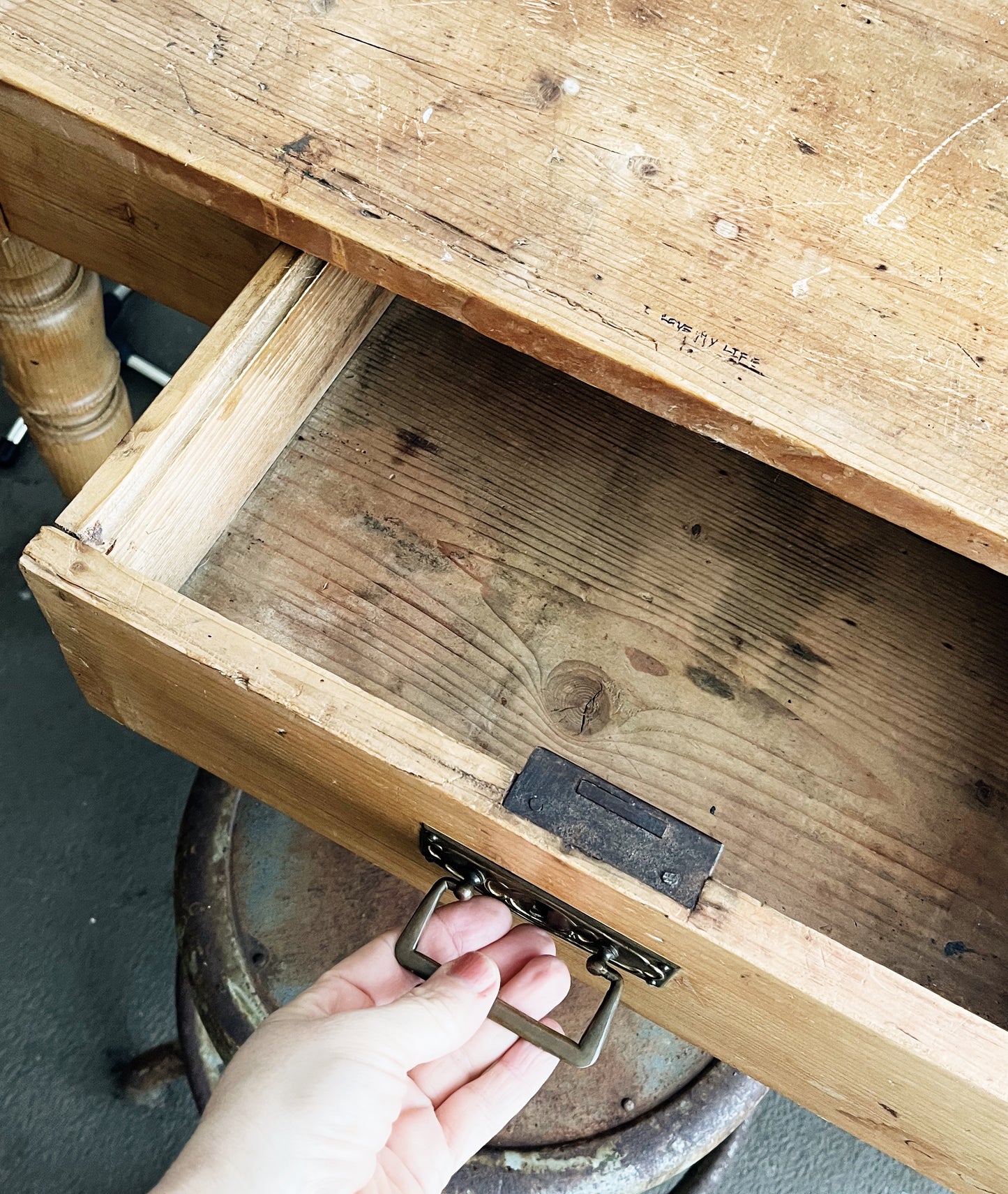 In nice condition especially for its age. The drawer slides smoothly. There is a slight warp to the surface but it doesn’t seem to impede working on it