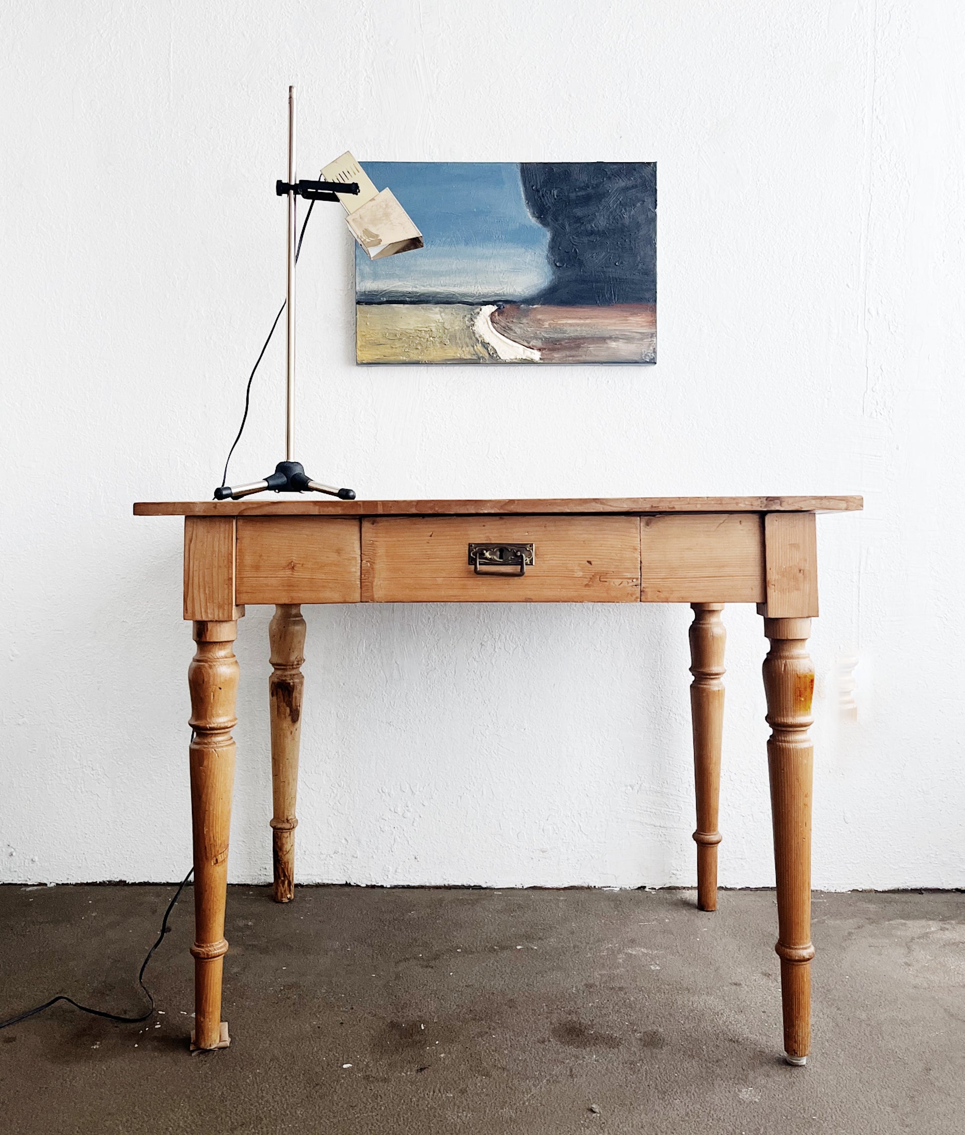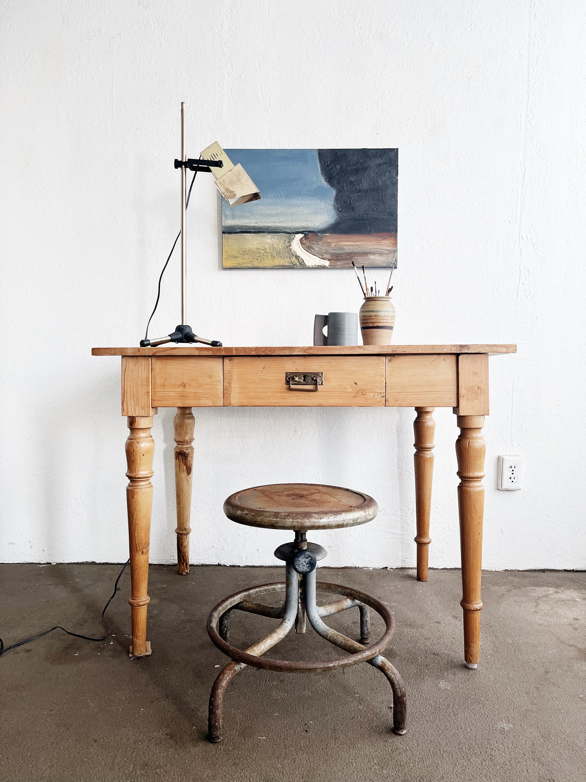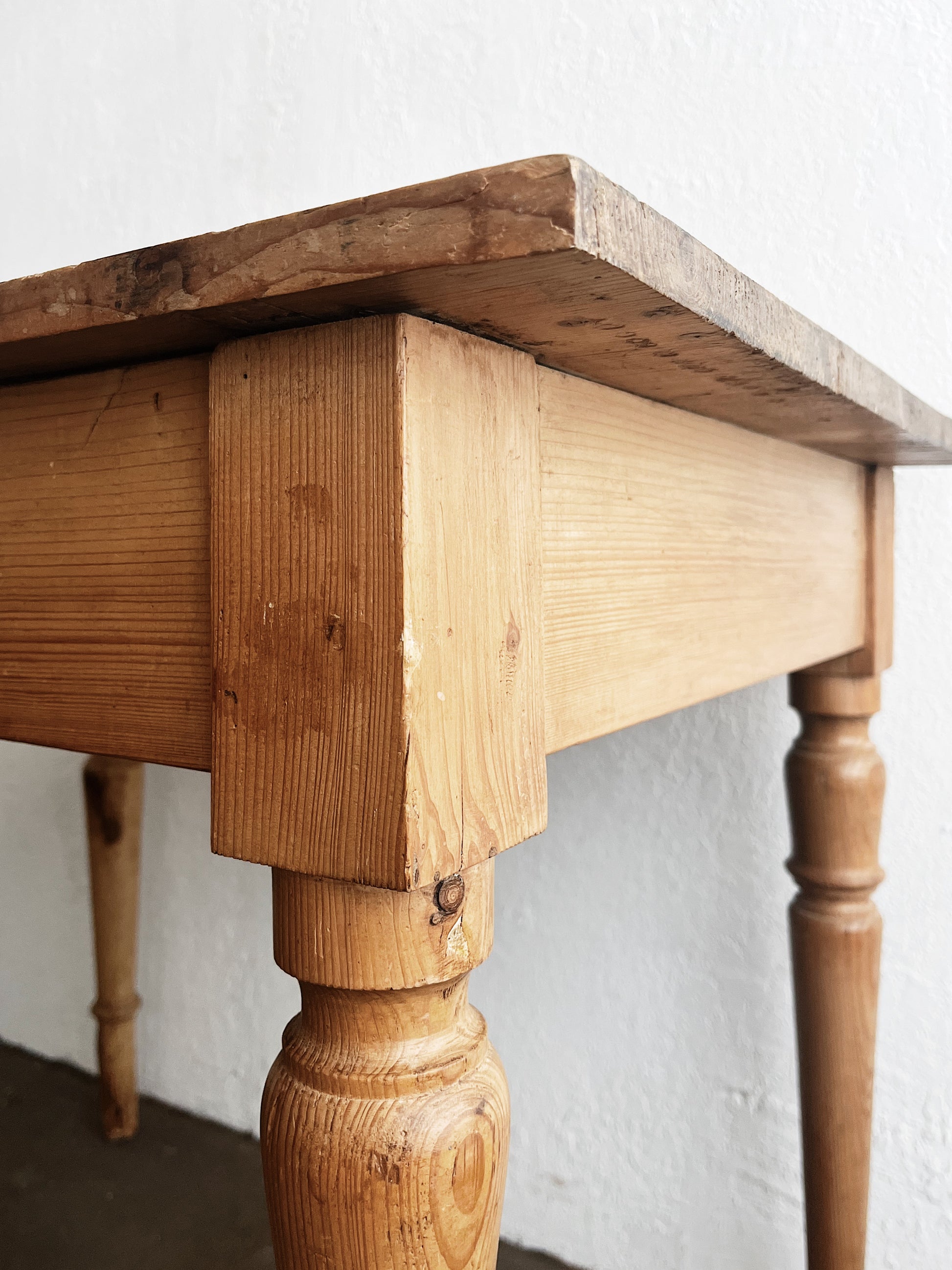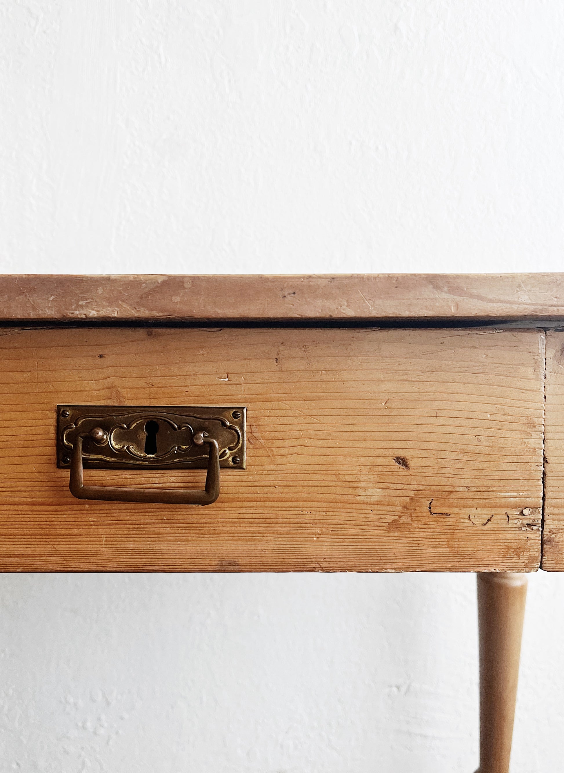 Beautiful old pine table or desk with turned legs. Somewhat Gustavian / Scandinavian in appearance. Beautiful brass pull on the one drawer. Mellow aged wood. A really lovely piece of primitive European folk furniture.