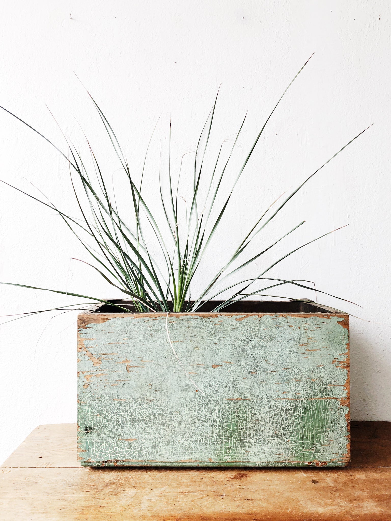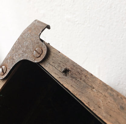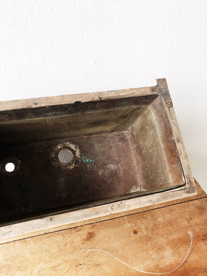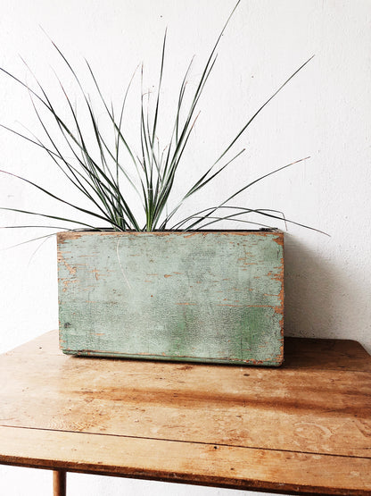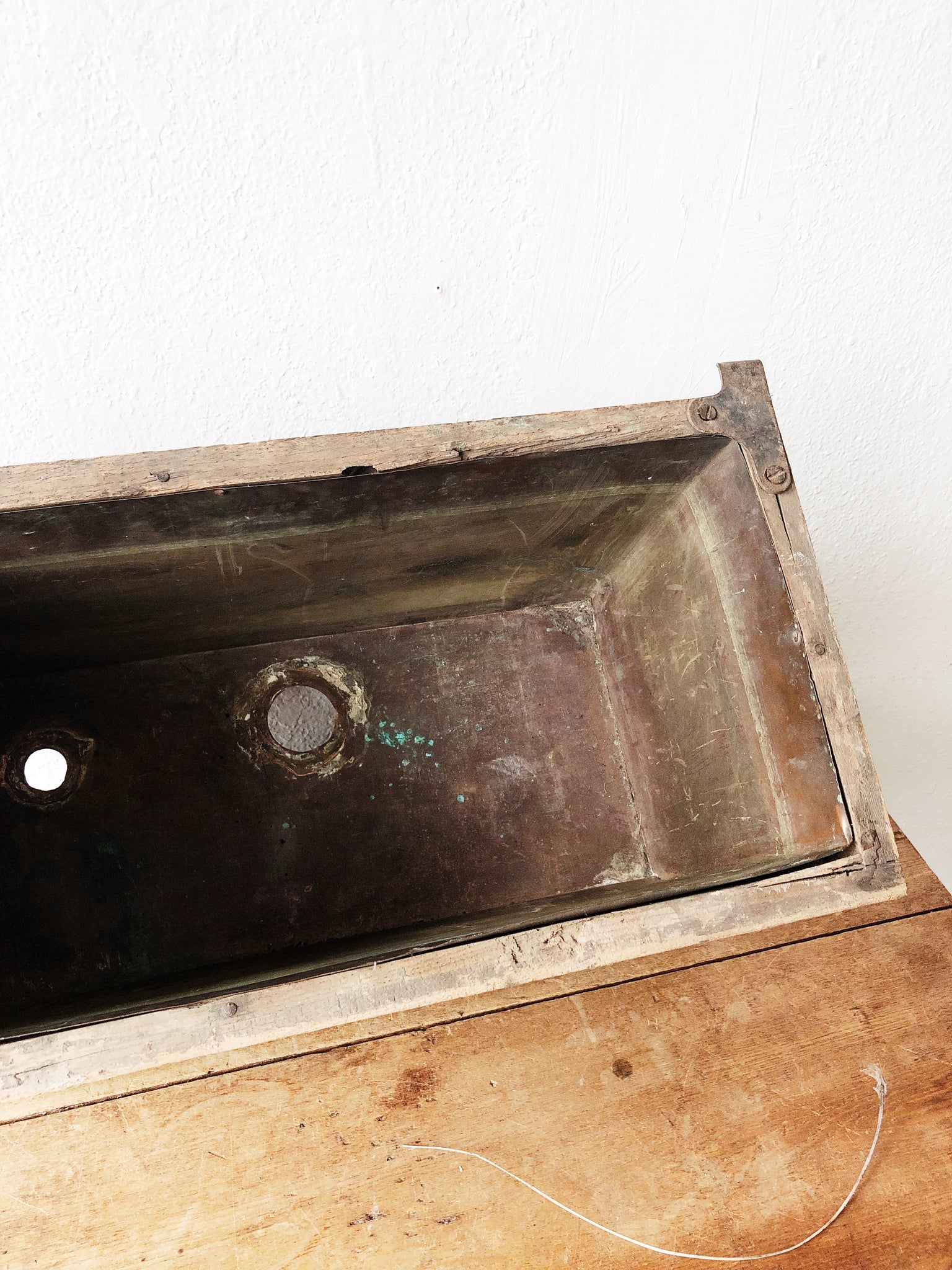 A great find! Antique wood sink lined with copper. Outside is painted a pretty pale green. Complete with drainage holes. Original hardware attached