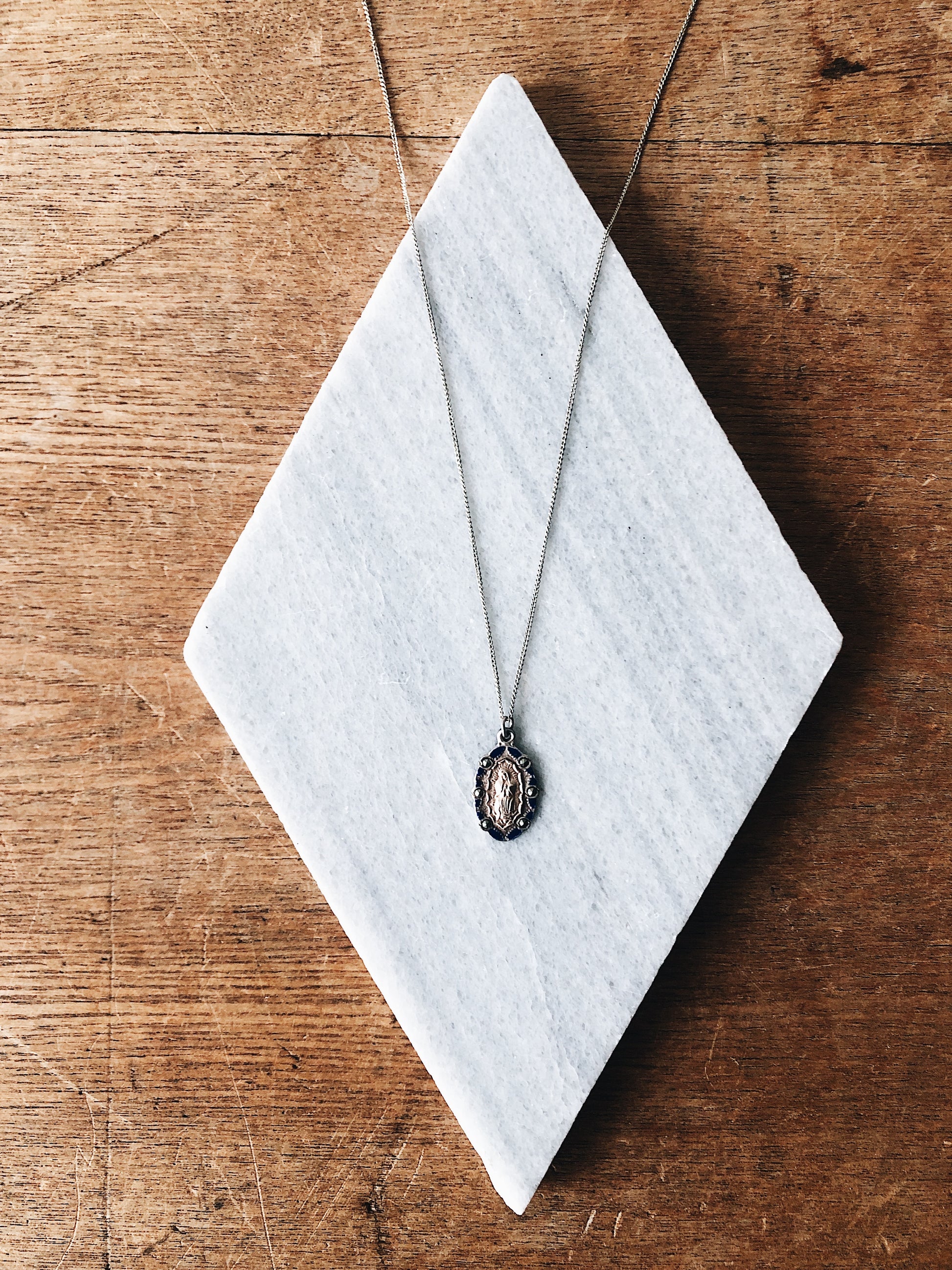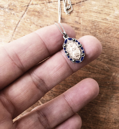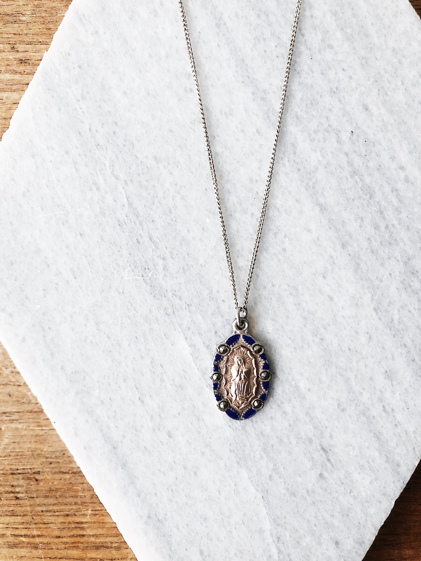 Beautiful and very old baptism medallion. Kneeling Mary. Blue enamel paint on stamped silver and plated gold. Marcasite stones surround. The chain is dainty and lovely