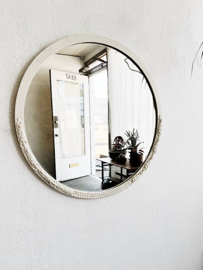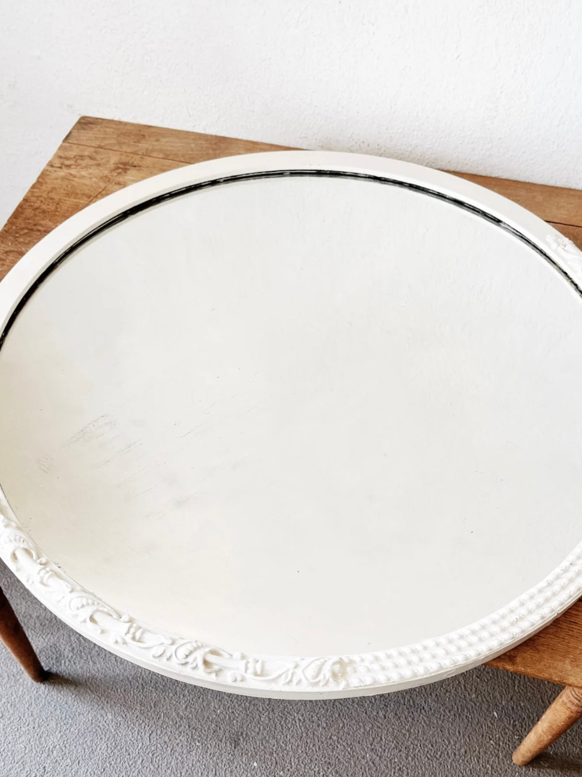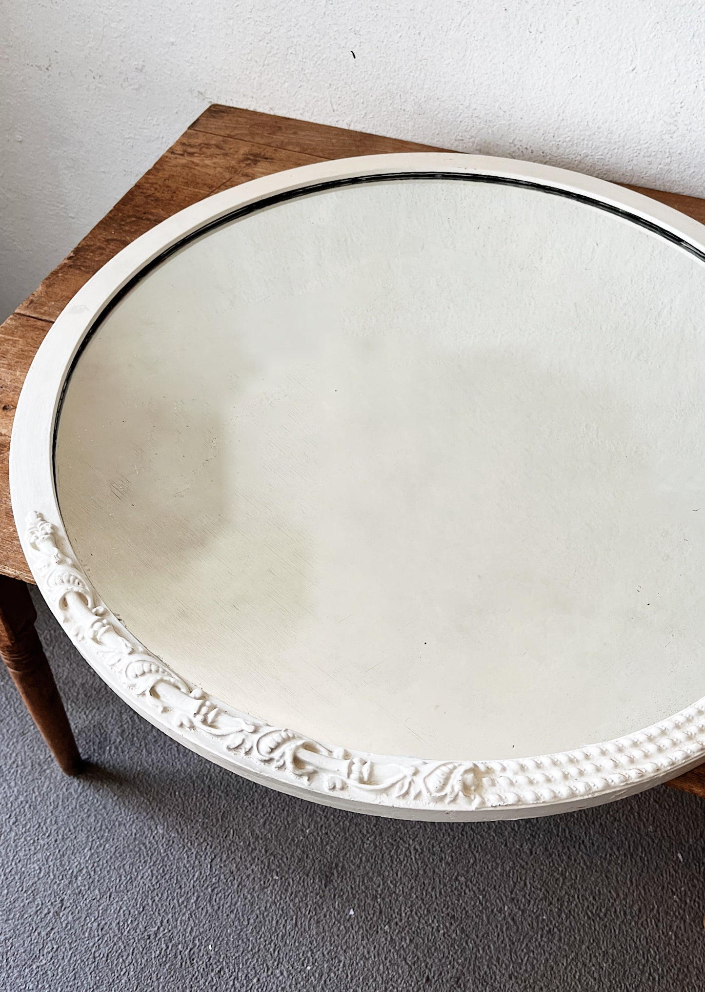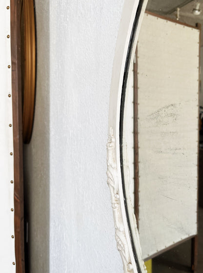 Antique round mirror. Wonderfully carved wood frame painted white. Some very slight silvering is present on the glass but mostly clear as can be. A lovely piece