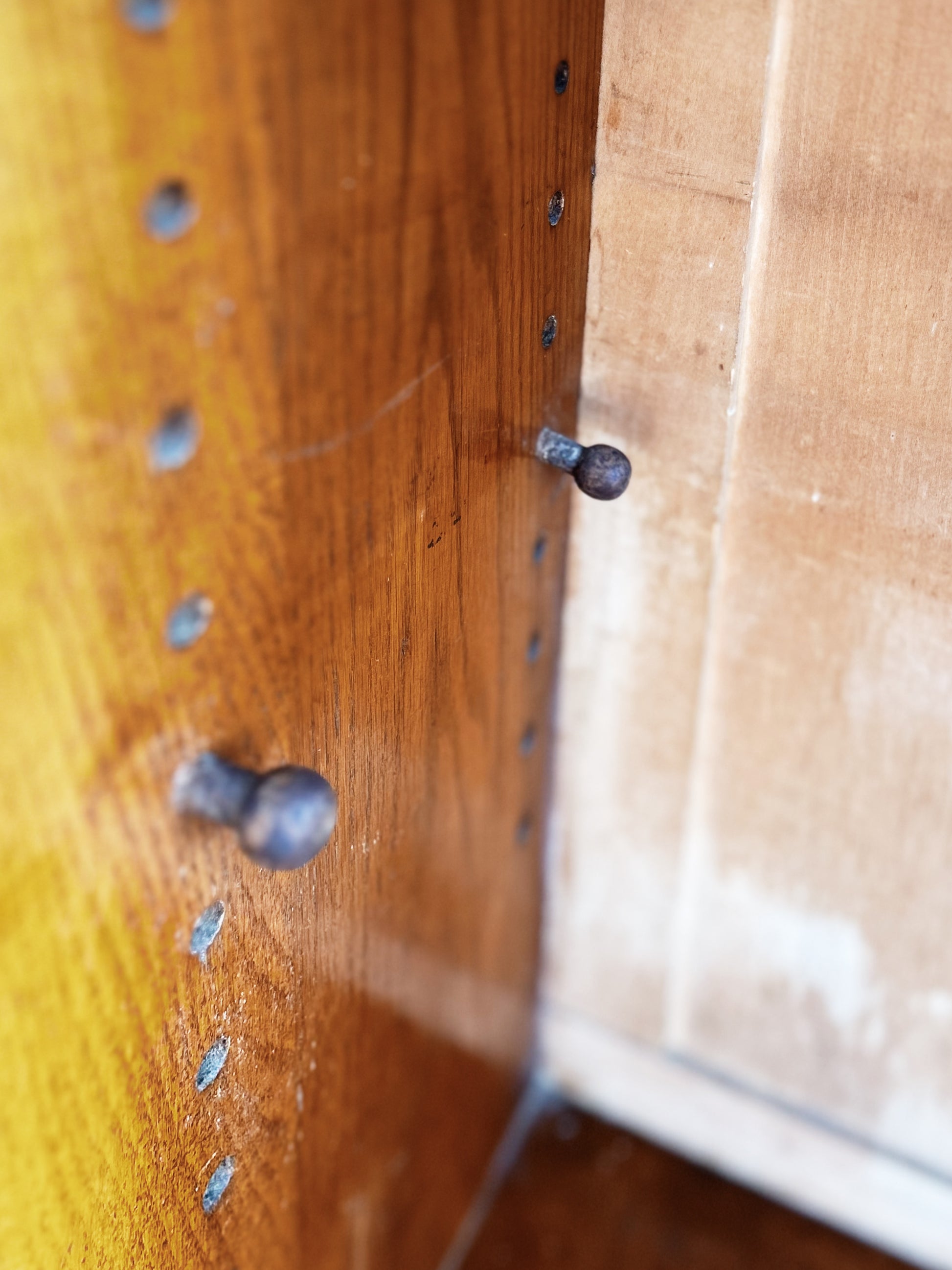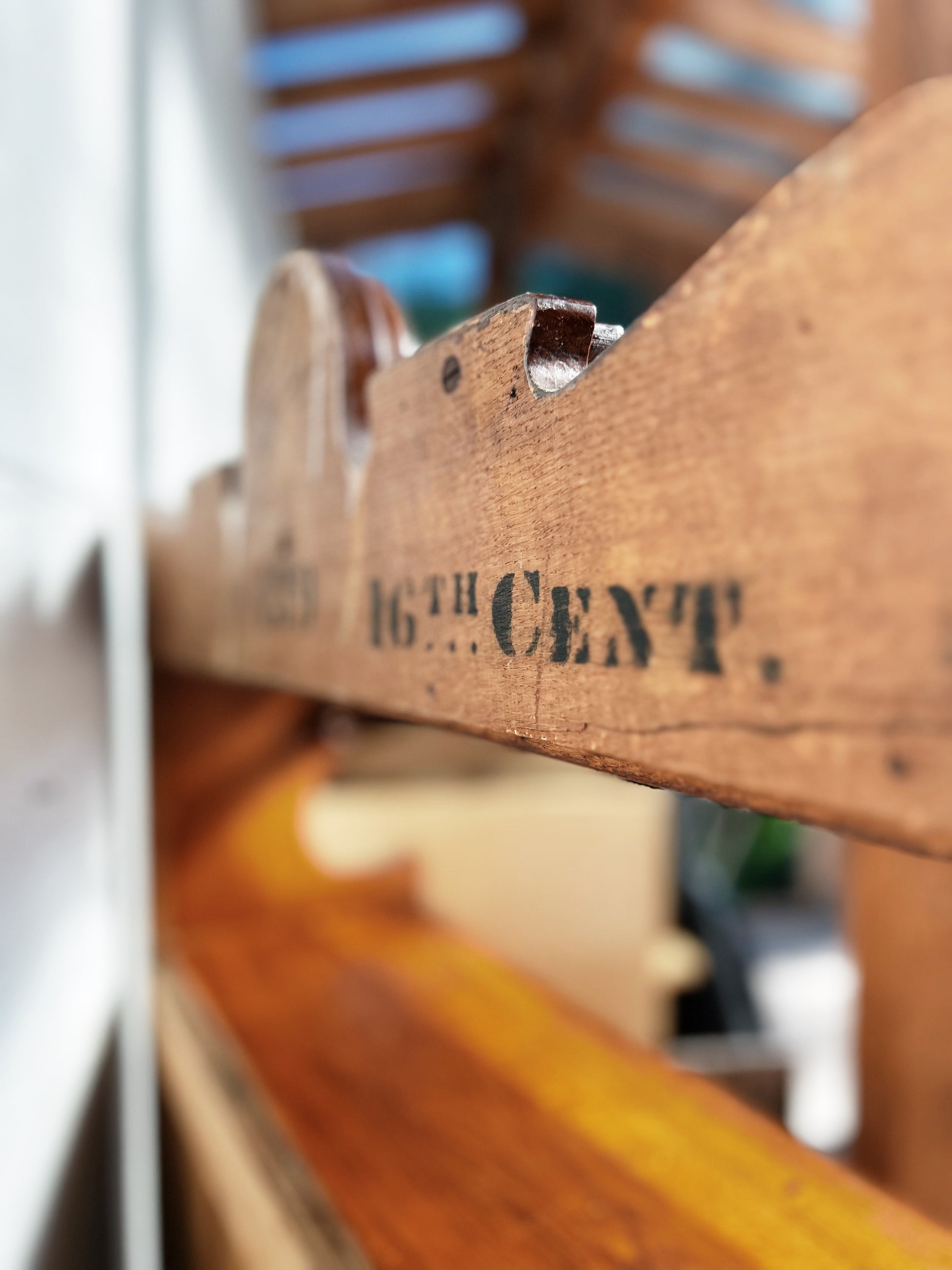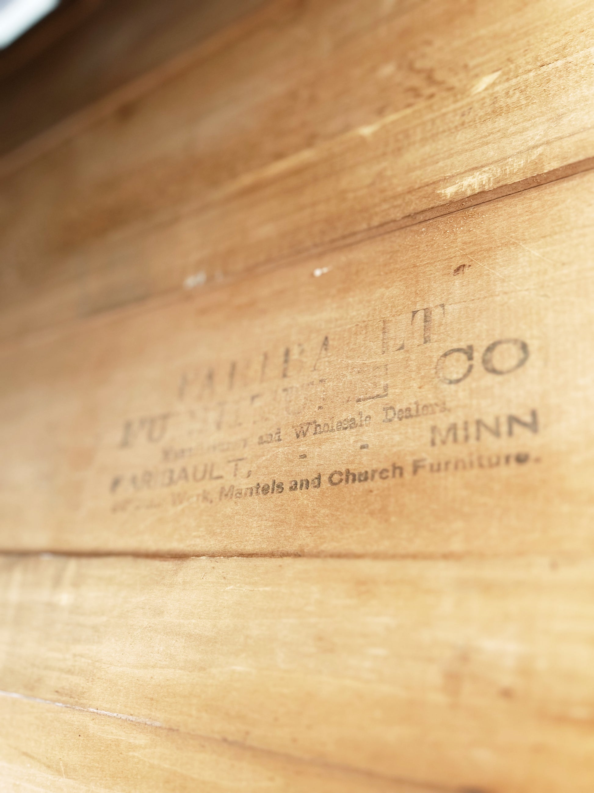 Antique secretary. A stunner! has a removable wood rod for hanging a pretty piece of fabric. Use the unique supports to put an additional shelf on the bottom. The cubby and brass letter holder are both charming, as are the cutouts. And the mirror! Oh the mirror. On casters, though they can be a little temperamental. Some general wear to the surface but fits right in to the overall look.