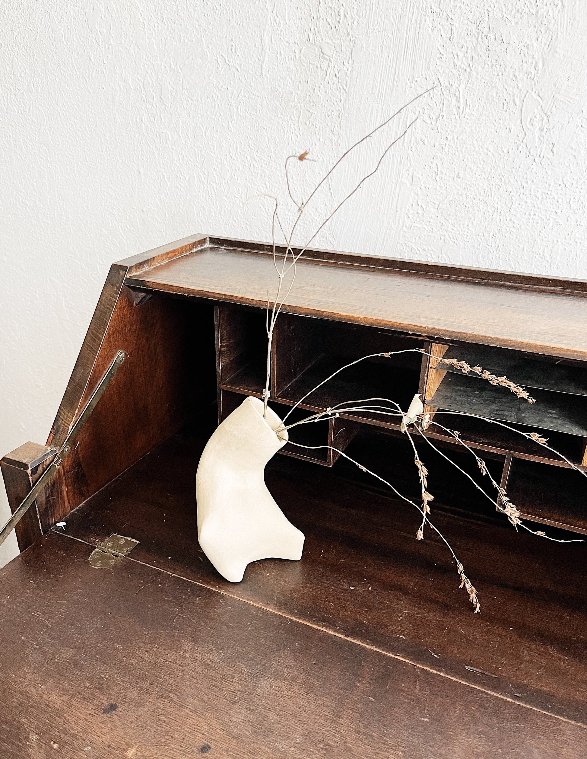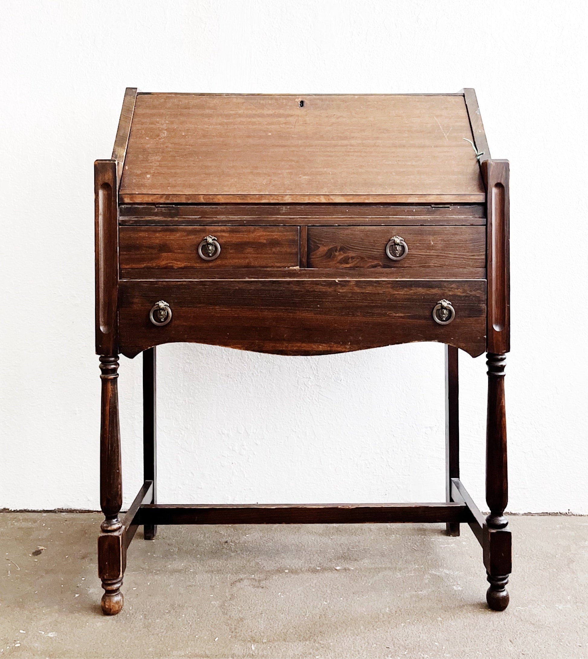 Fantastic vintage writing desk with a small footprint. Great cubbies and drawers! Original hardware. Fluted side details and those ball feet! Really nice piece. Some overall wear but nothing horrible. No key. Small leather pull tab to open the upper part