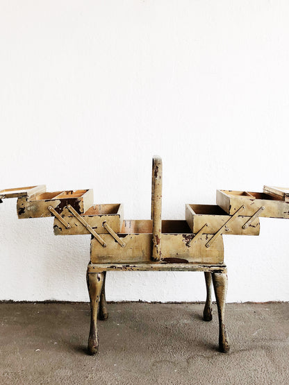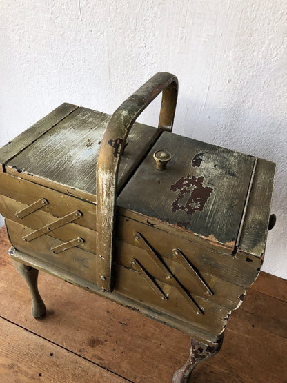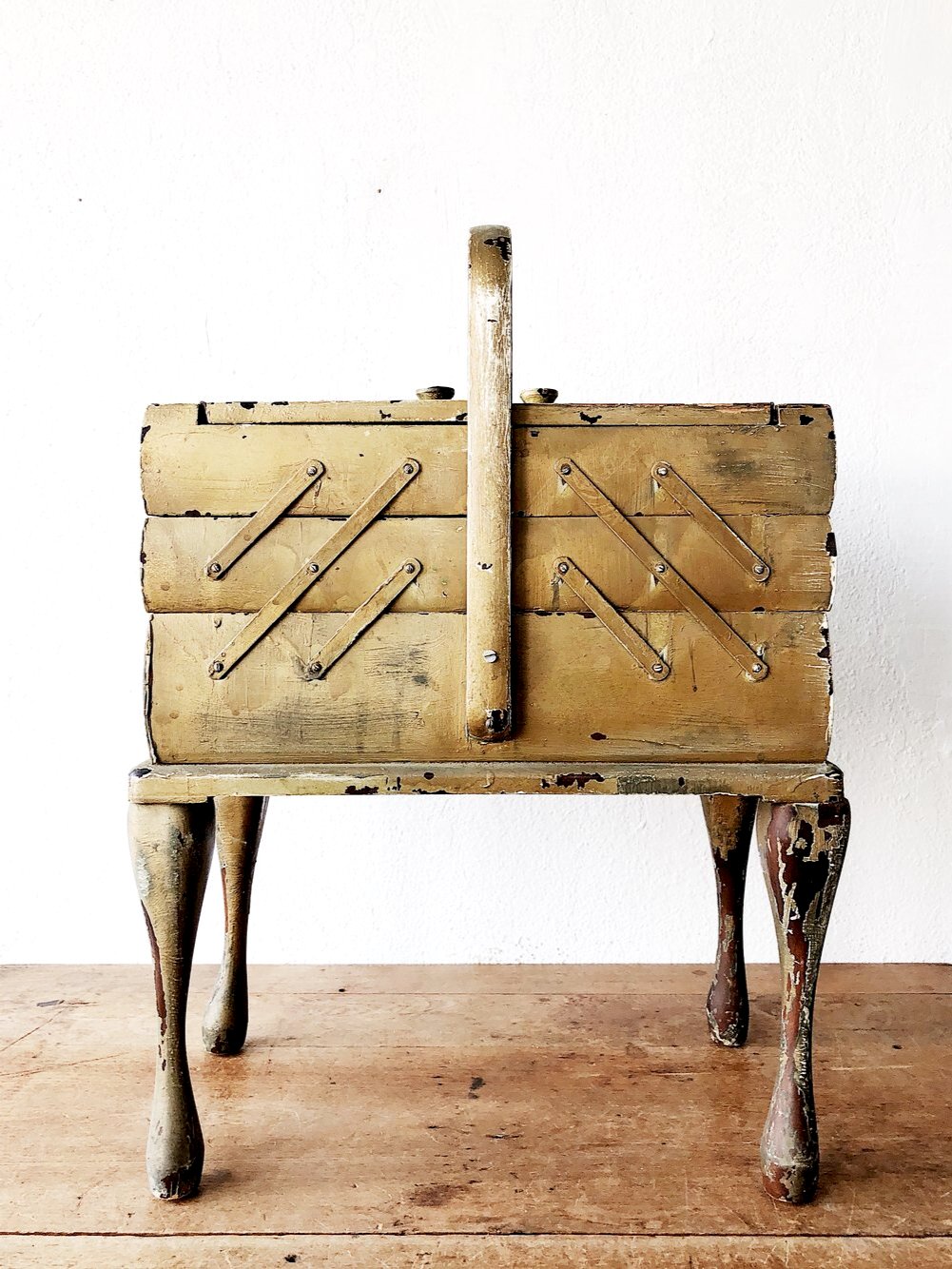 Very old sewing box from the early 1900s. Painted with aged gold leaf gesso over wood. Chippy and fabulous. Original papered insides. Tiny brass screws