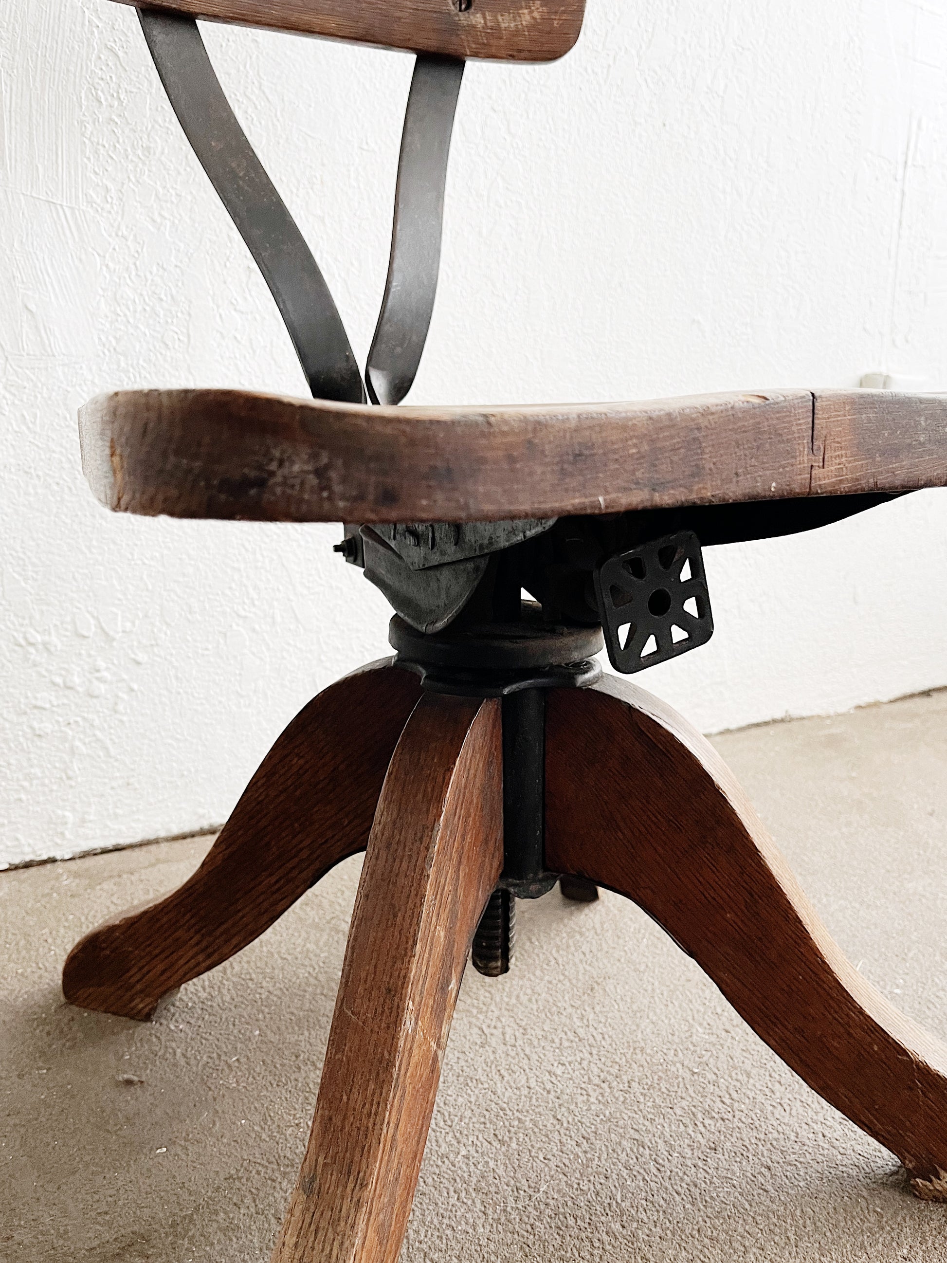 Machine age chair of wood and iron. A really cool design. Wood has nice wear. Back flexes back a bit (purposely). Spins. The mechanism that brings this up to typical chair height is not working however it makes a really cool occasional/side chair in a living space. Heck, It’s so good looking it could just sit over in a corner and we’d love it.