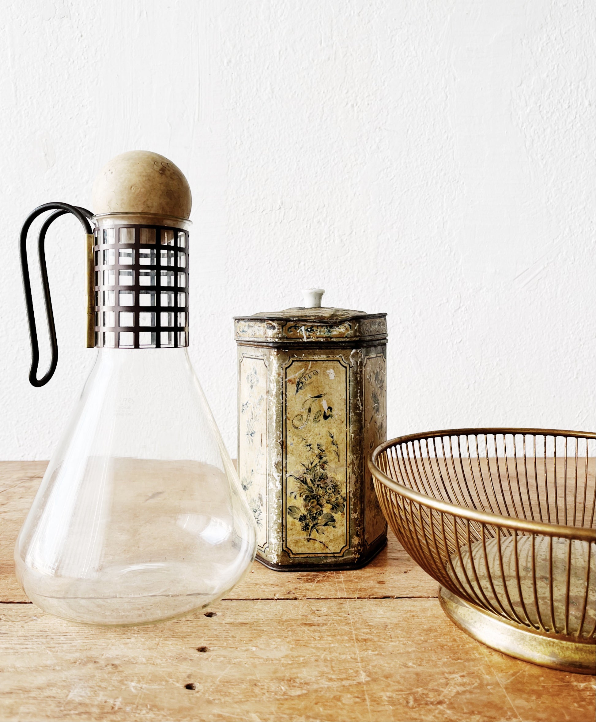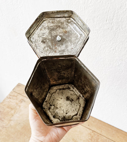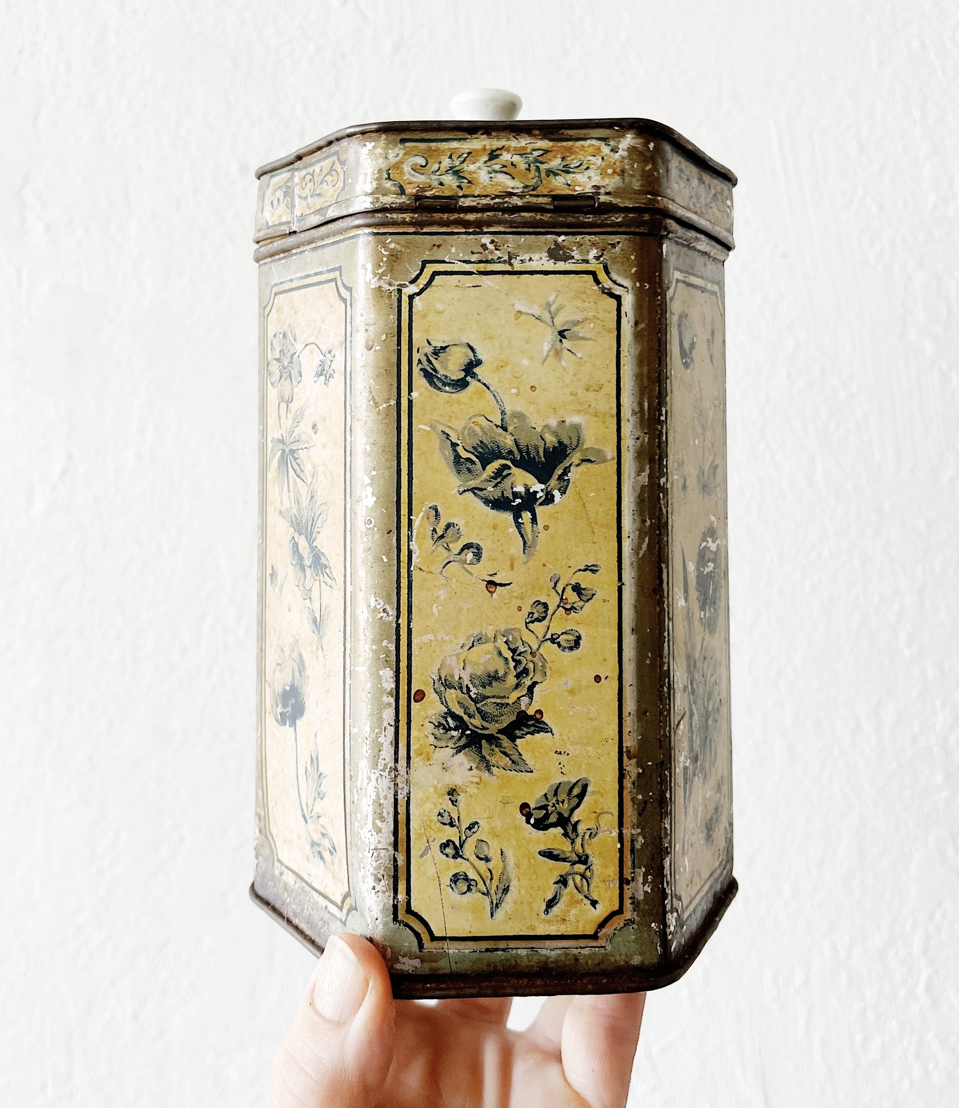 Beautiful old tea tin with porcelain knob. Patina and wear as expected for the age. Perfectly usable