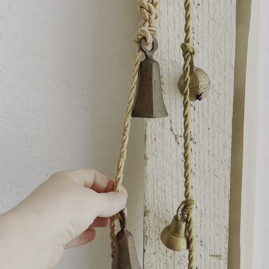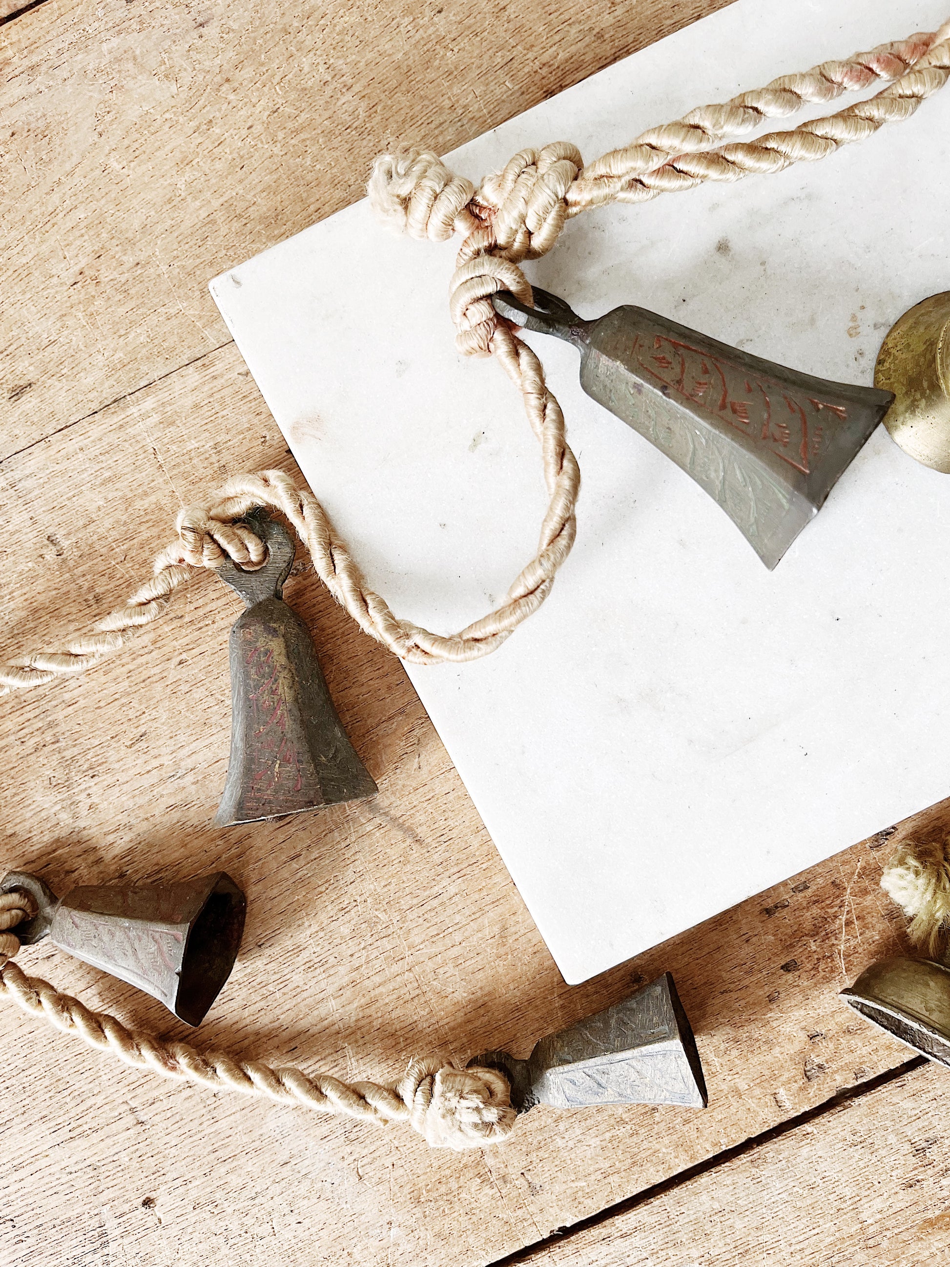 Lovely sound to these antique aged brass temple bells. One strand has unique varied shapes. The other has graduated sizes of incised bells. Strung on old silk, we have these hung together on our entry door and they sound lovely together and apart
