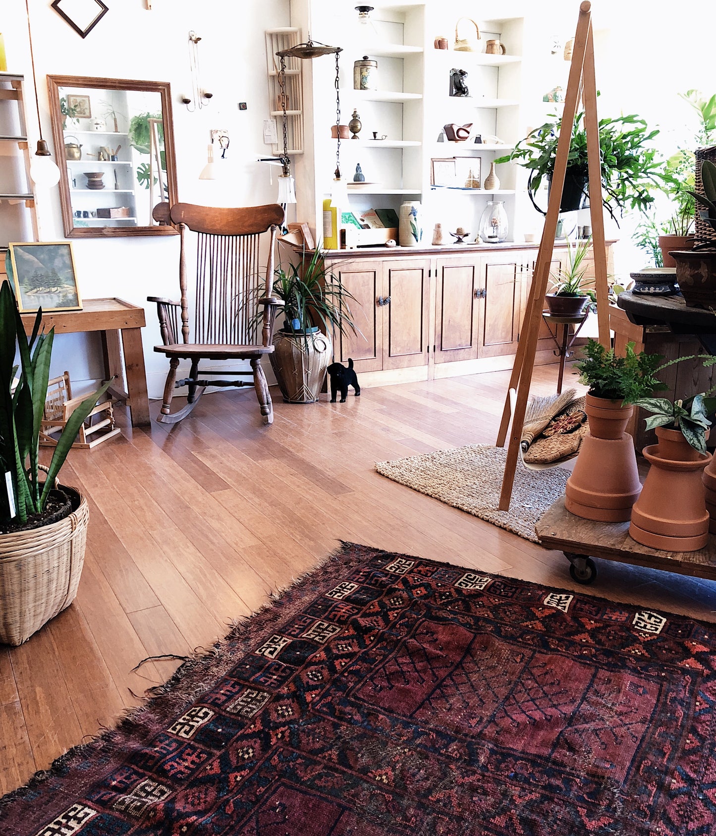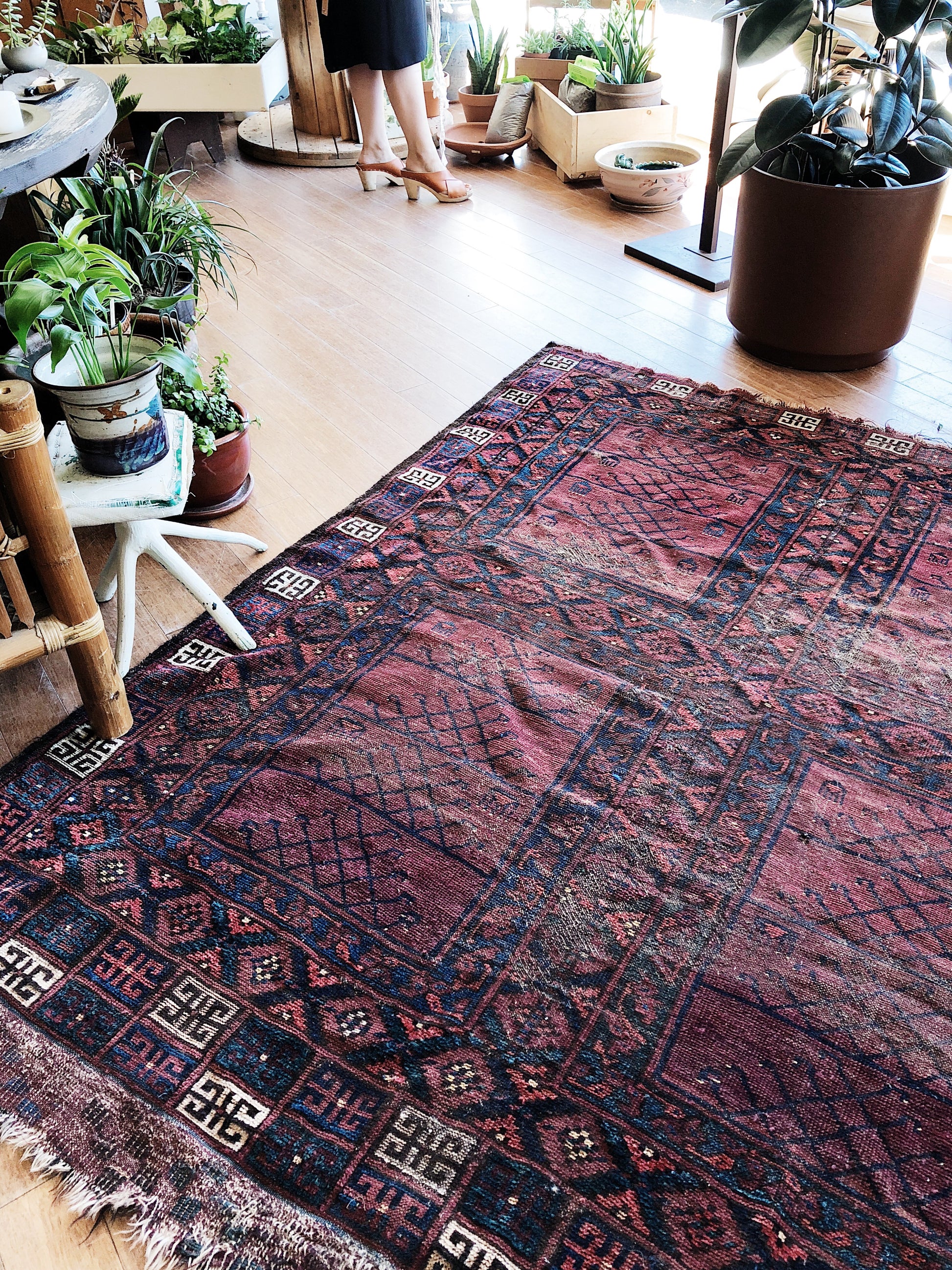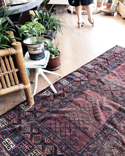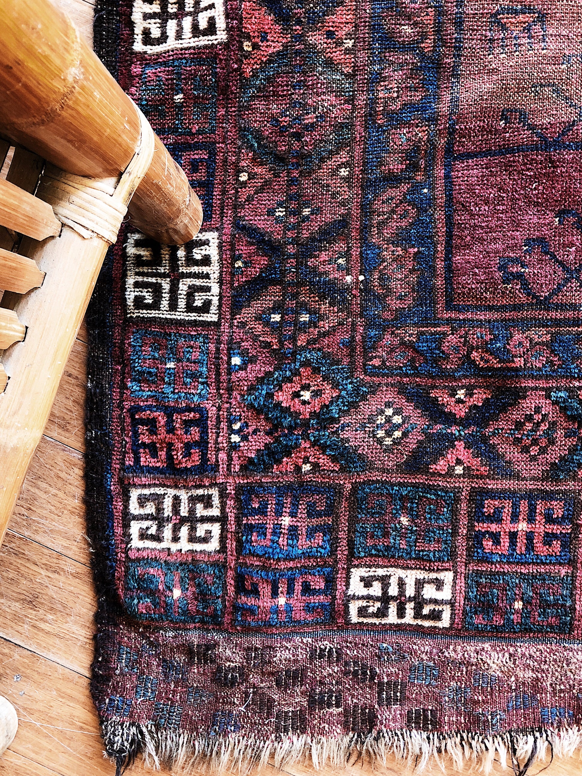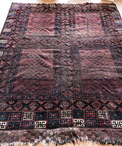 An old Turkish wool rug with just the right amount of fade and wear. A few small areas of threadbare. The best is that the dimensions are nearly square! A hard to find shape. Great graphic pattern