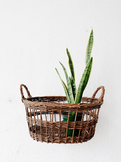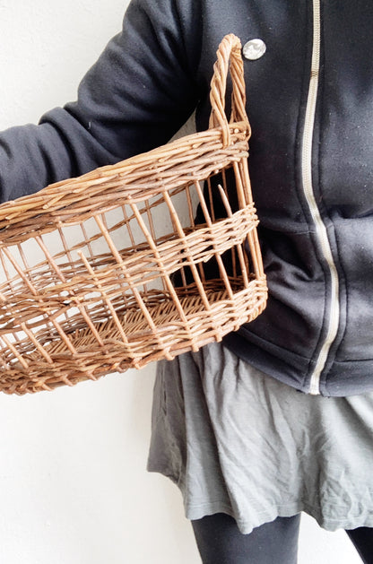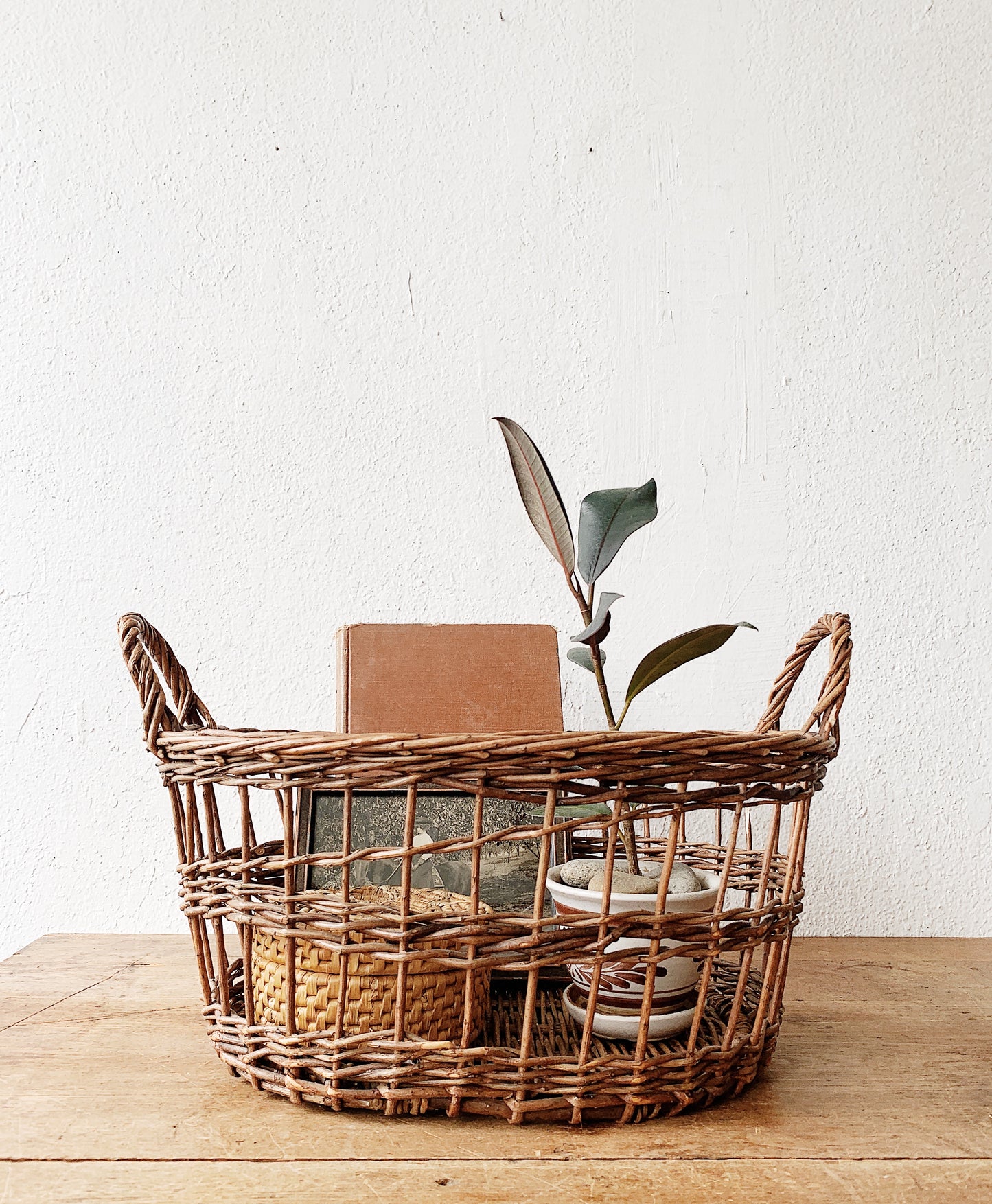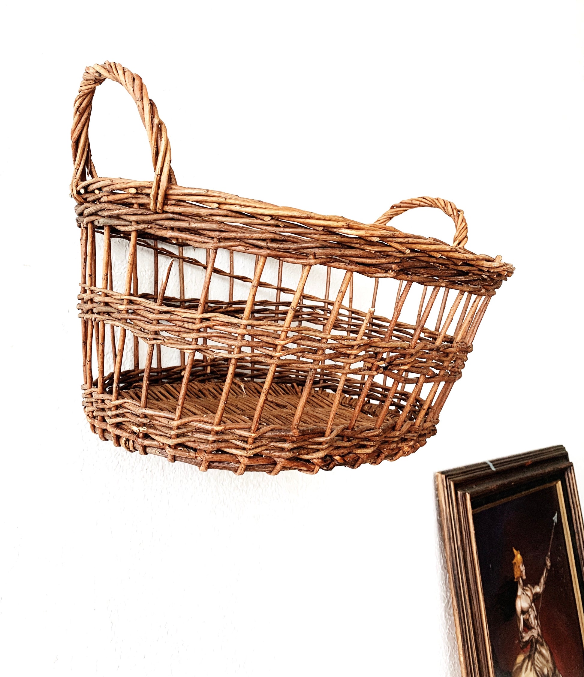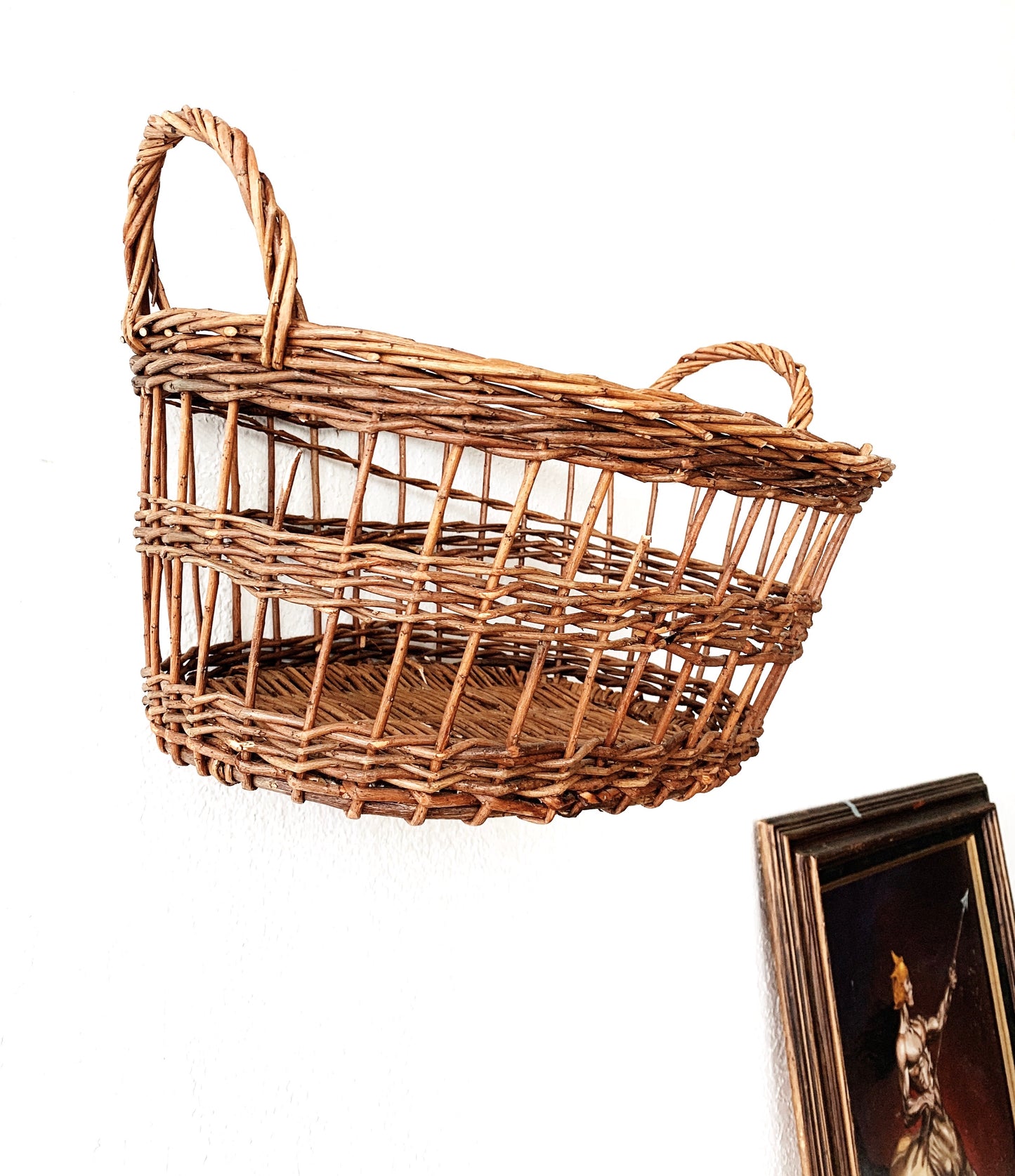 Wonderful open weave twig basket with handles. Solid bottom. A few breaks to the twigs but doesn’t affect it structurally. Nice looking and useful!