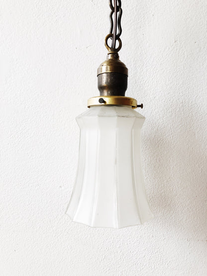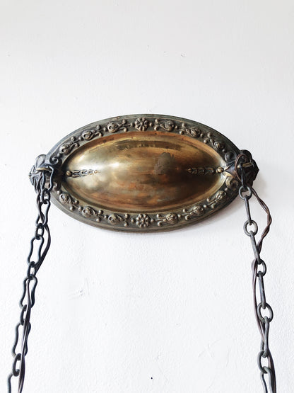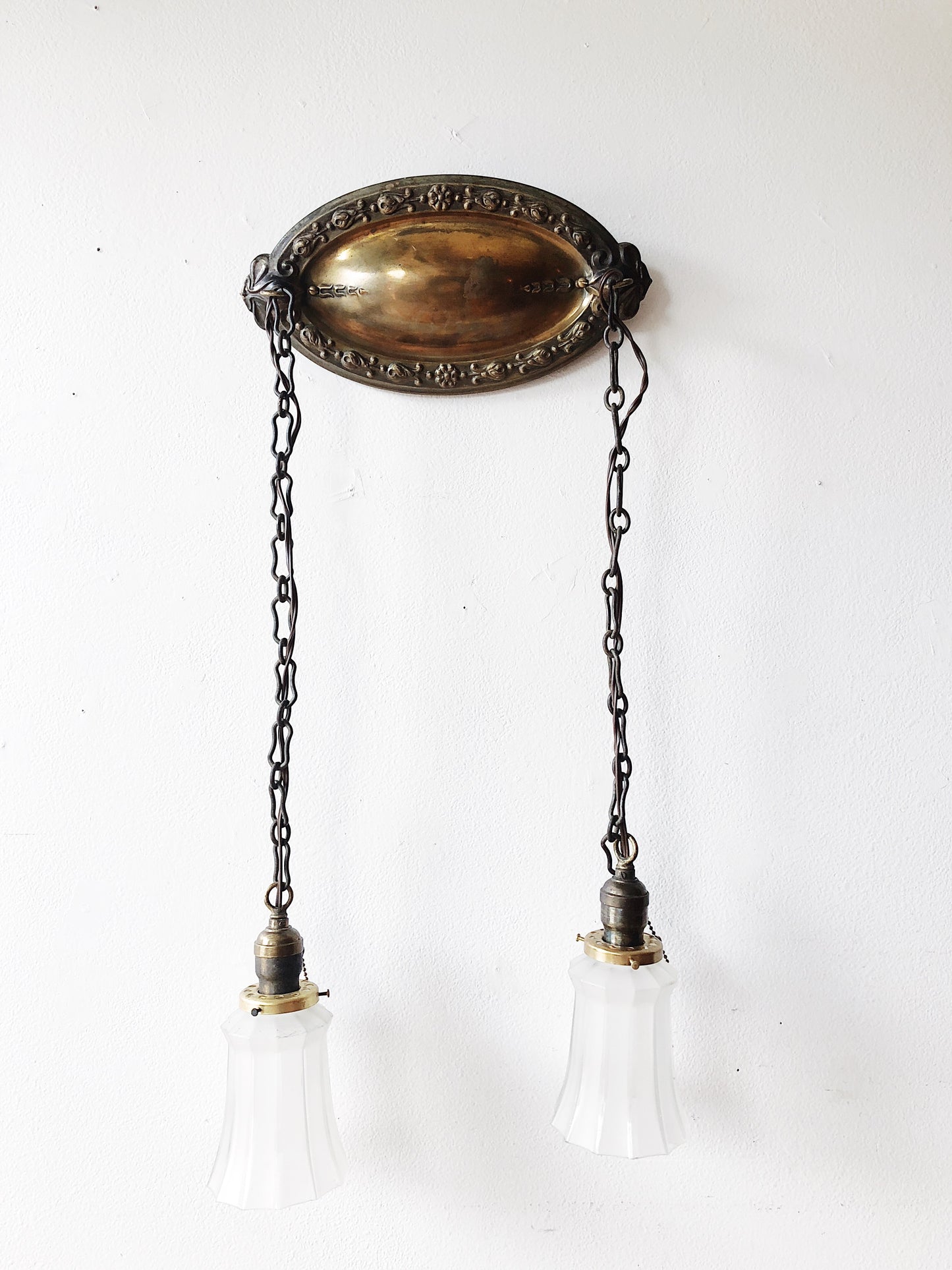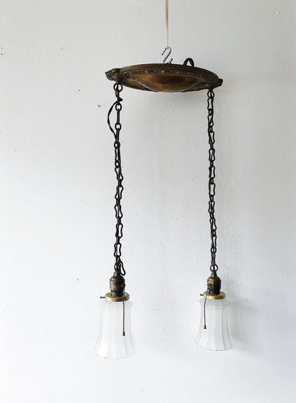 Antique Victorian brass and glass light fixture. We love these juxtaposed in more modern spaces. Embossed aged brass ceiling plate and chain hangers. Pull chains for each fixture. Hard wire installation.