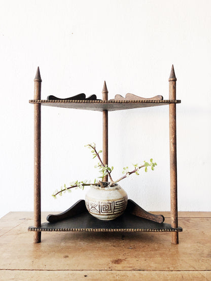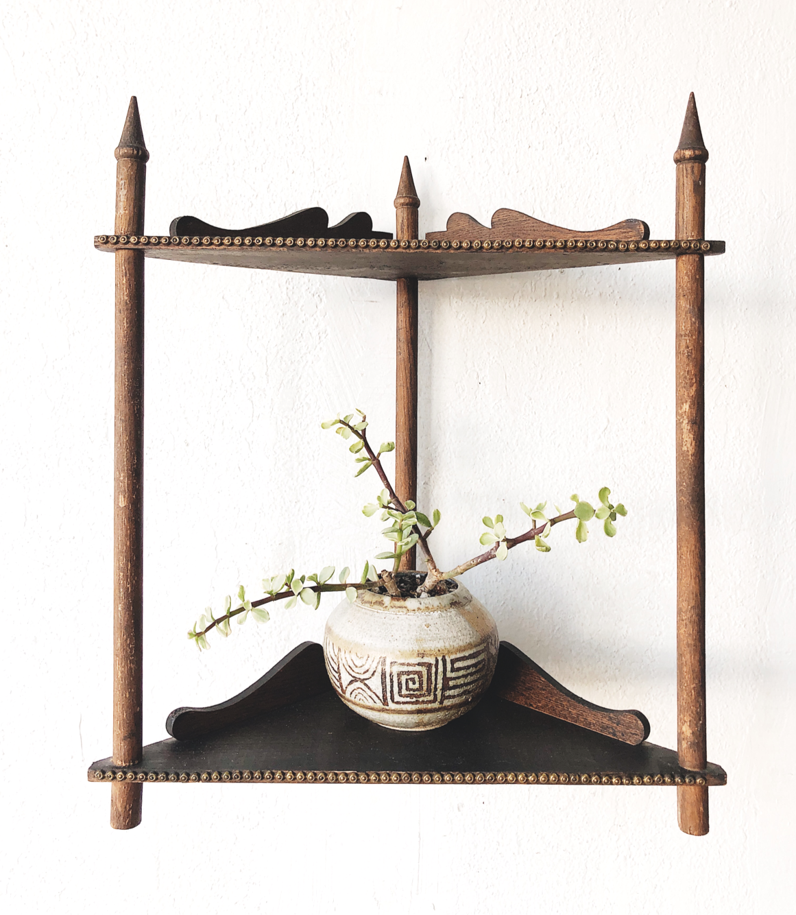 Fabulous victorian era corner shelf. The brass studded edges really make this for us. As well as those pointed dowels. Slightly Gothic and we love that