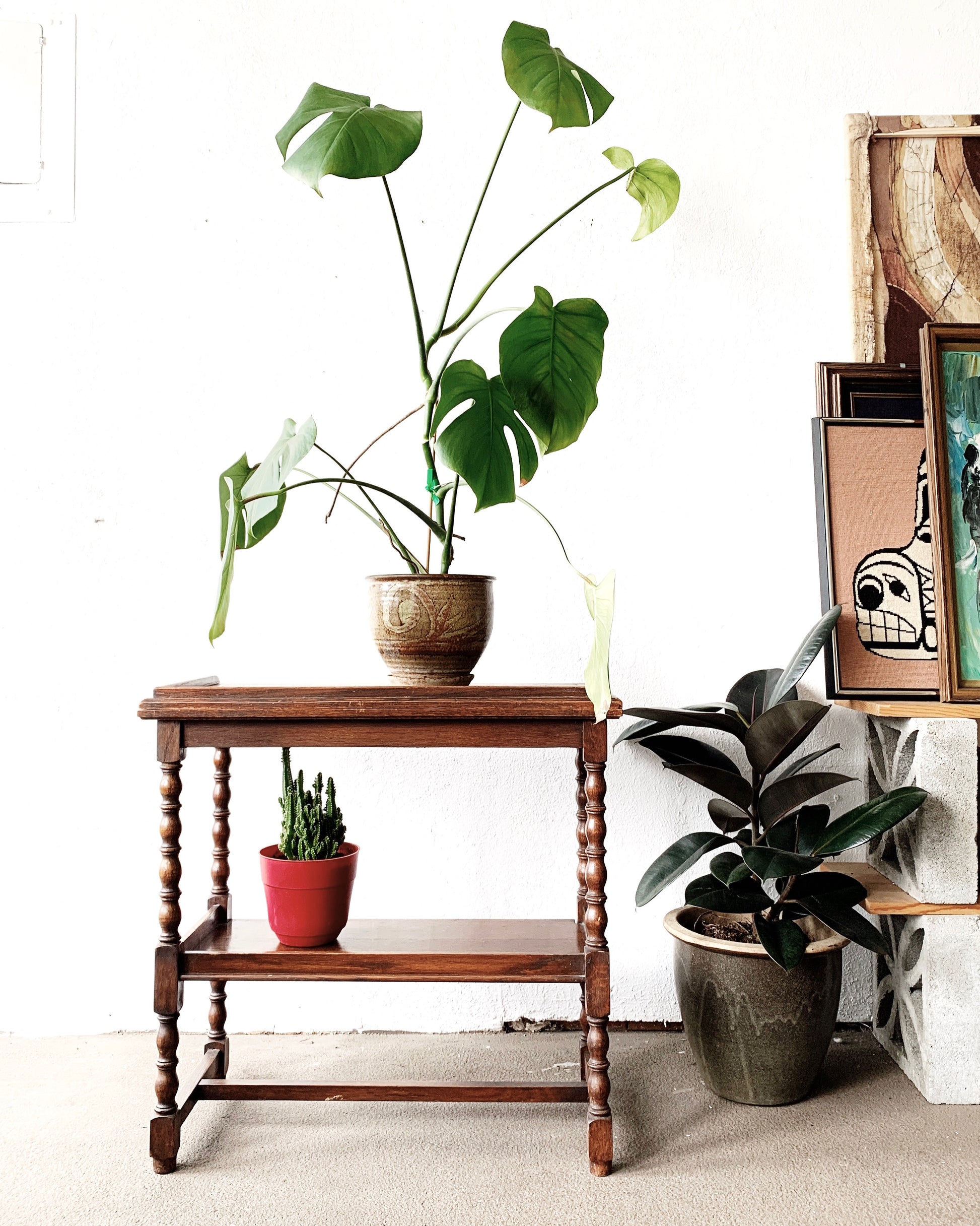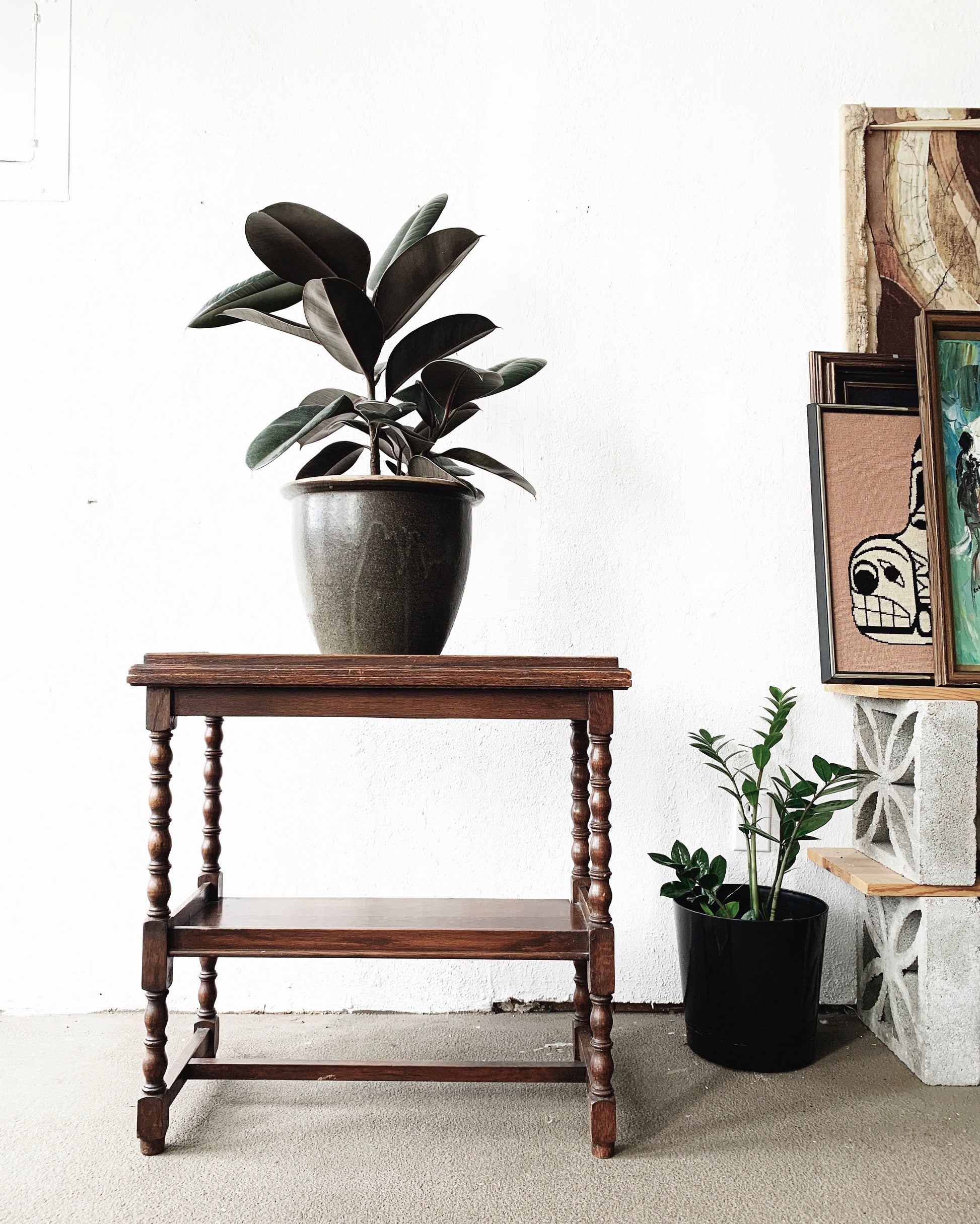 Antique walnut table with spindle legs and flip out top. This would make a great little bar. Or use as a plant table or side table. Great looking and sturdy. The flip top isn’t really usable flipped out. Works best as pictured.