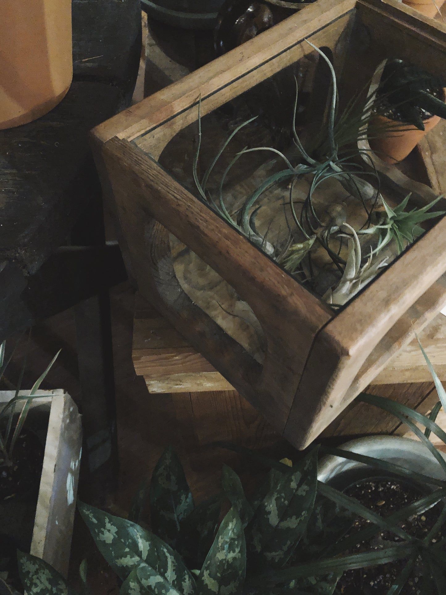 An old wood and glass terrarium or display box. Four sides of heavy glass and weathered wood. Lovely for plants or a favorite item