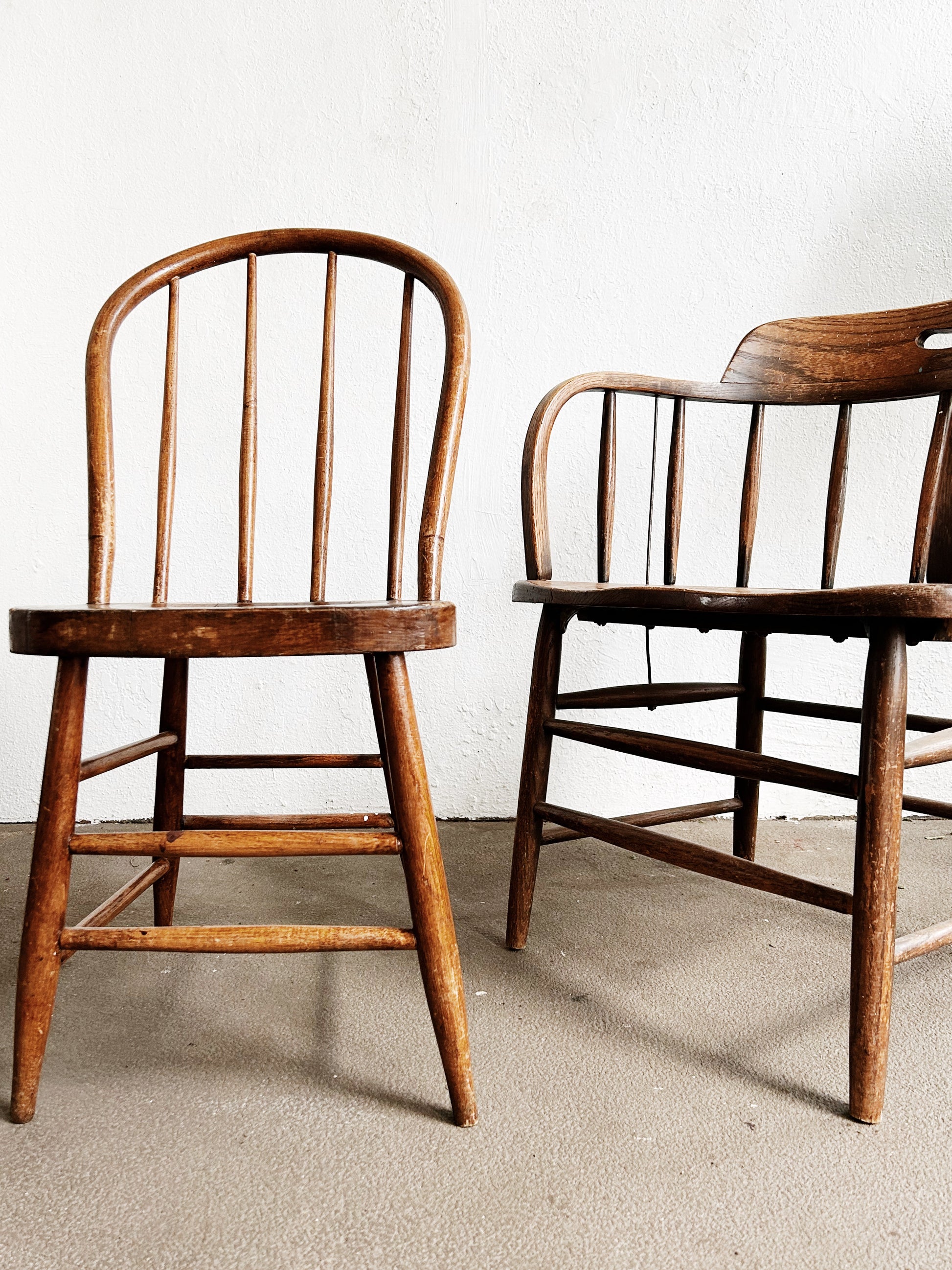 Two sturdy oldies. Primitive small scale Windsor side chair and a captains chair. Both are in nice shape with surface wear.