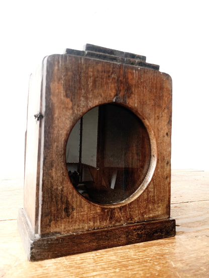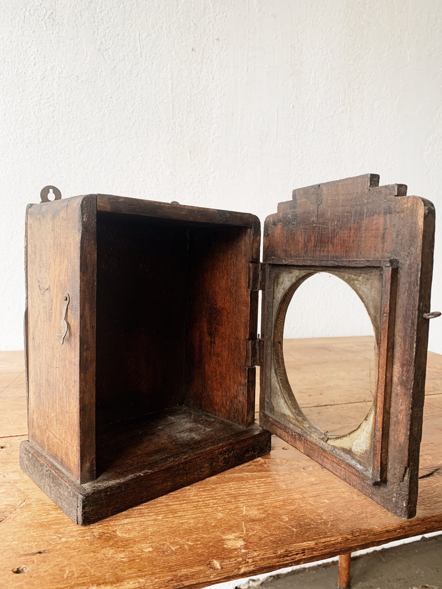 Wonderful, rustic wood curio cabinet with round glass panel and brass hangers and side latch. Such a good one! Makes a great little cabinet for apothecary, spices, or use as a curiosity cabinet/altar box.
