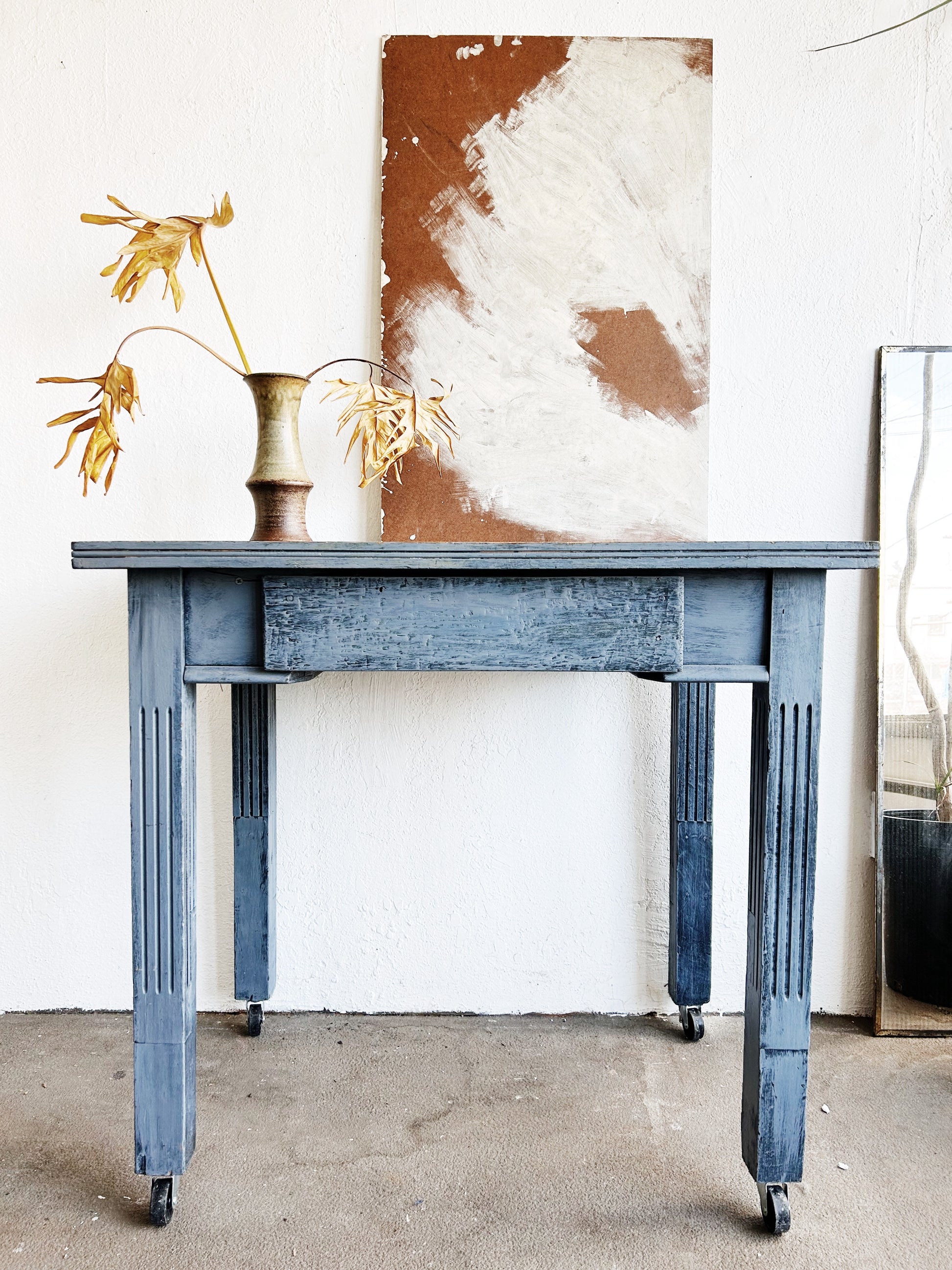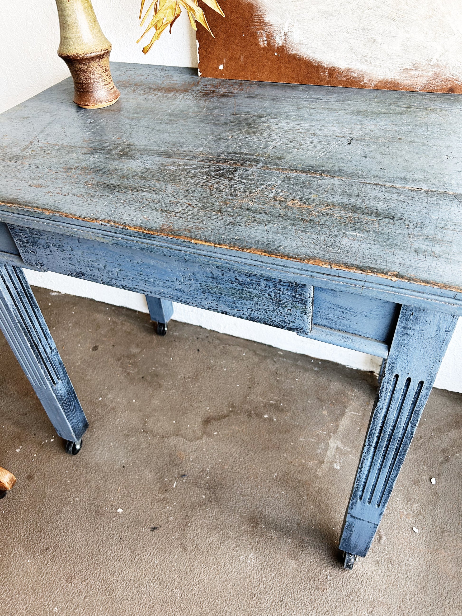 Antique wood desk on wheels. Painted a pretty shade of cadet blue. It has a hidden drawer and is sturdy!