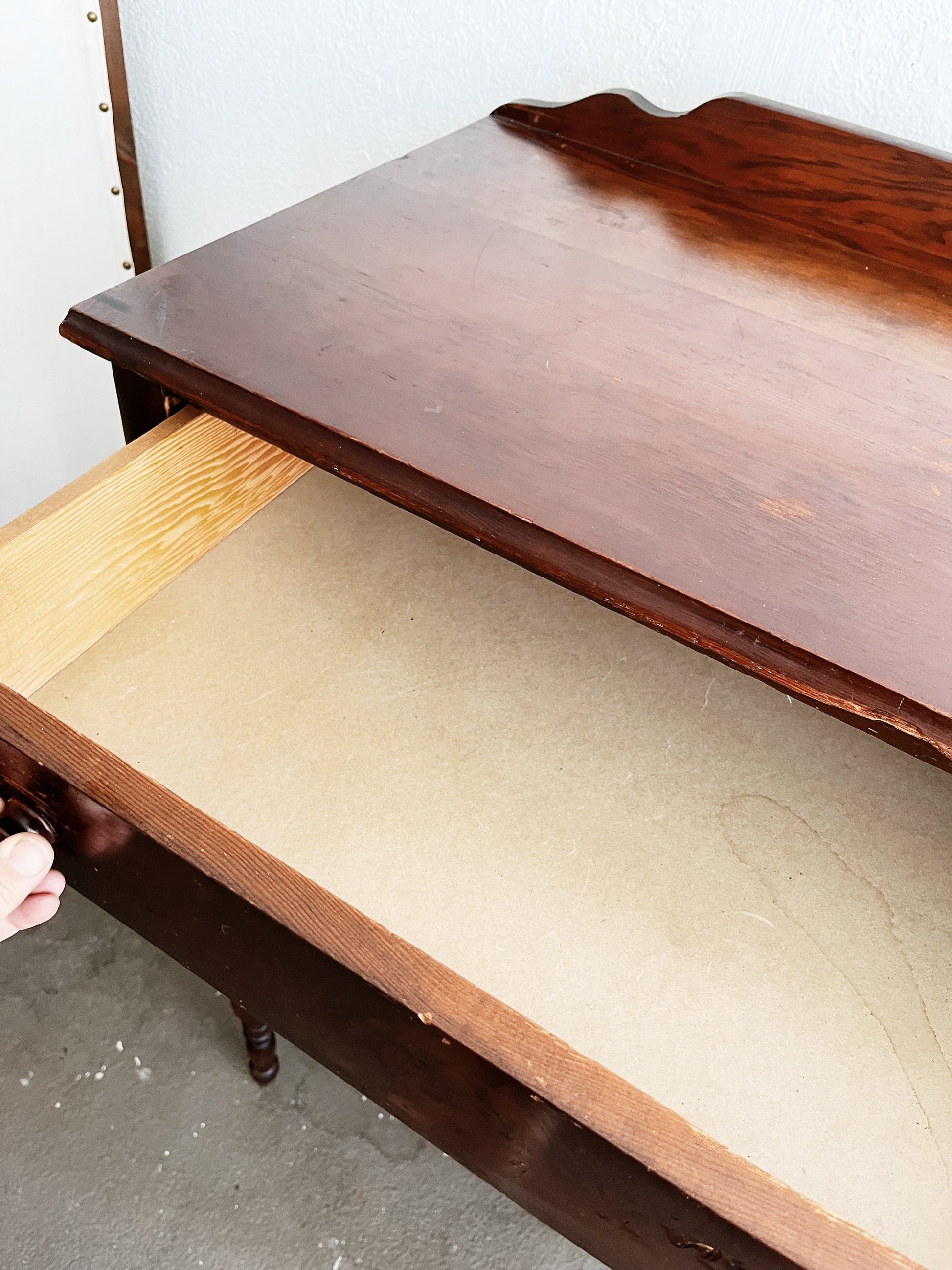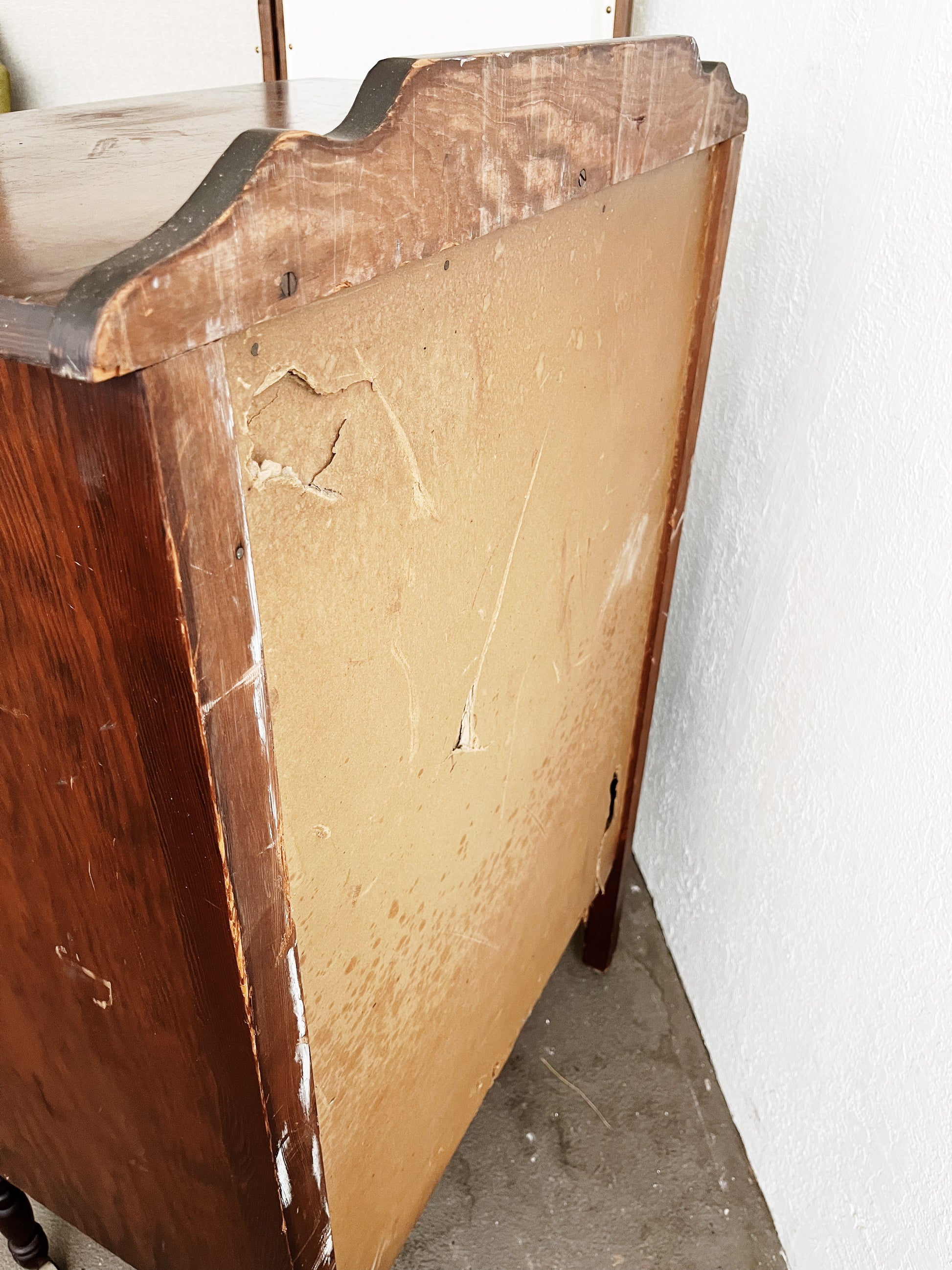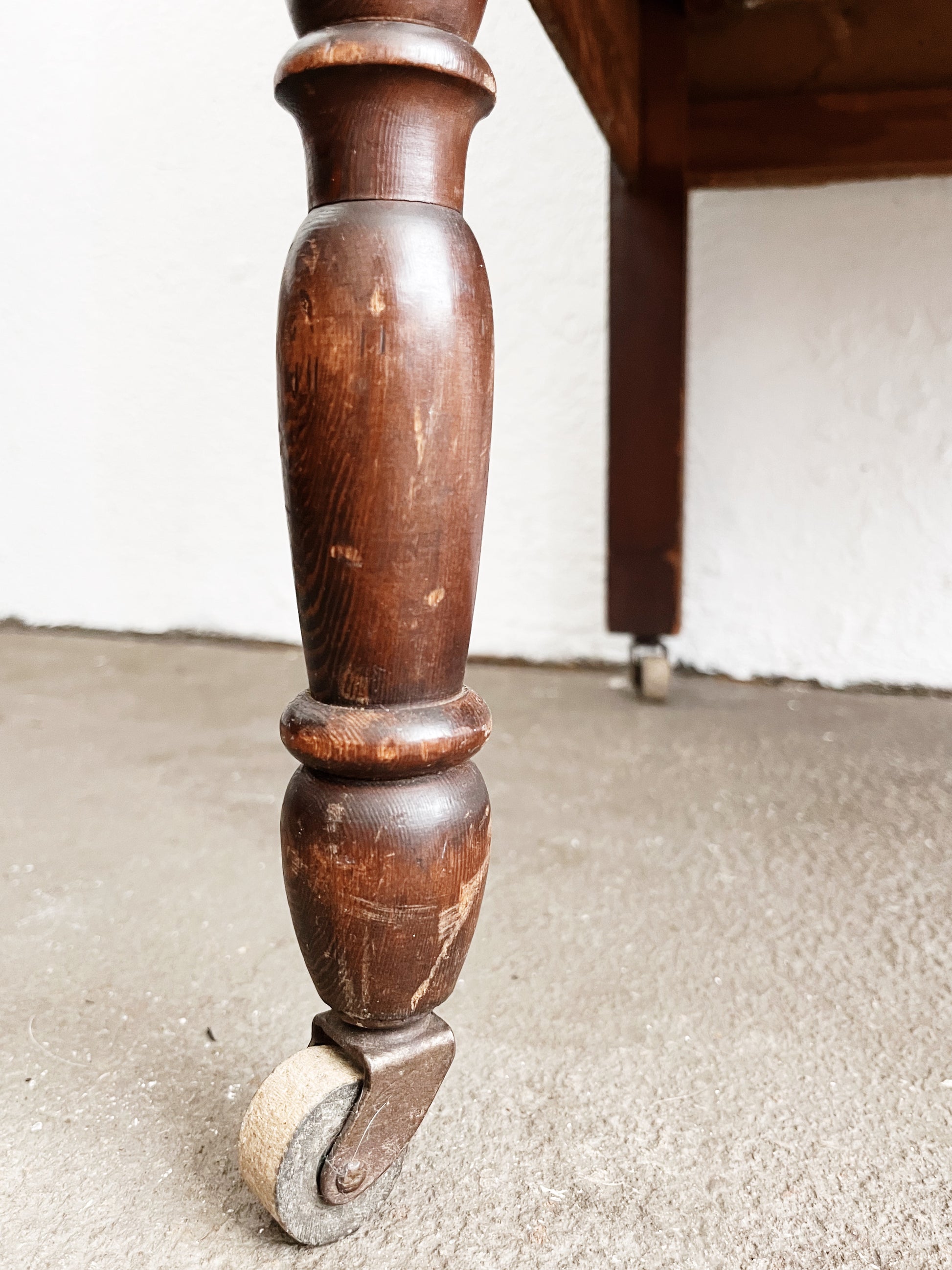 Lovely old tall dresser with four drawers. On little legs with wooden casters. Nice simple shape and a smaller footprint for small spaces. Some surface wear but nothing that detracts. Back fiberboard has some damage but is not seen when in use. Sturdy