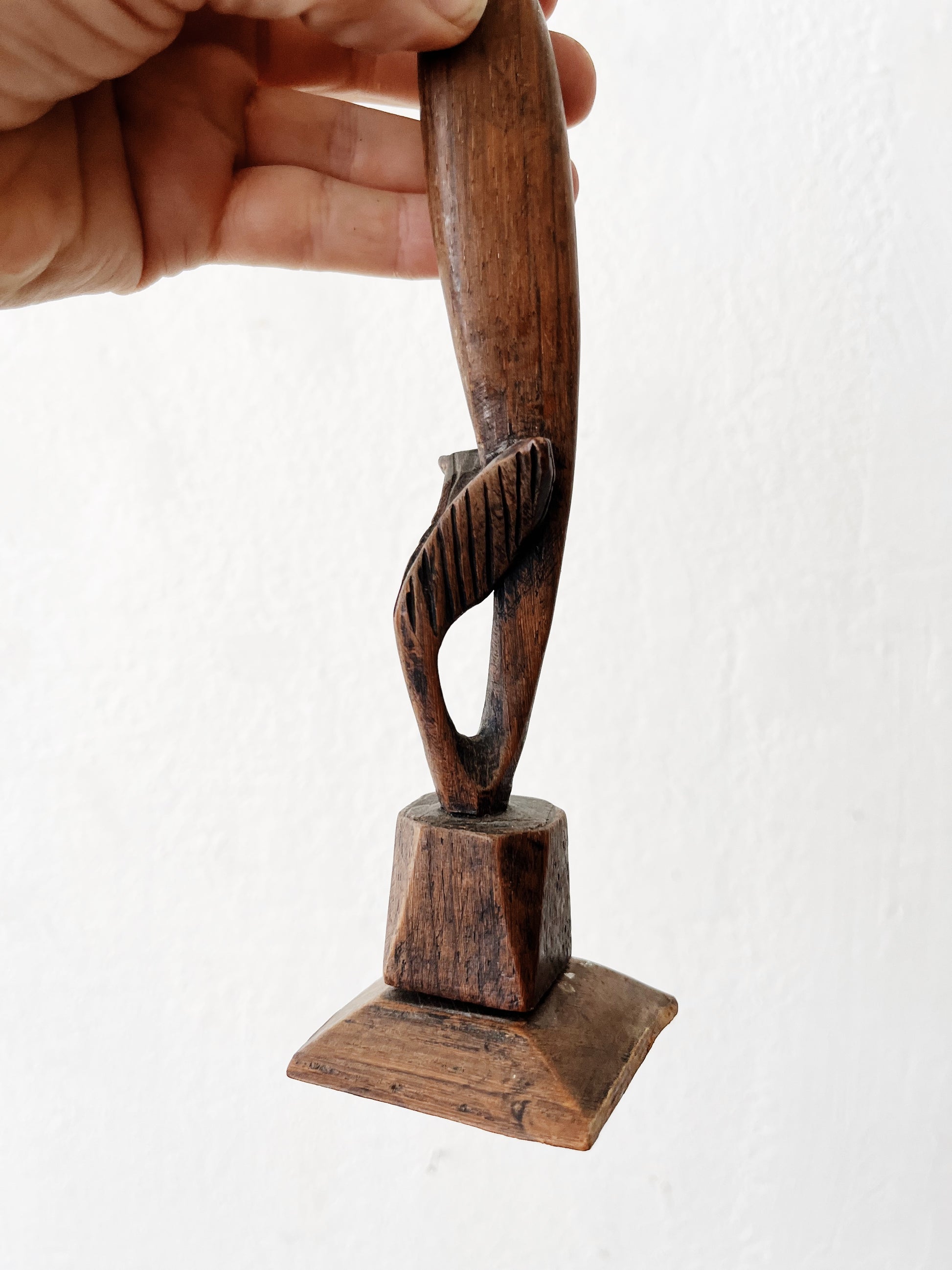 A special piece…old delicately carved wood mermaid sculpture. Hooked hands, a sweep of hair, and a faceted base are some of the finer details.