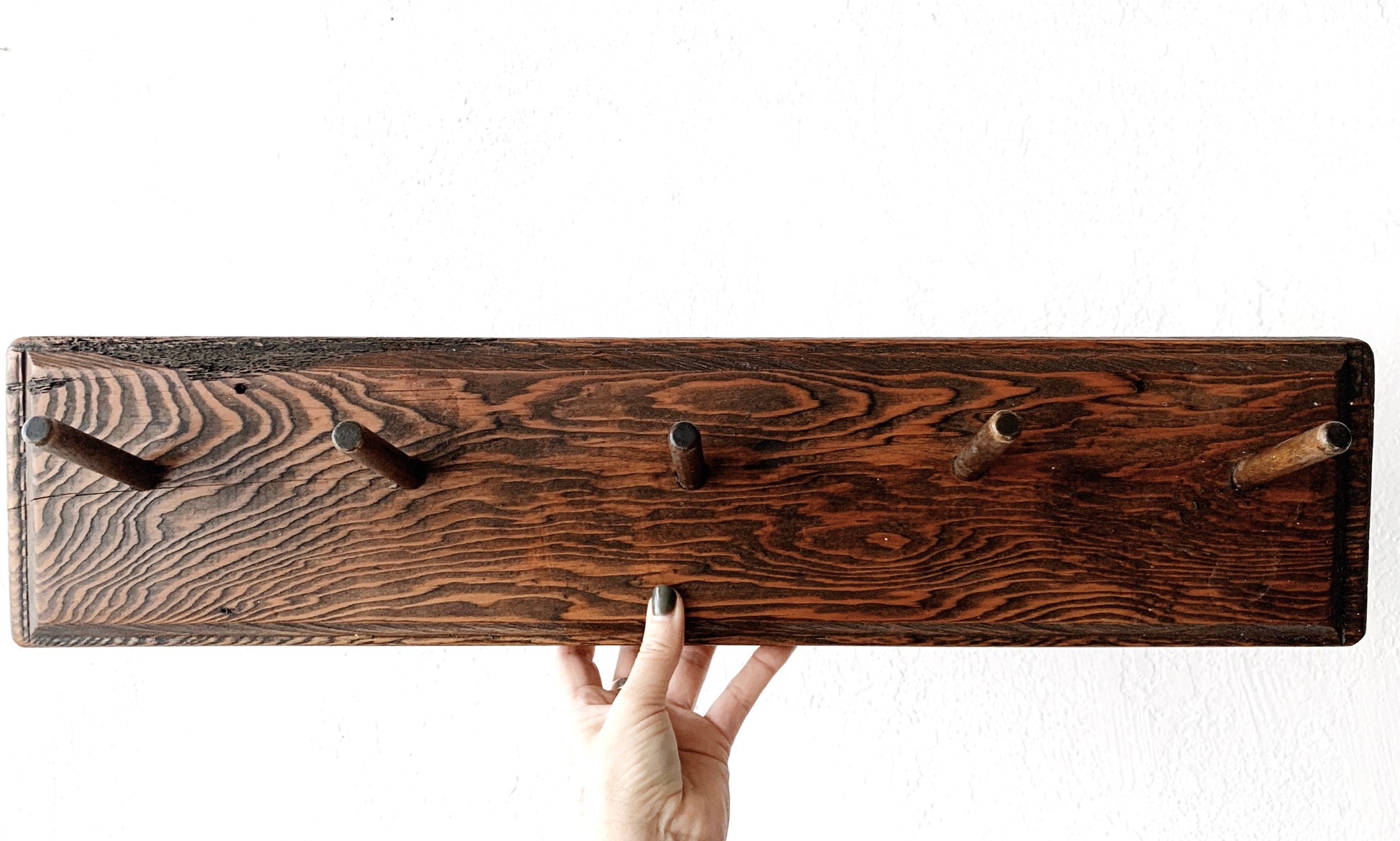 A beautifully hand made solid wood peg rack. Five 3.5” pegs, sturdy! This is strong enough to hold winter coats, scarves, hats etc. A really nice one.