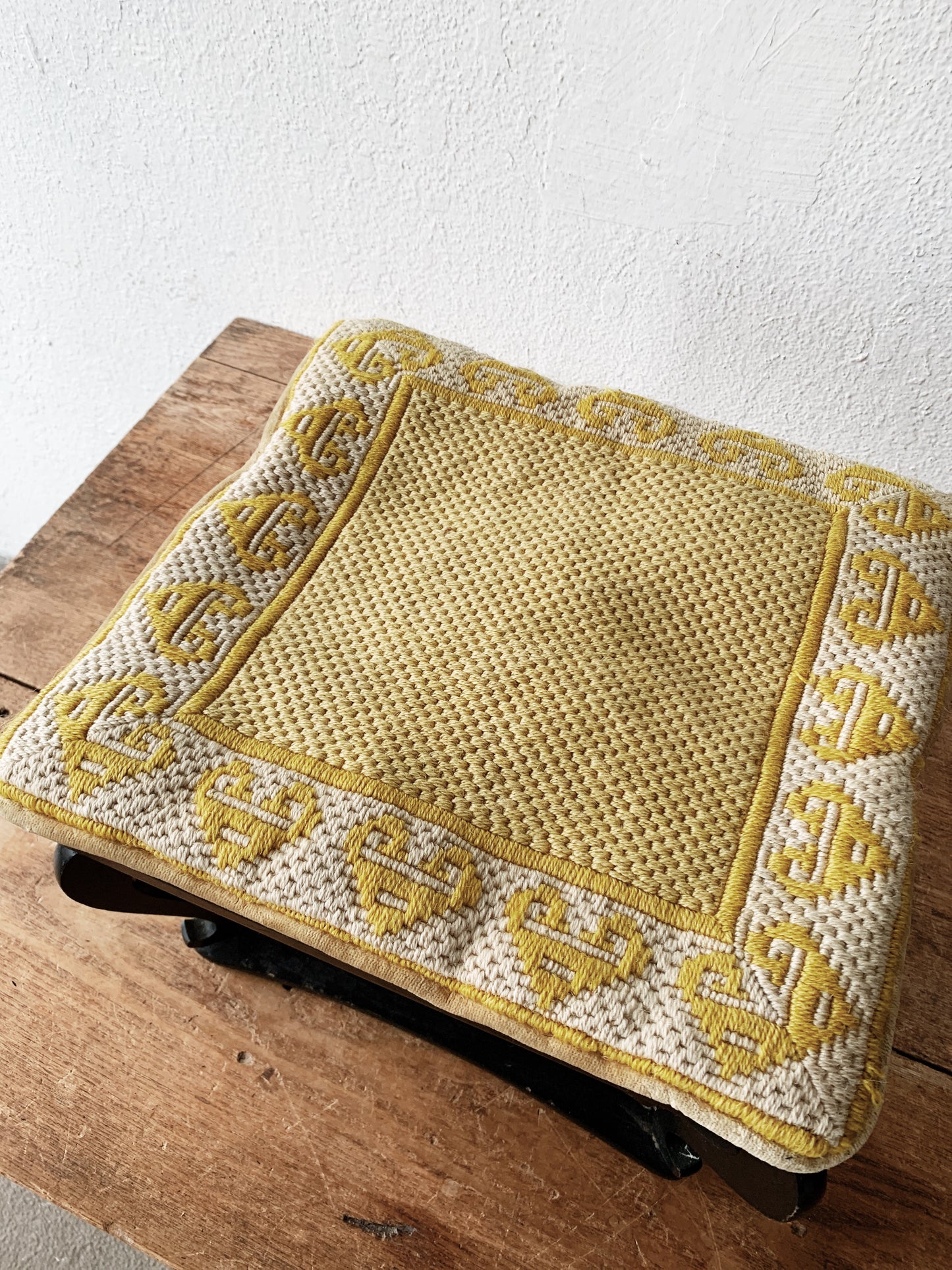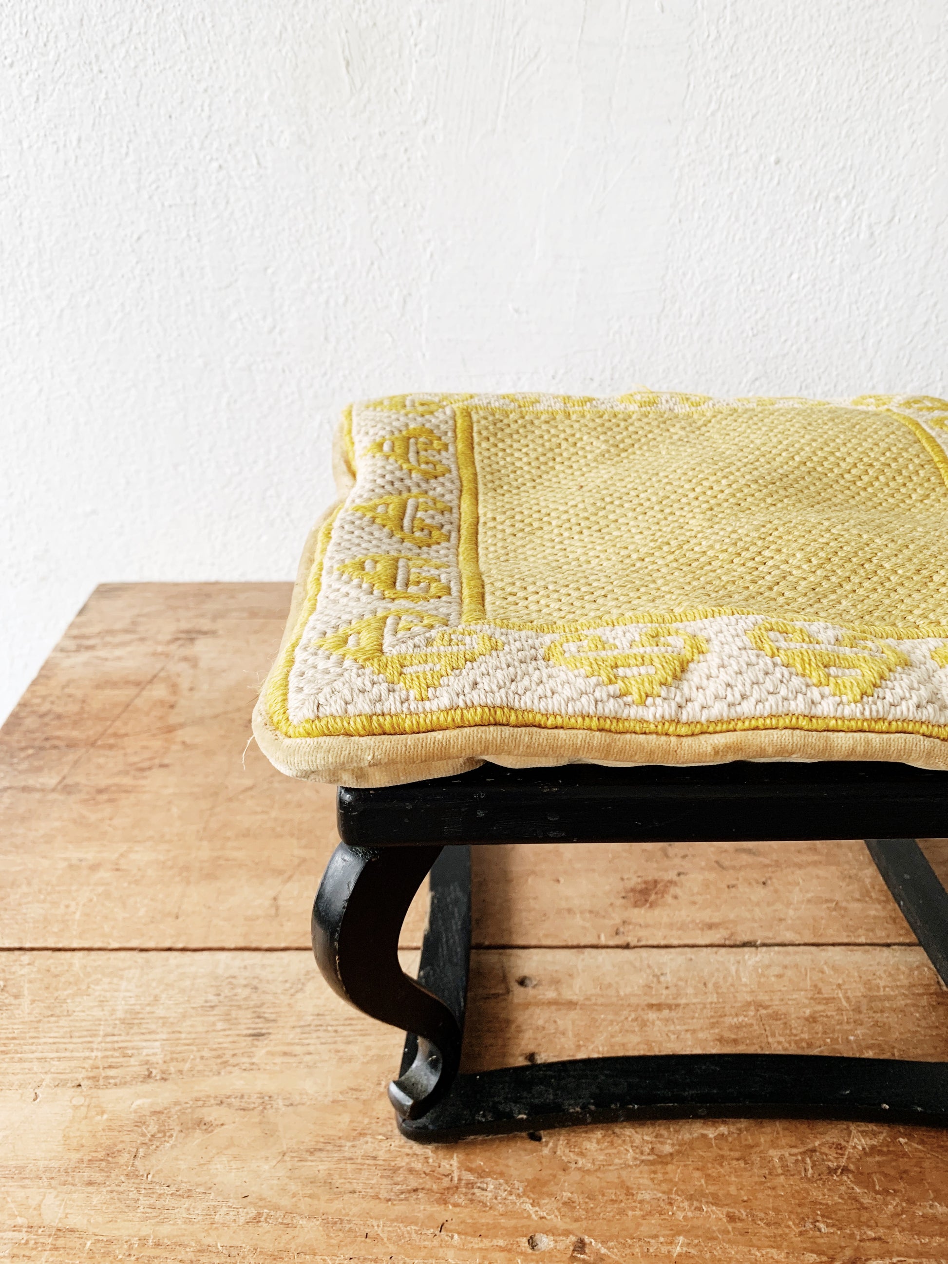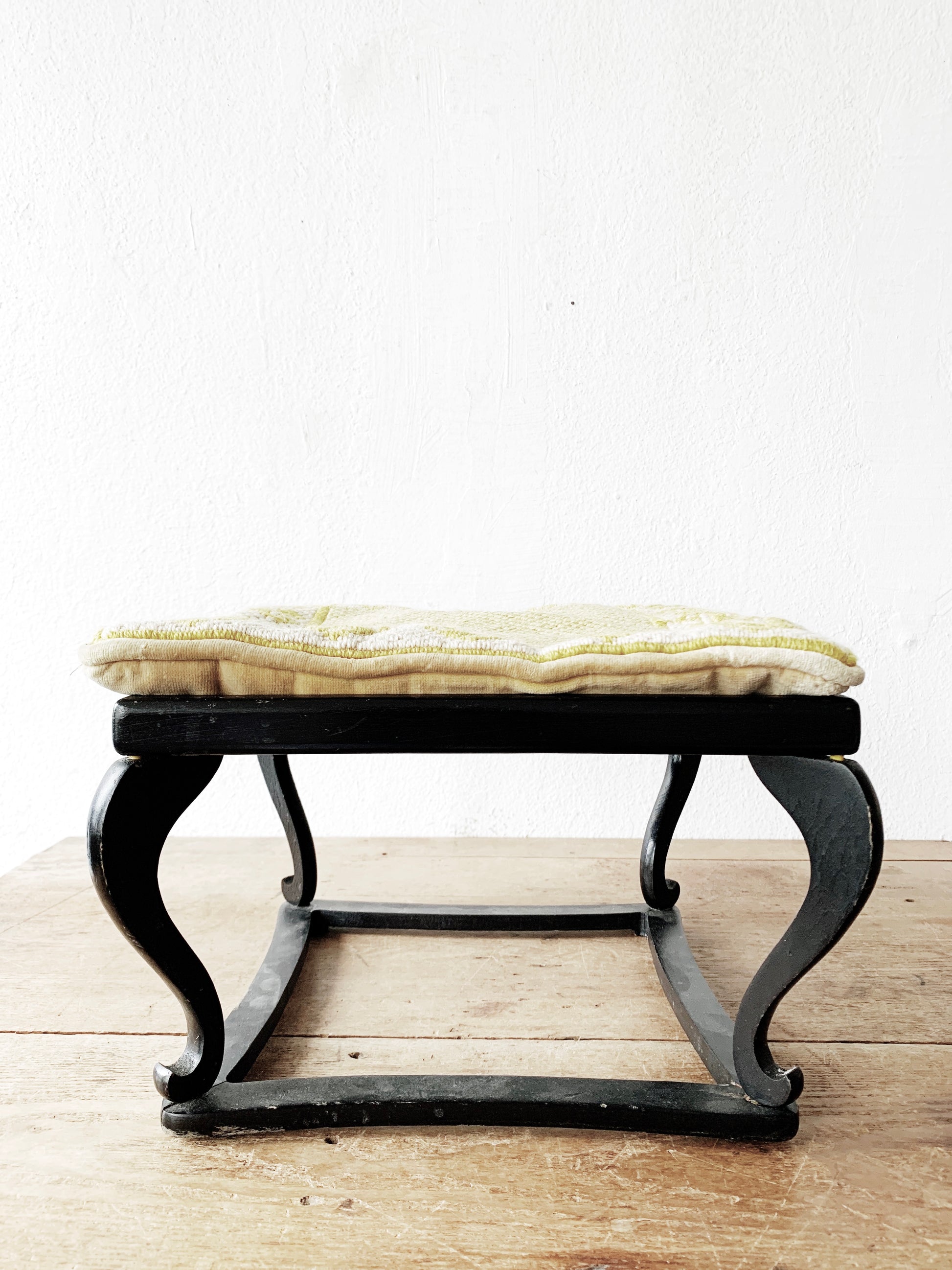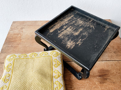 Wonderful wood Japanese stool with needlepoint cushion. Both are oldies and not perfect, but work well and look beautiful. The stool can be used as a table or tea tray as well. Not intended for sitting on.