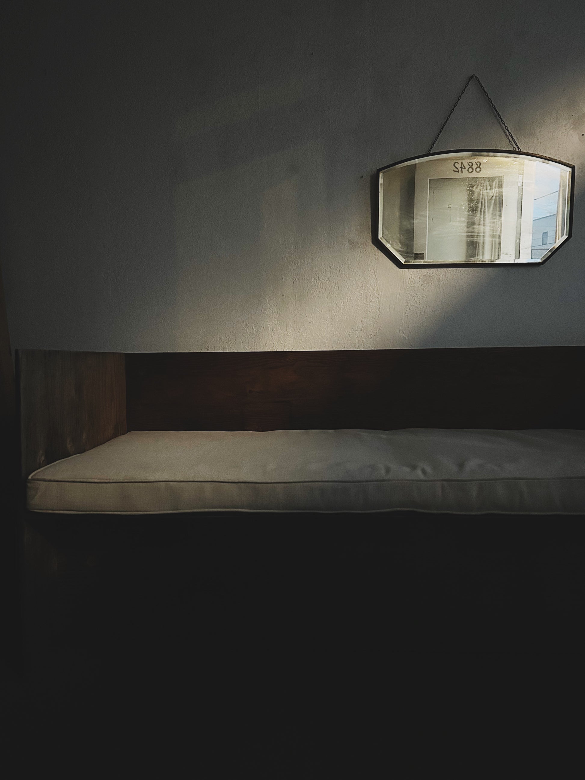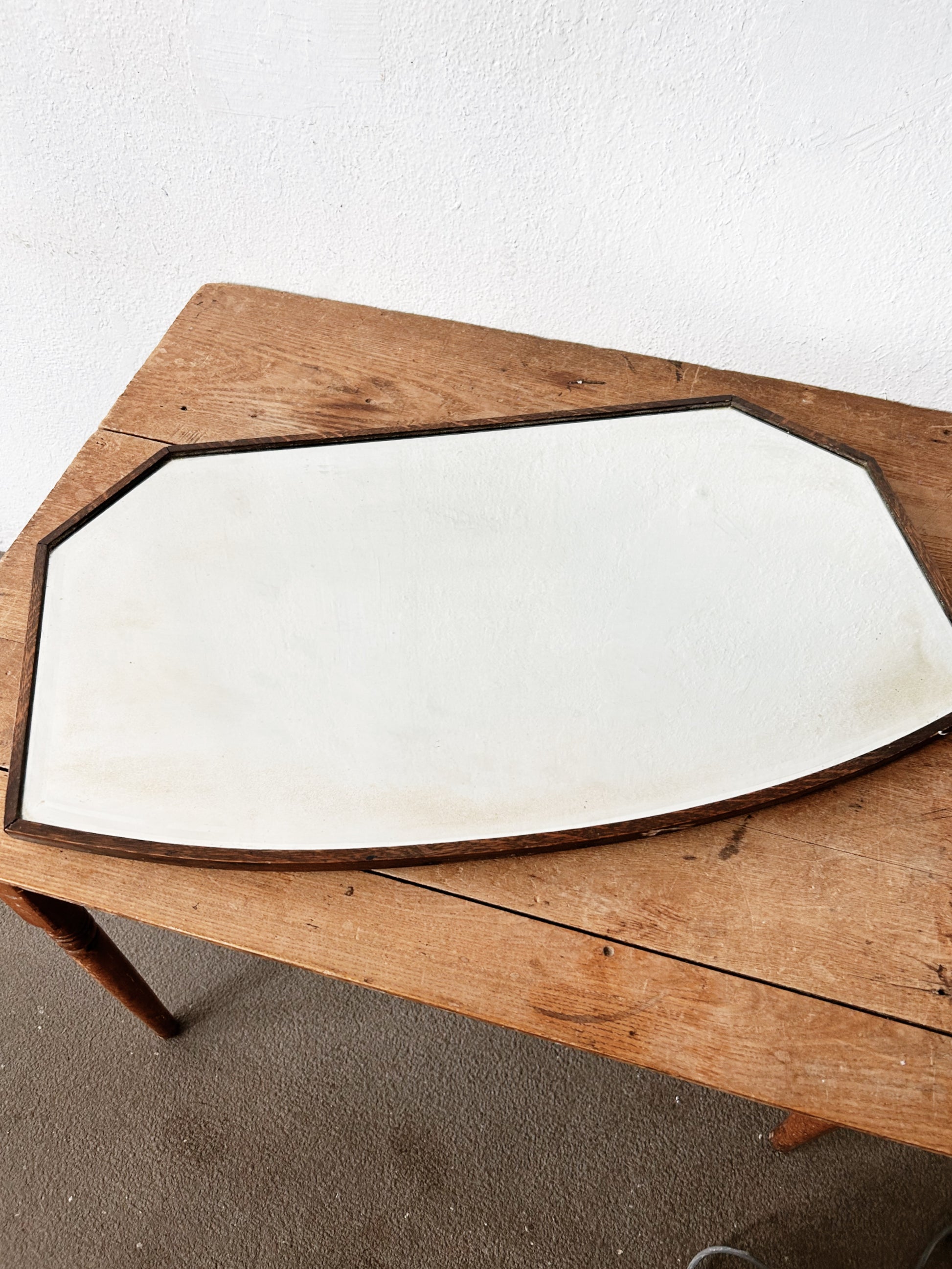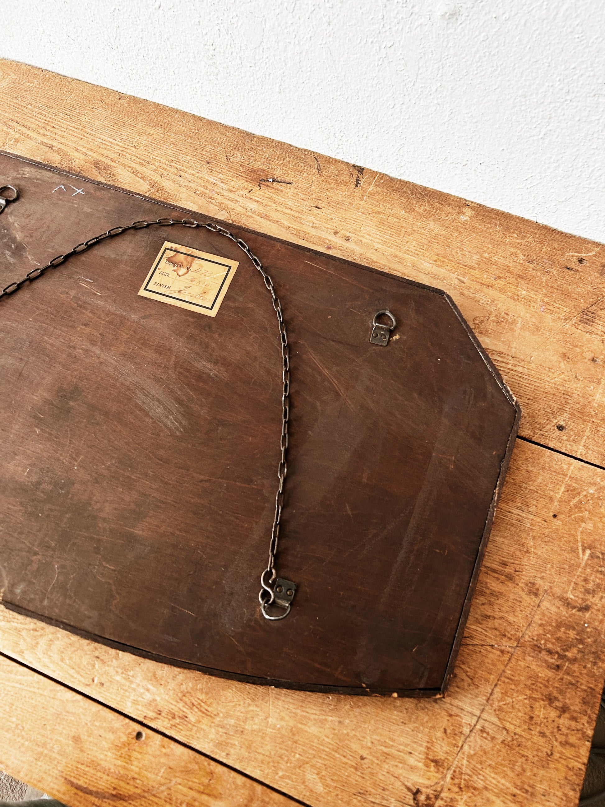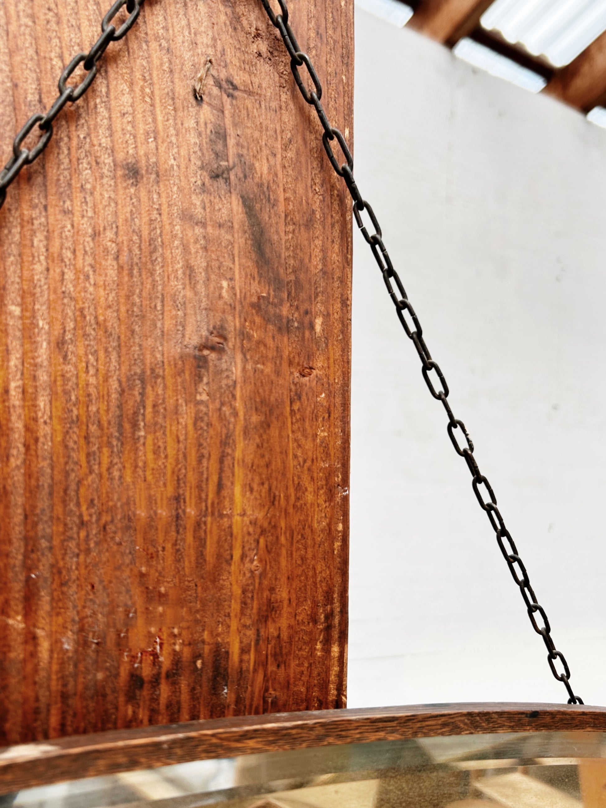 Stunning mirror from the early 1900s. Beveled glass is surrounded by a thin wood frame. Old chain is adjustable. This trapezoidal shape can hang either direction depending on taste. Glass is perfectly sepia clouded but not too much that you can't see.