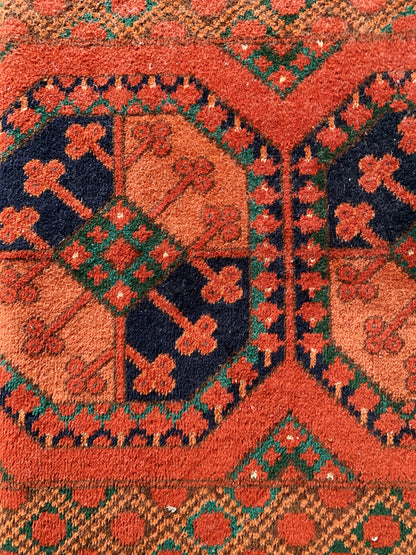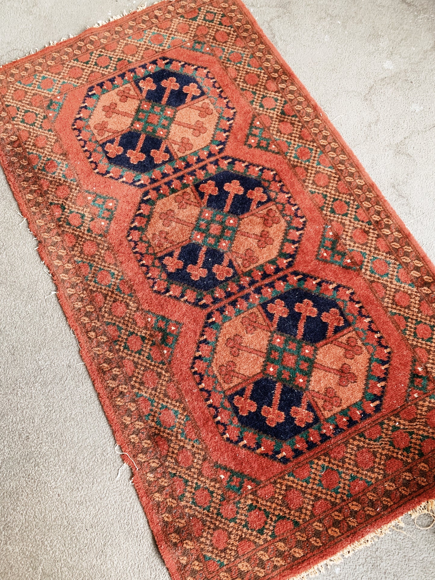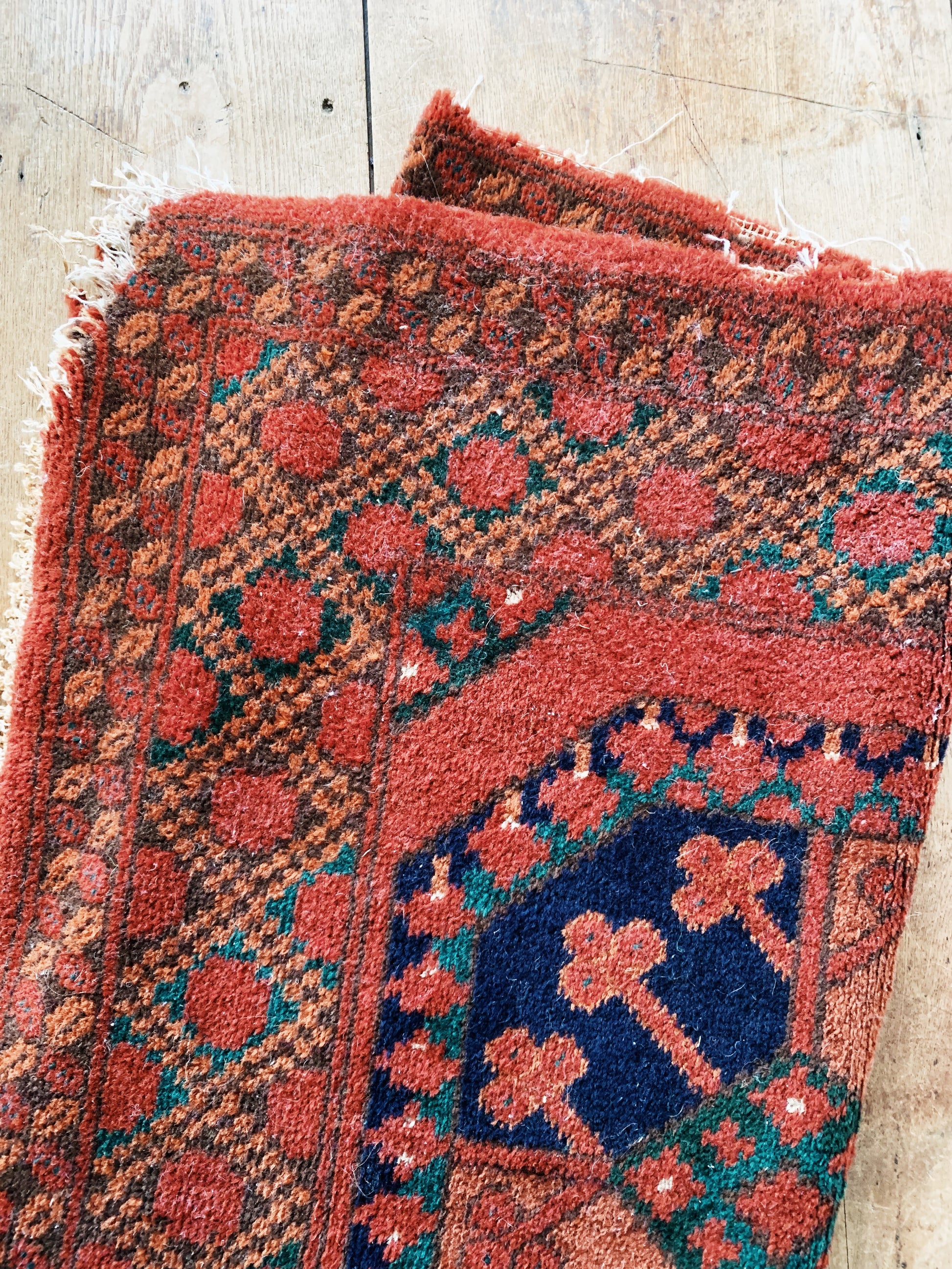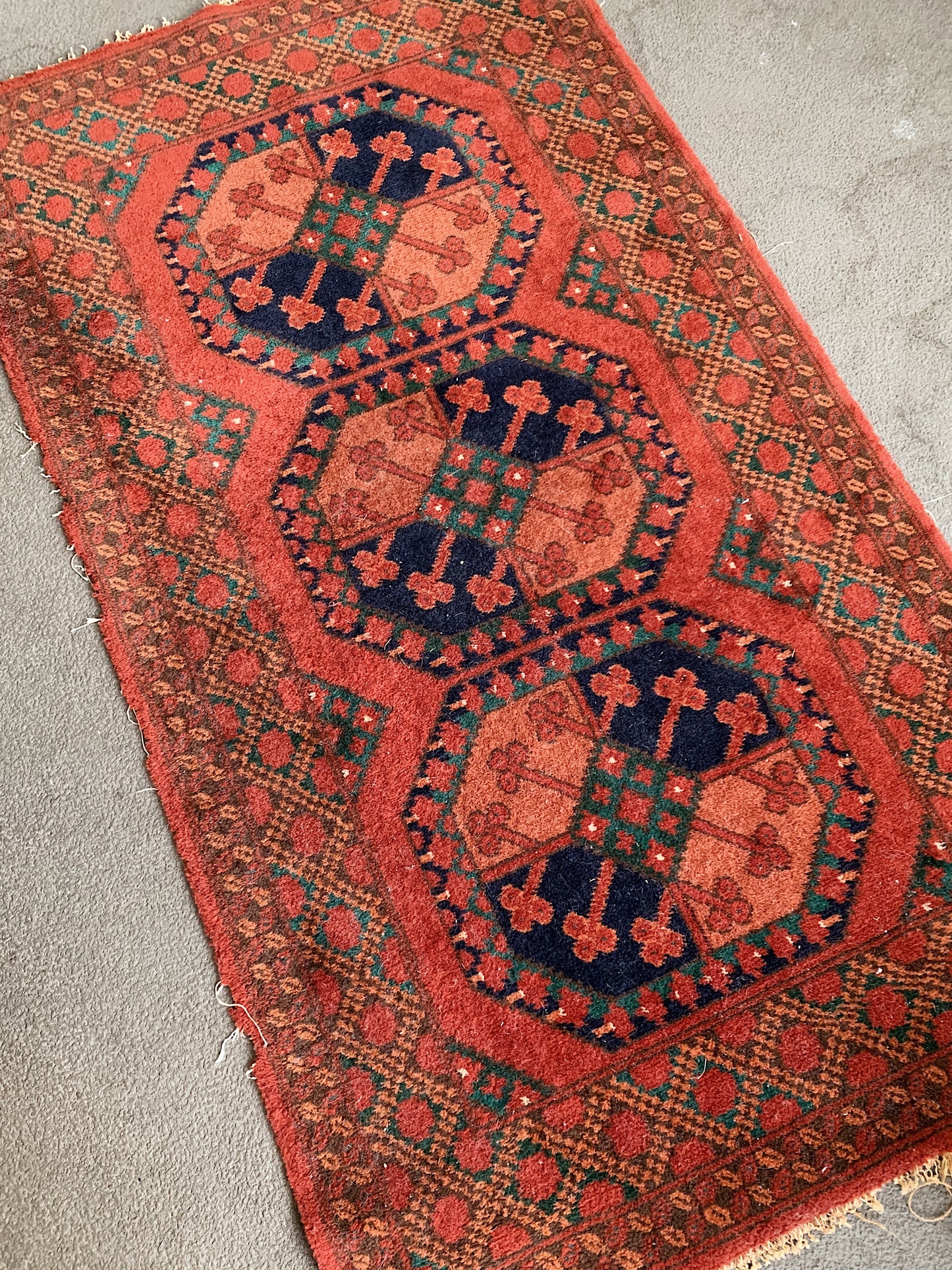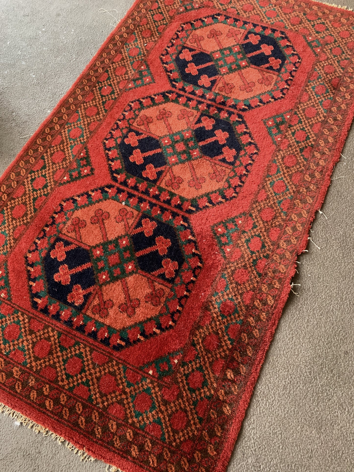 Gorgeous antique wool rug with rich coloring and geometric/ medallion patterning. Frayed edges and discoloration in a few areas. Priced accordingly, still beautiful!